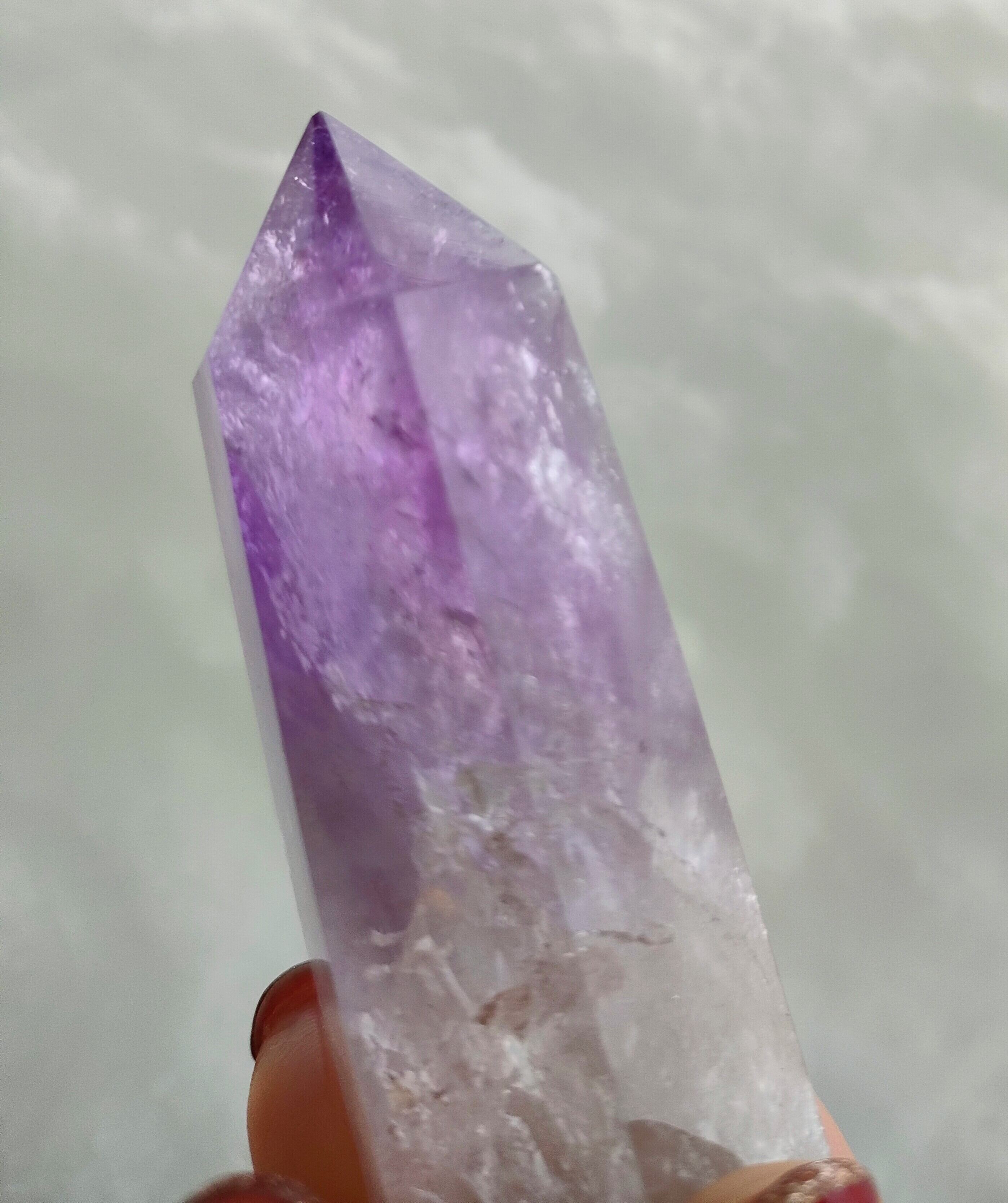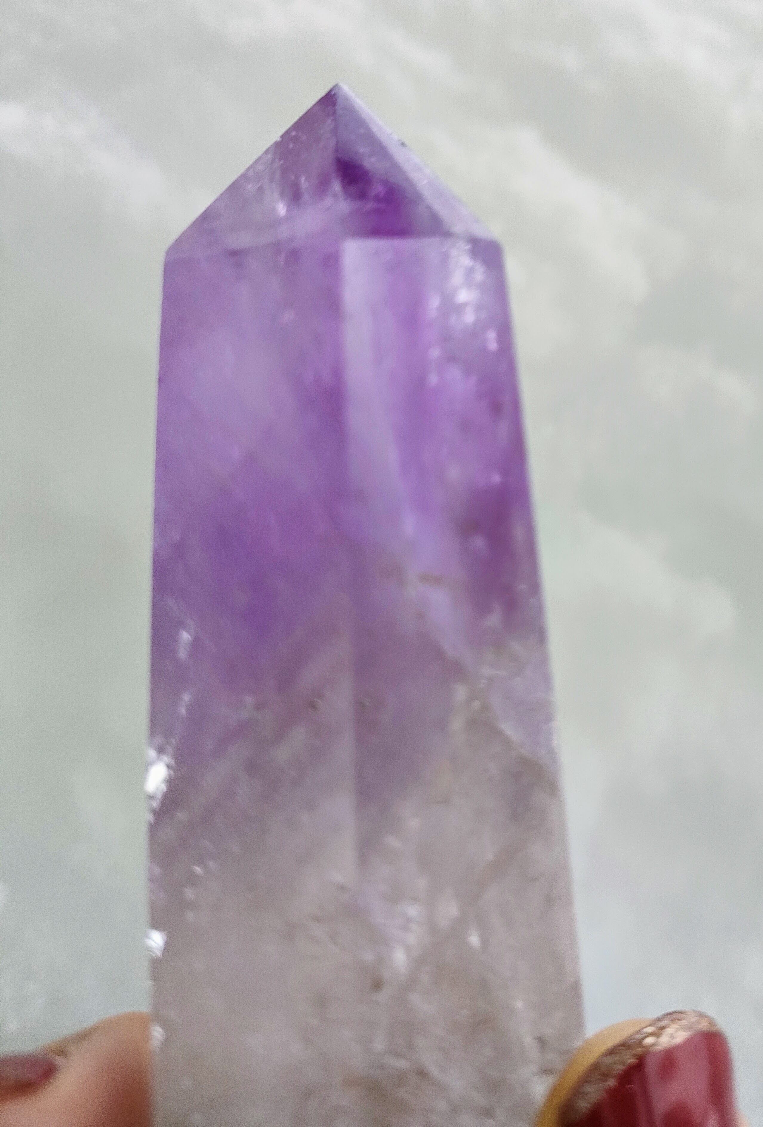 透明度が高く内部の輝きがとても美しいアメジストタワーです。バイカラー、ファントム、虹もみられる大変美麗なお品です。