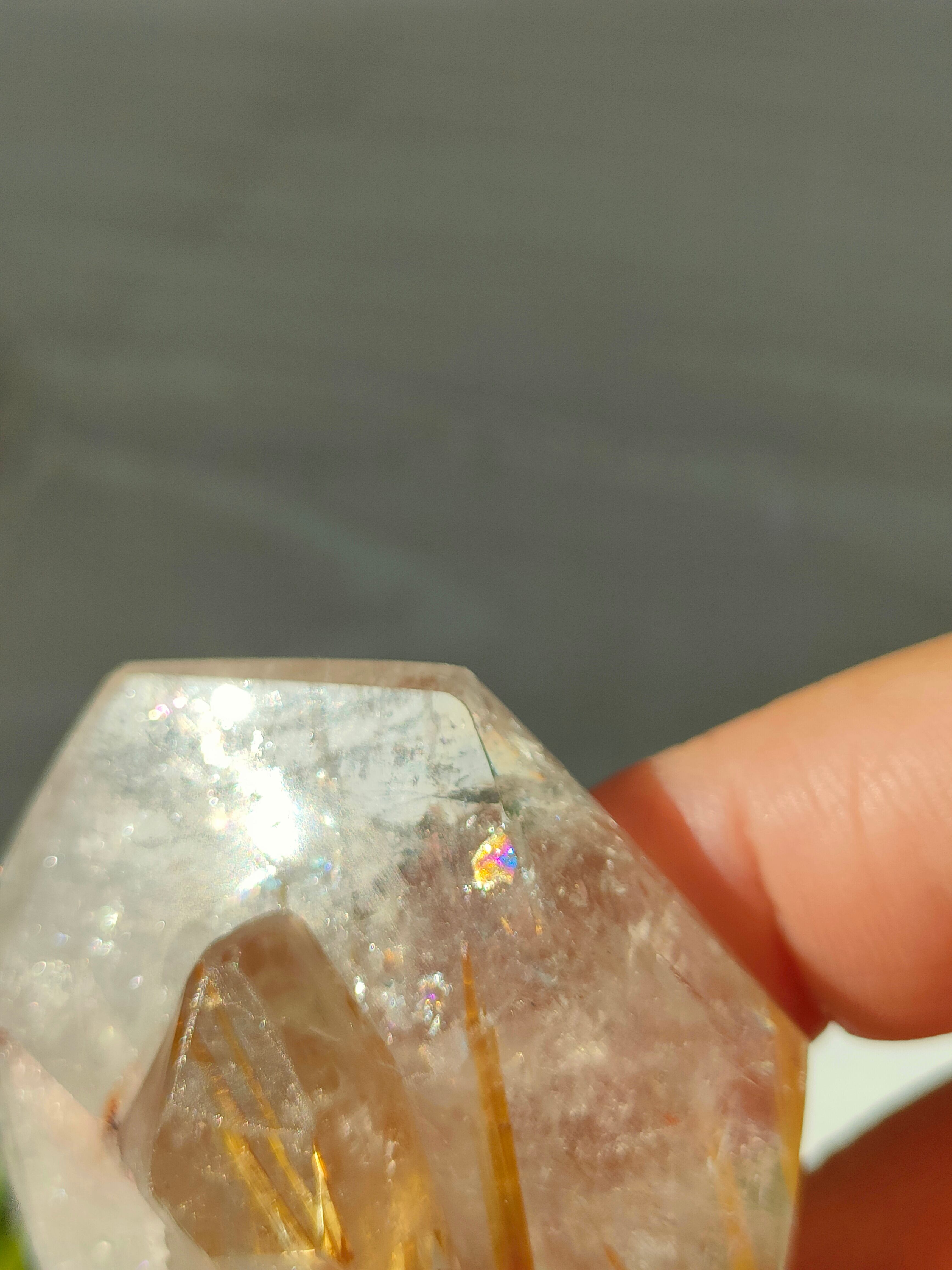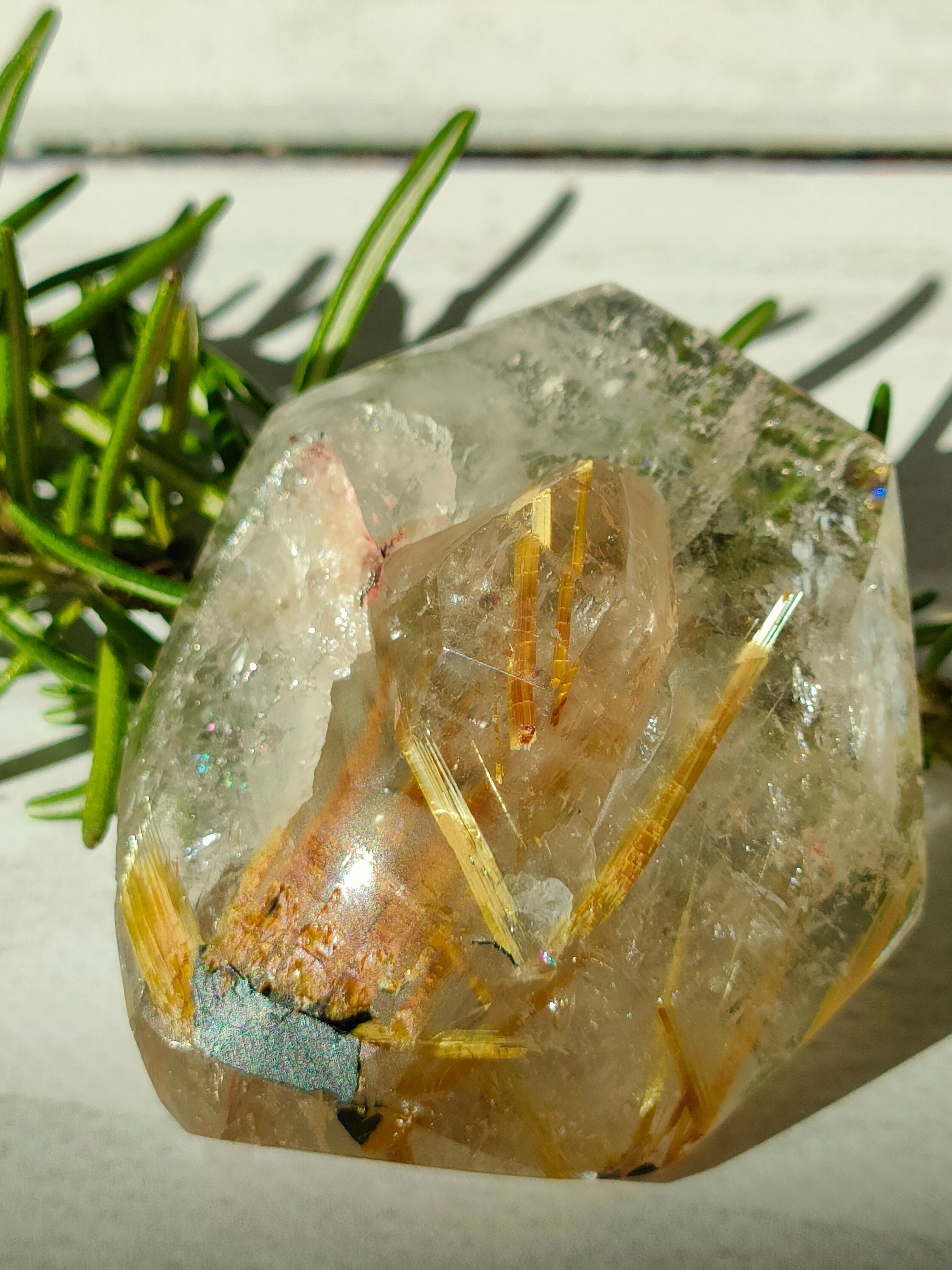 ルチルが花のように開いて輝き、透明な水晶からは虹があちこちからみられます。