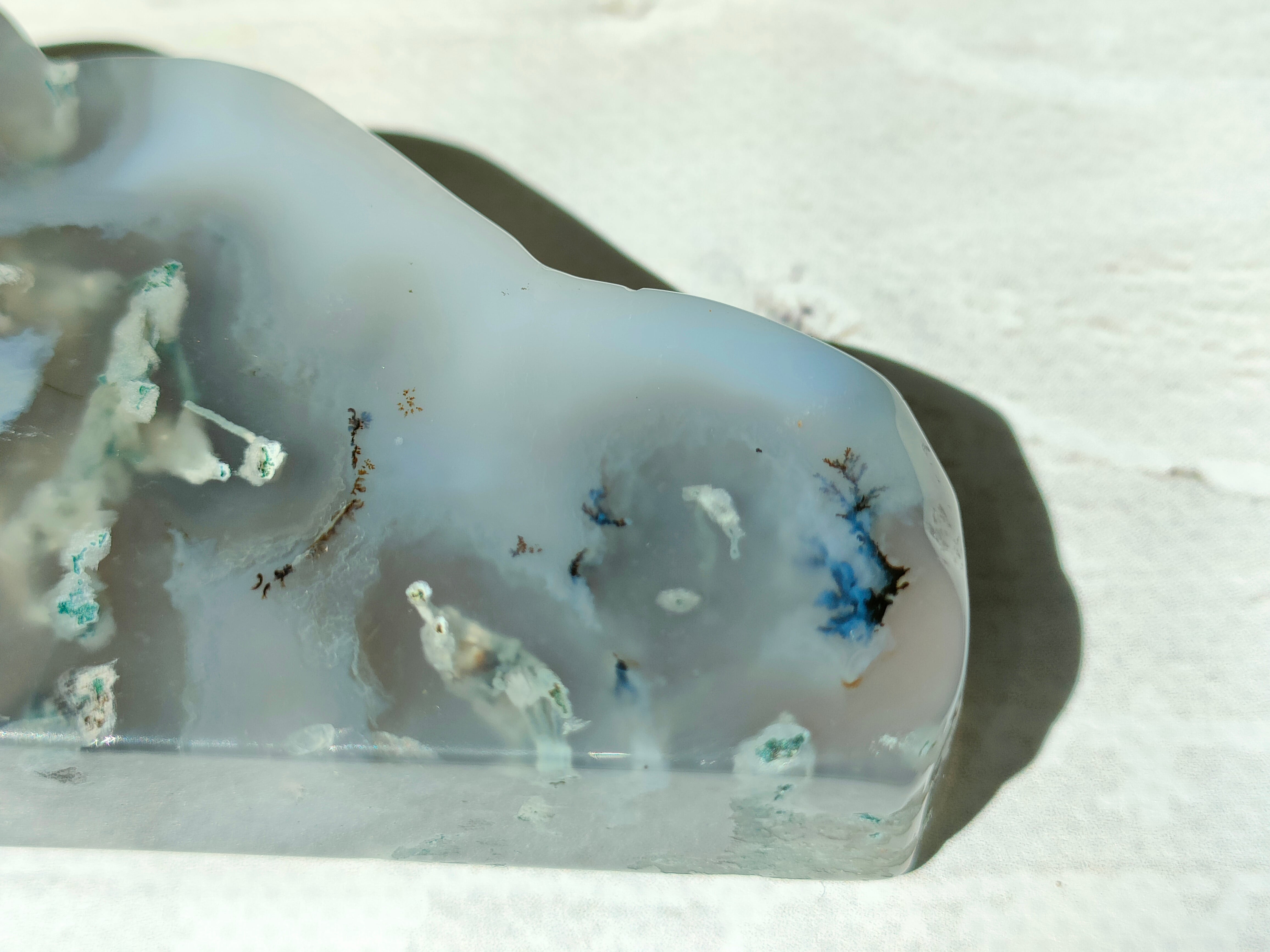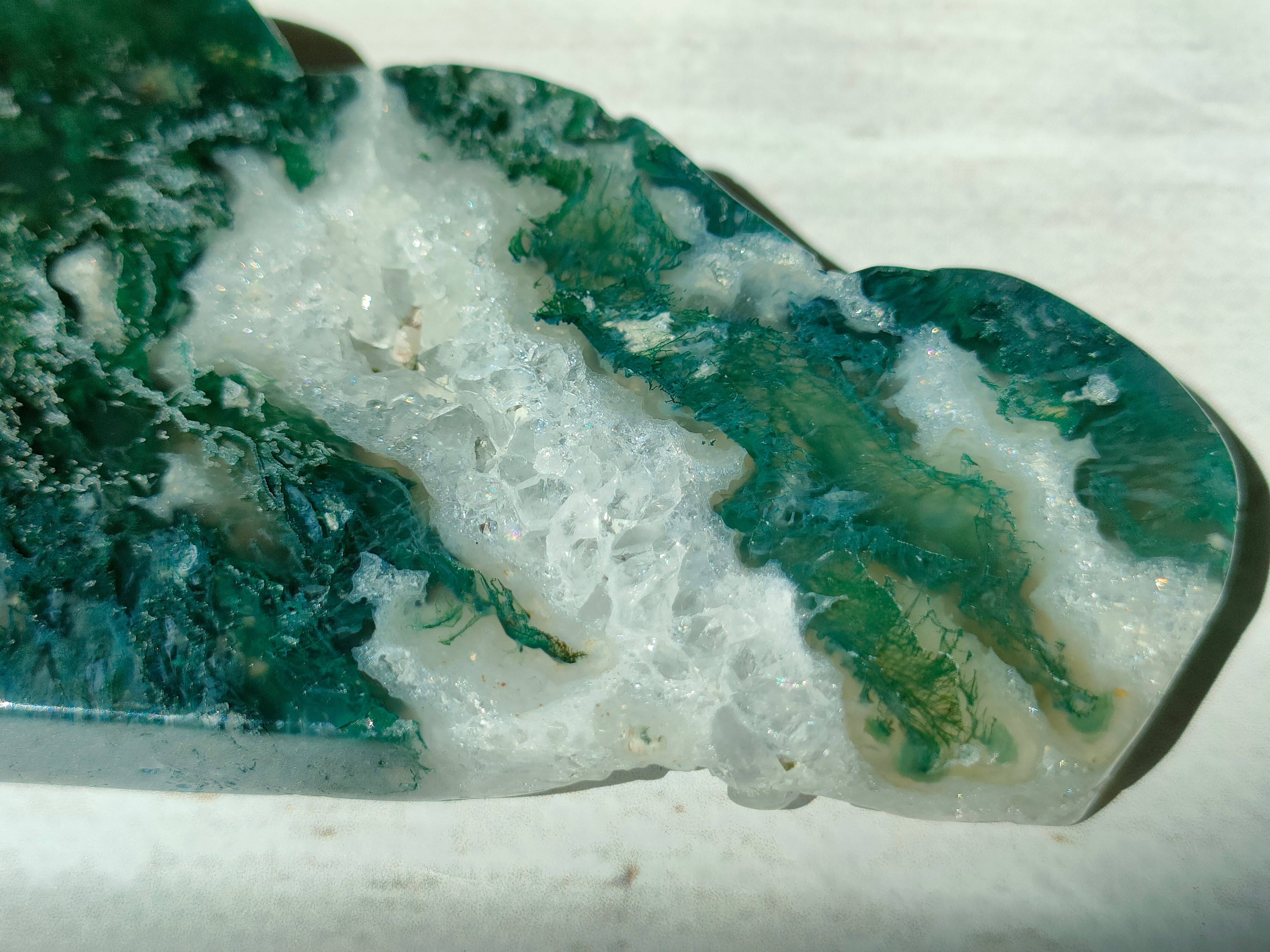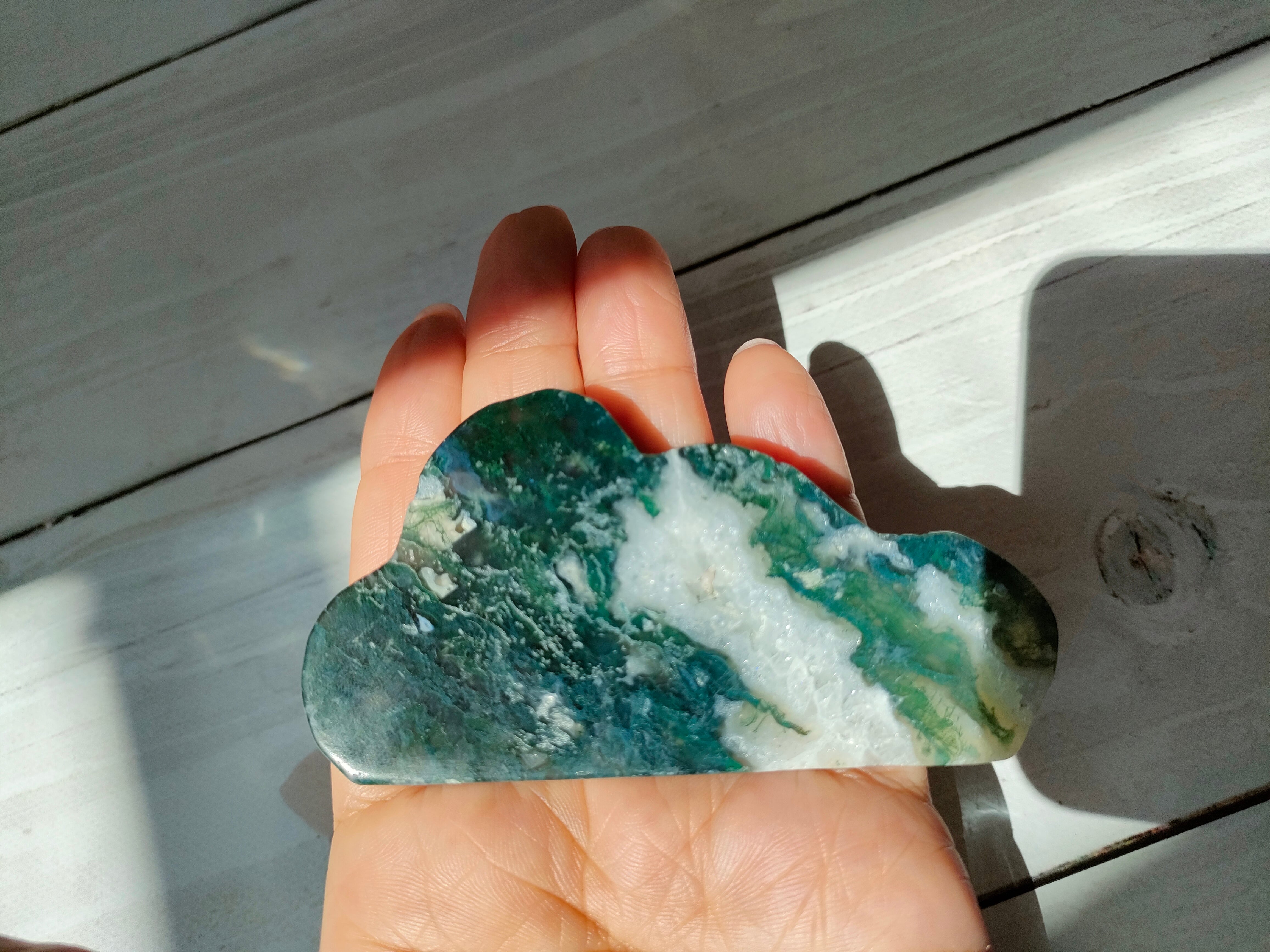 モスアゲートの『モス』は苔(こけ)のことで、アゲートやカルセドニーなどの鉱物が混ざり合った独特な模様の石です。