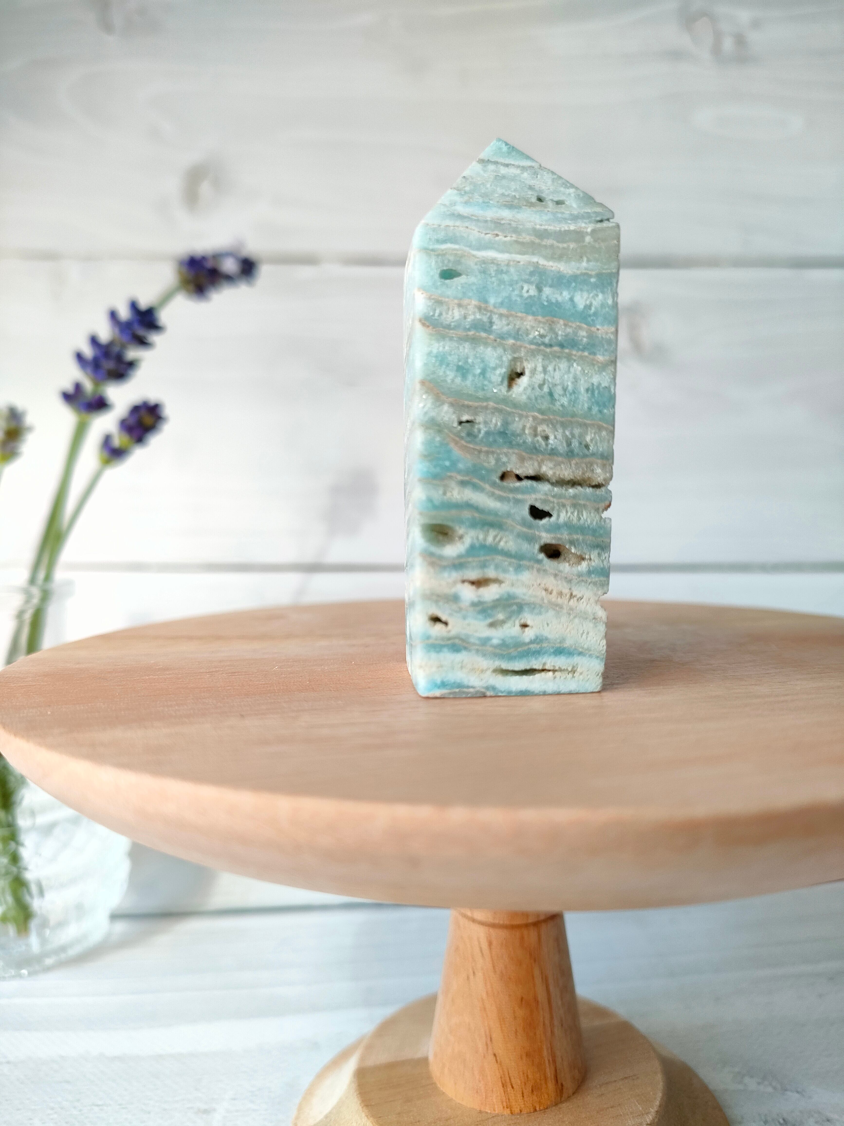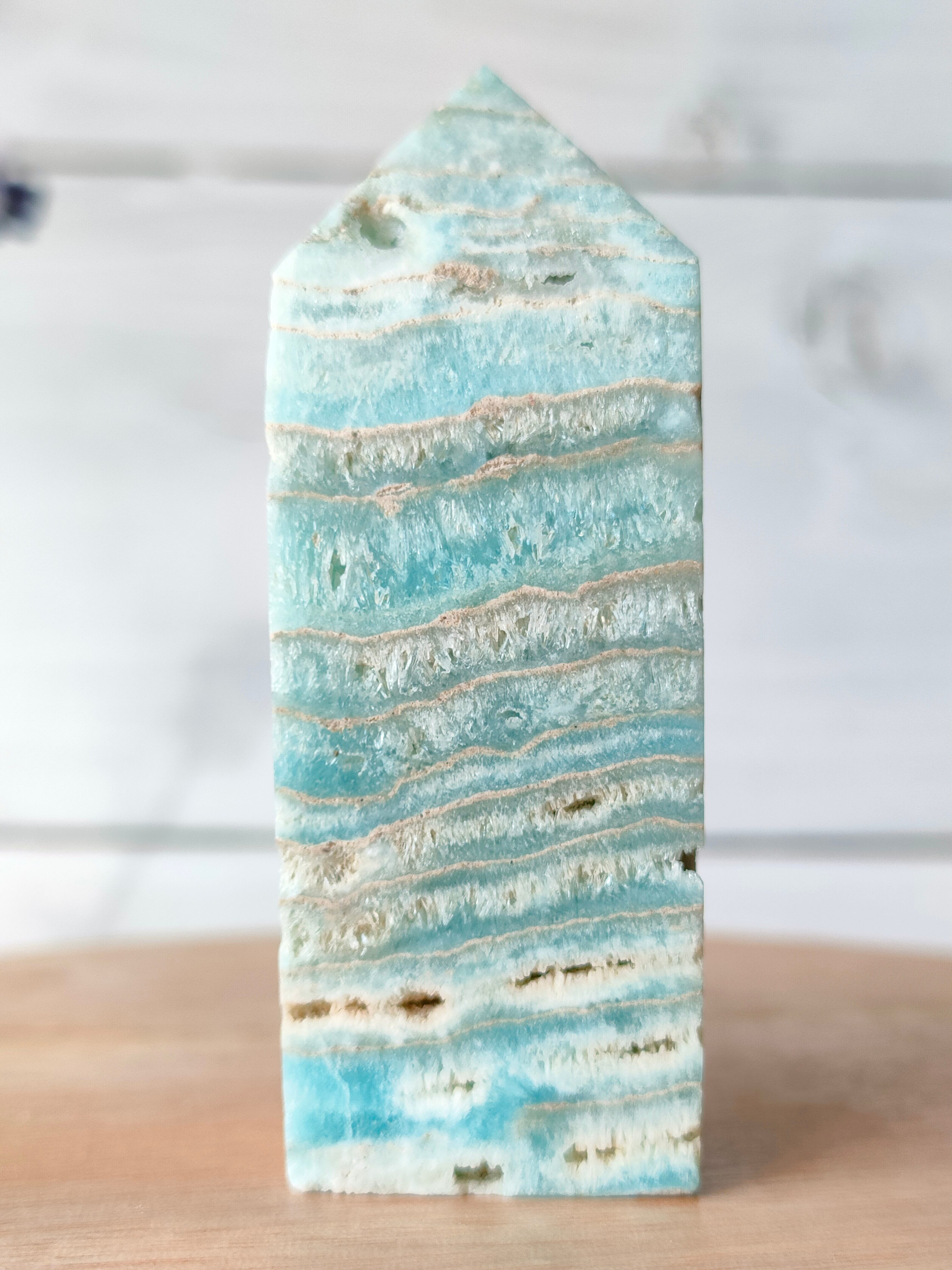 まるでカリブ海のような色味から『カリビアンブルーカルサイト』と呼ばれるようになりました。淡いブルーはブルーカルサイト、白や薄茶の部分はアラゴナイトと言われていますが詳しいことはまだわかっていません。