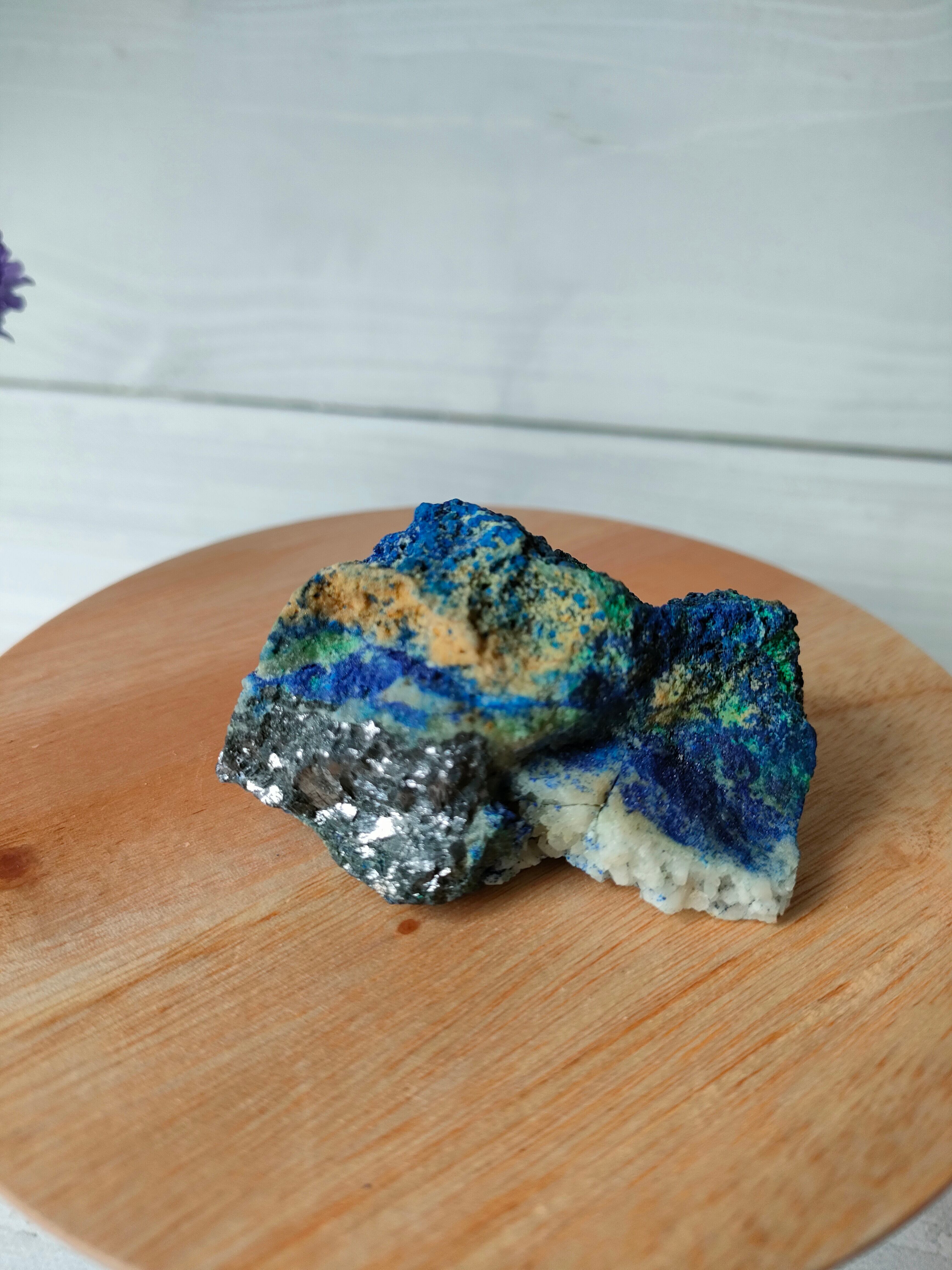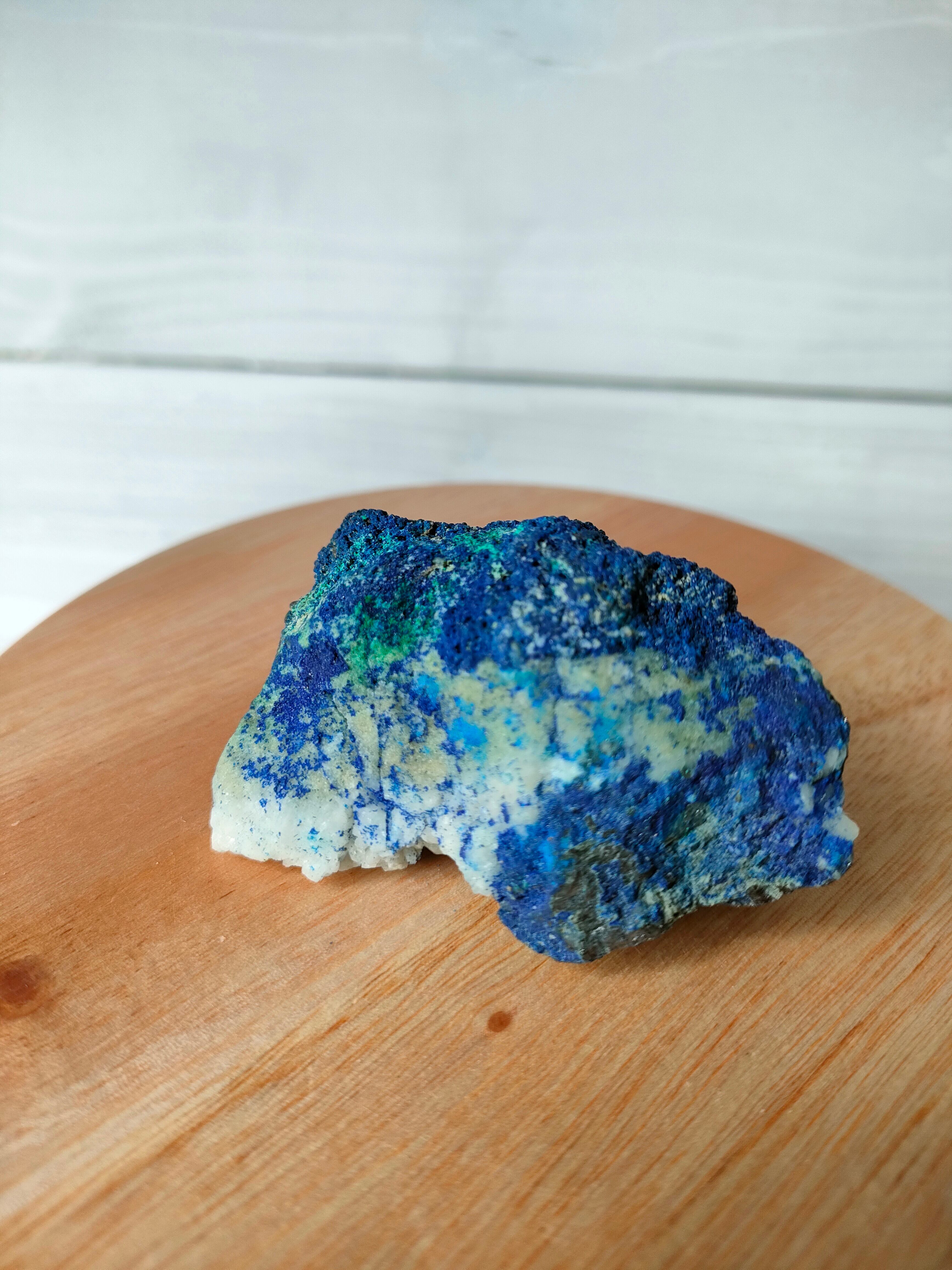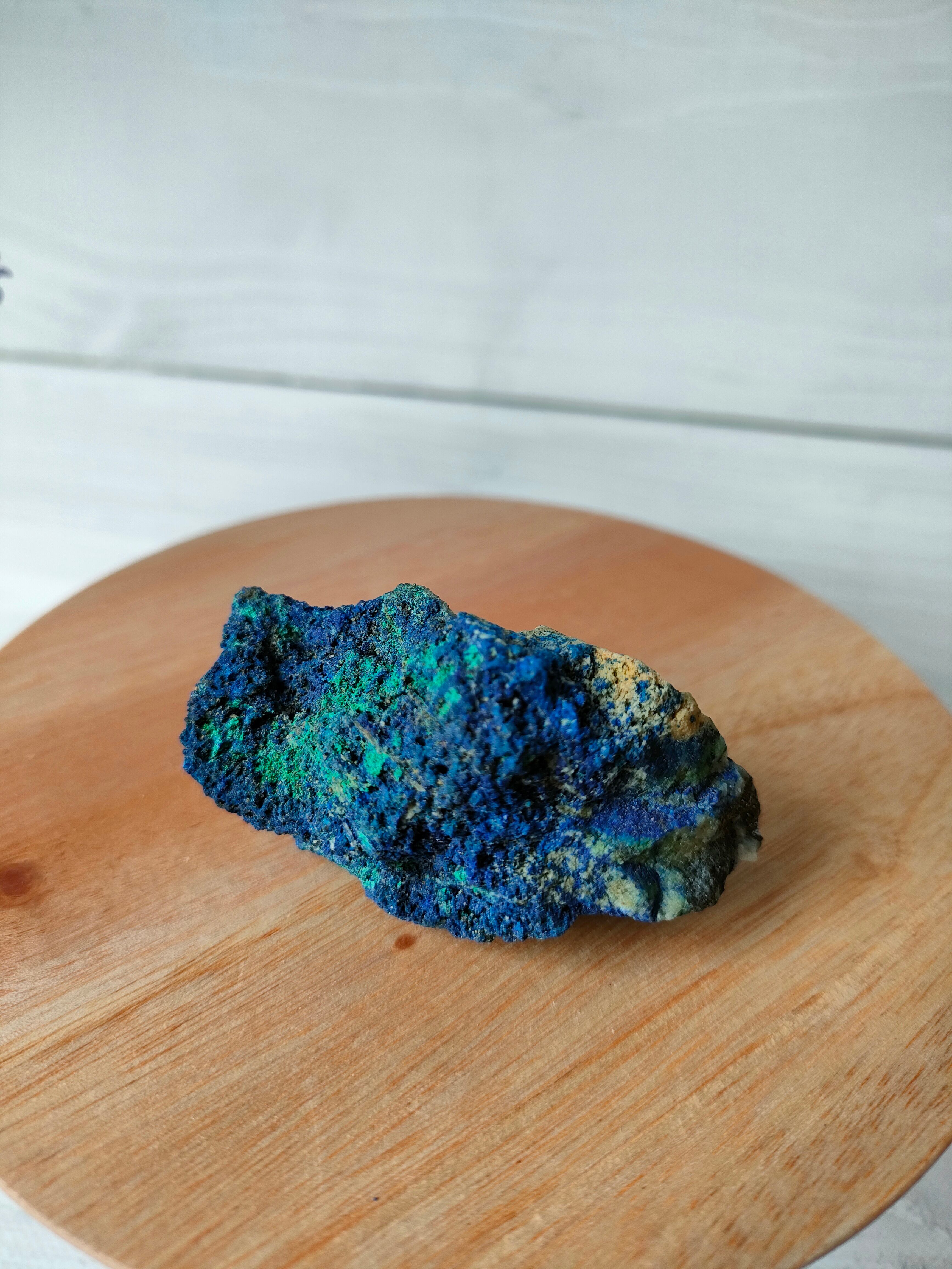 衝撃や水、紫外線、塩に弱いのでお気をつけください。アズライトが水分を含むなどで反応するとマラカイトに変化していく可能性があります。