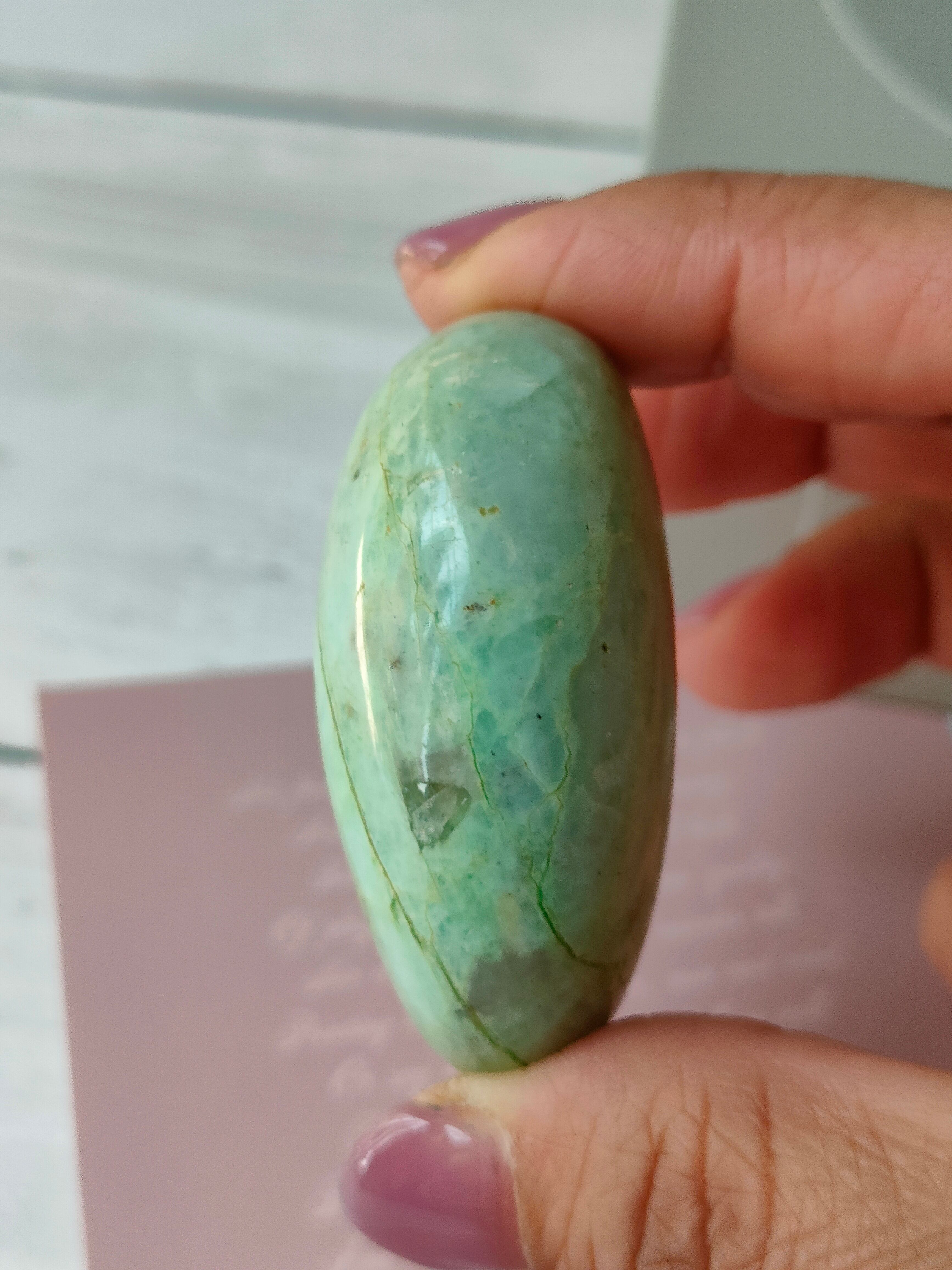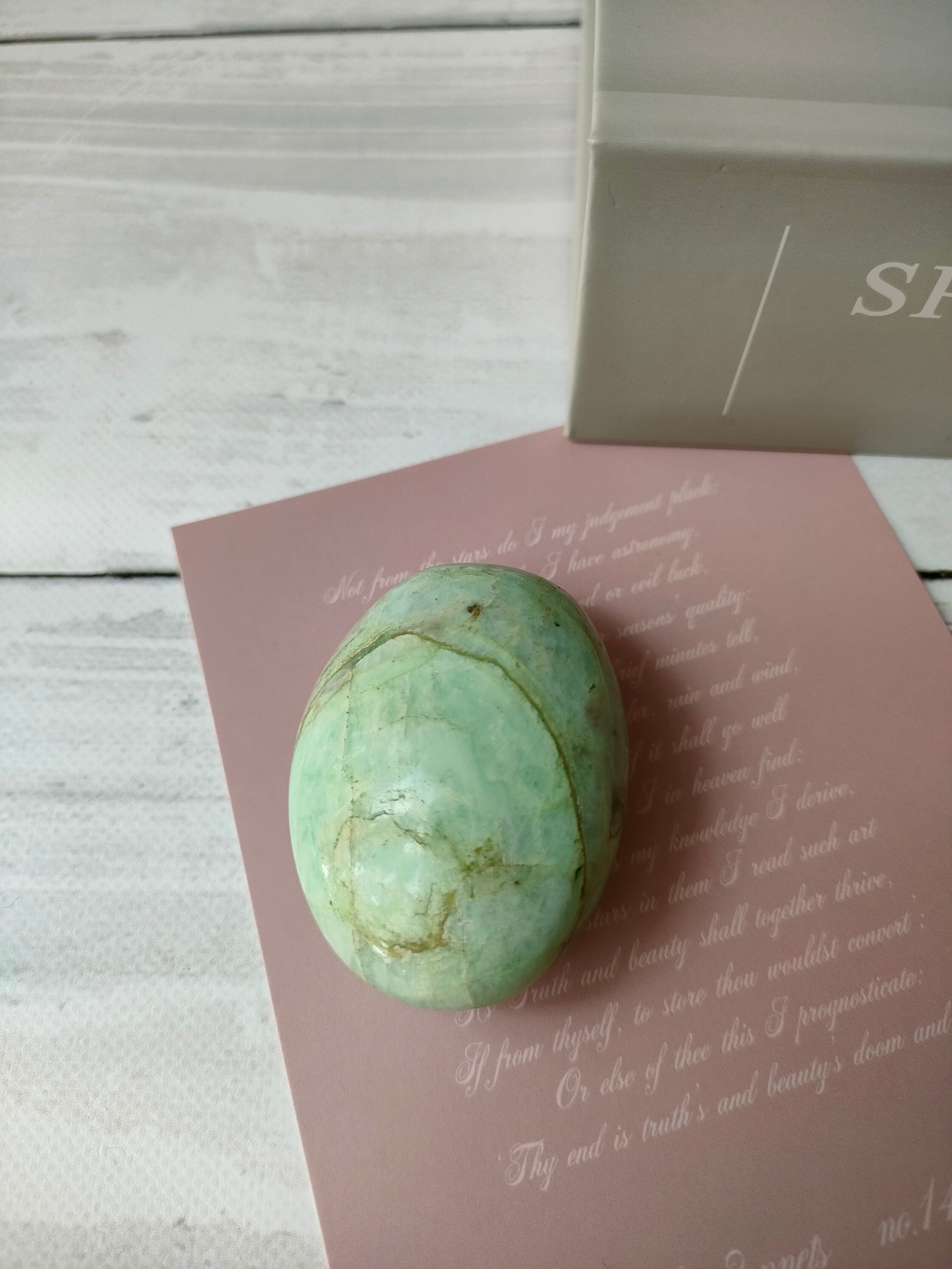ガーニエライトは和名を『珪ニッケル』と言い、蛇紋岩とニッケルが混ざってできた石です。ムーンストーンと同じ『長石』の仲間なので輝き方が似ています。