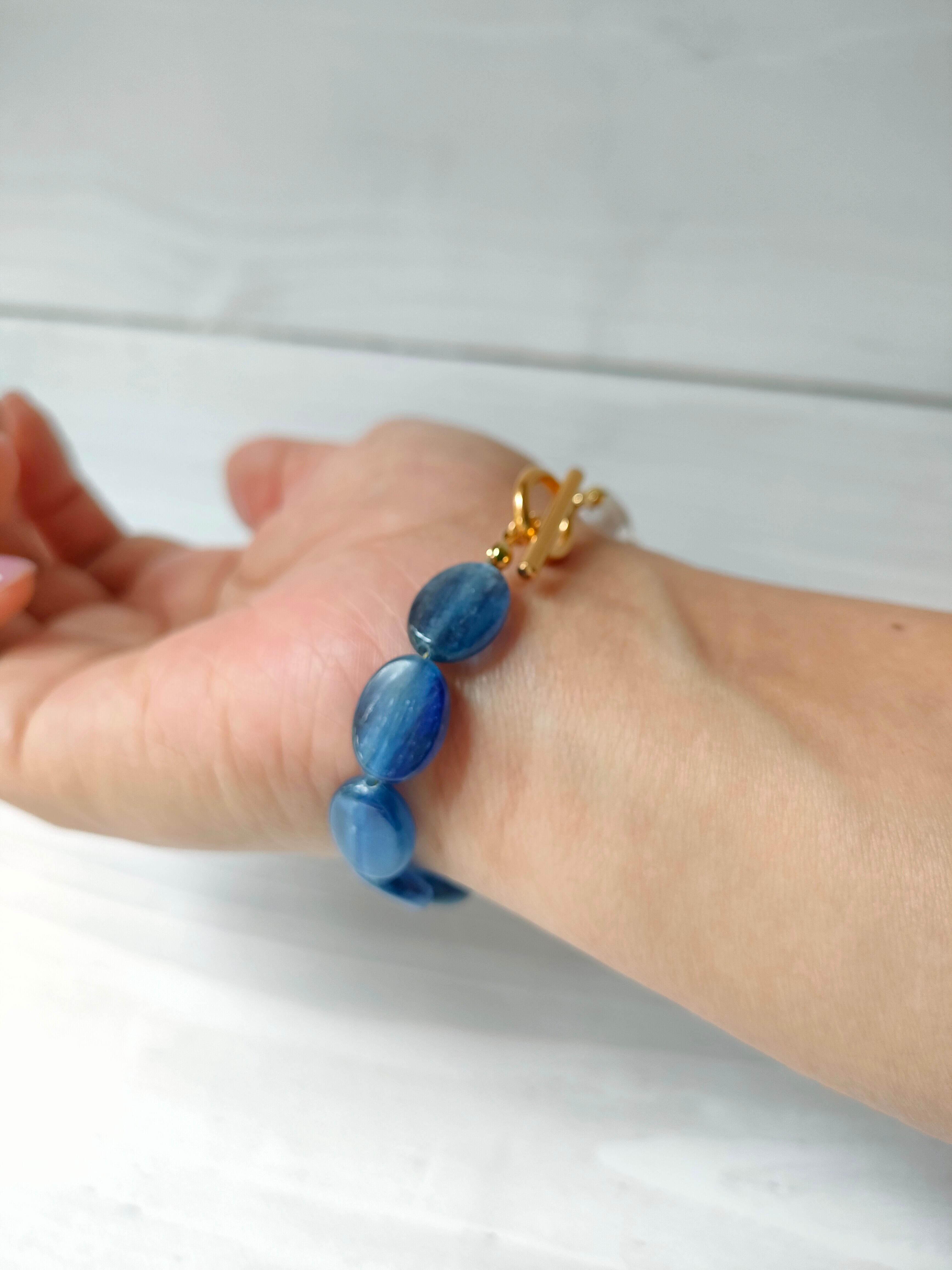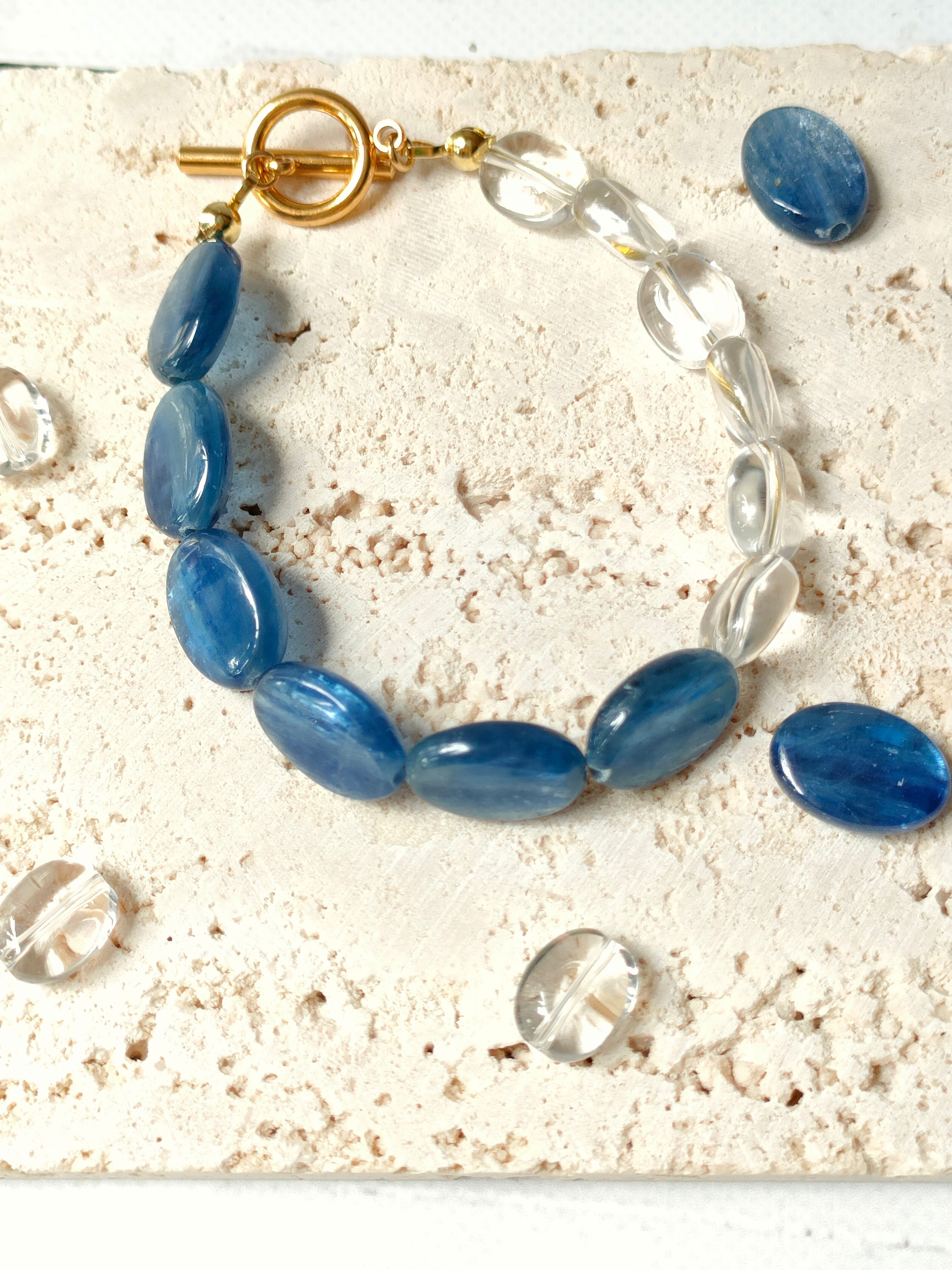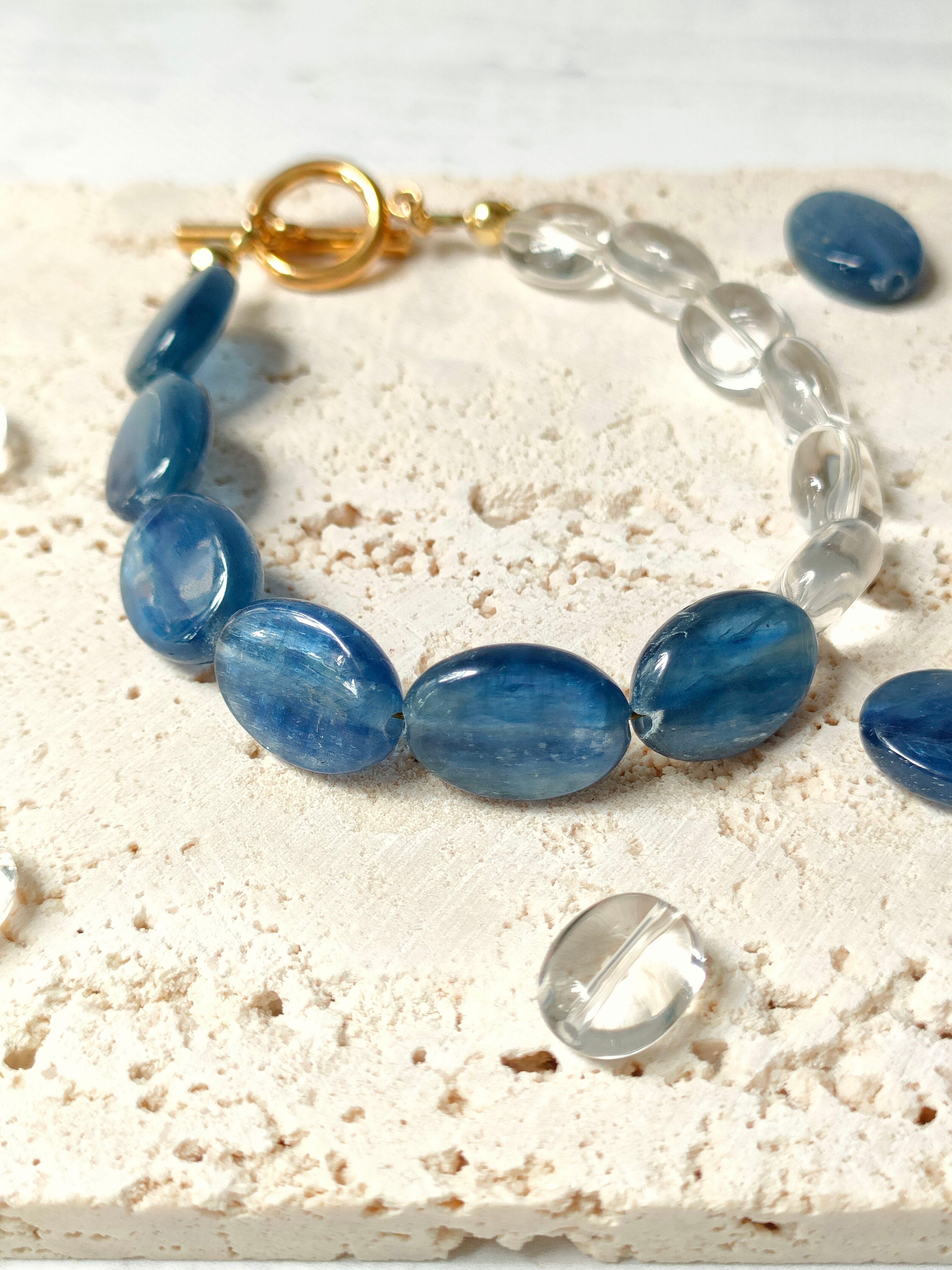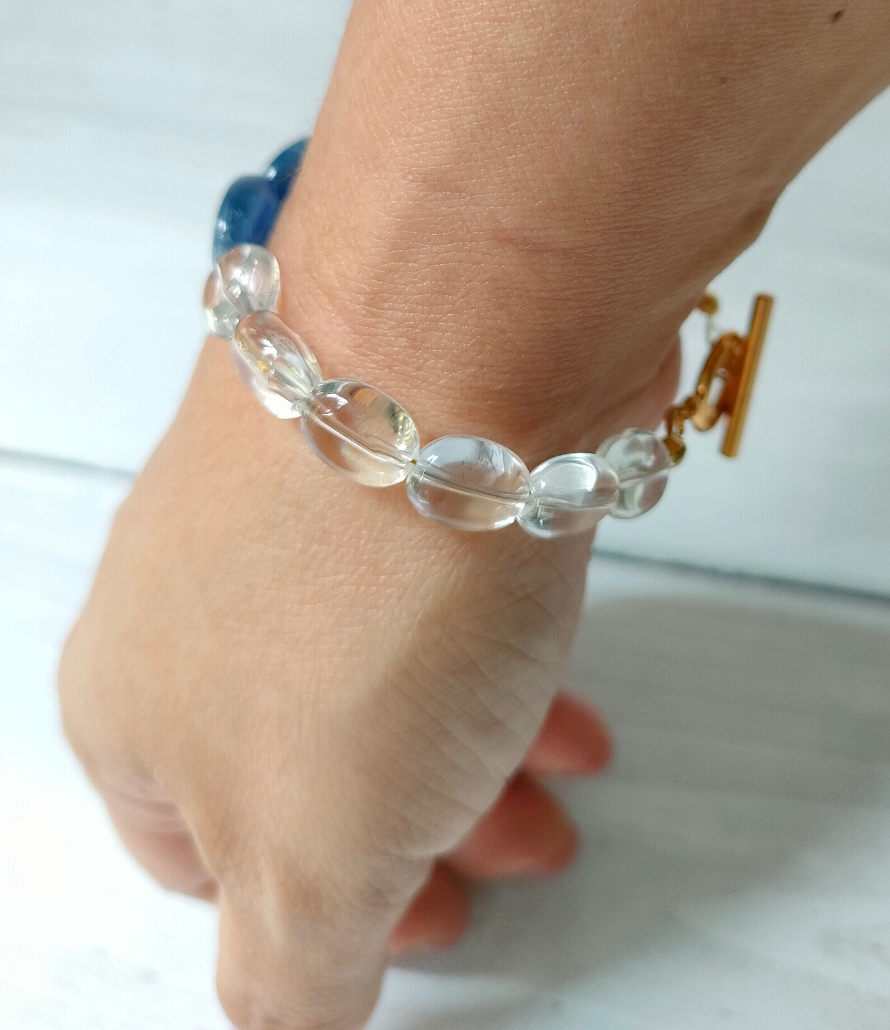 藍色のカイヤナイトの輝きが美しく、クリアクォーツも涼しげなブレスレットです。