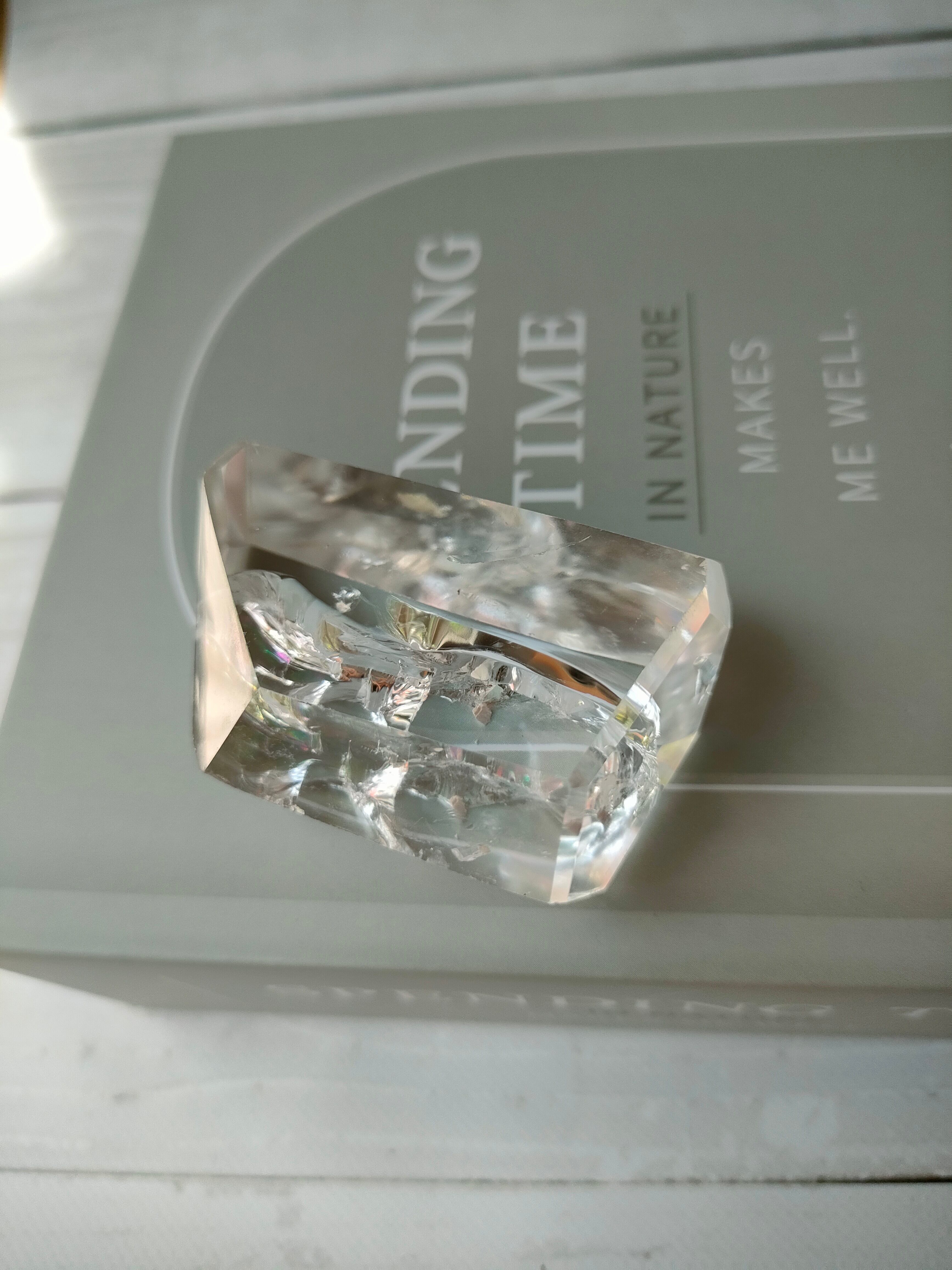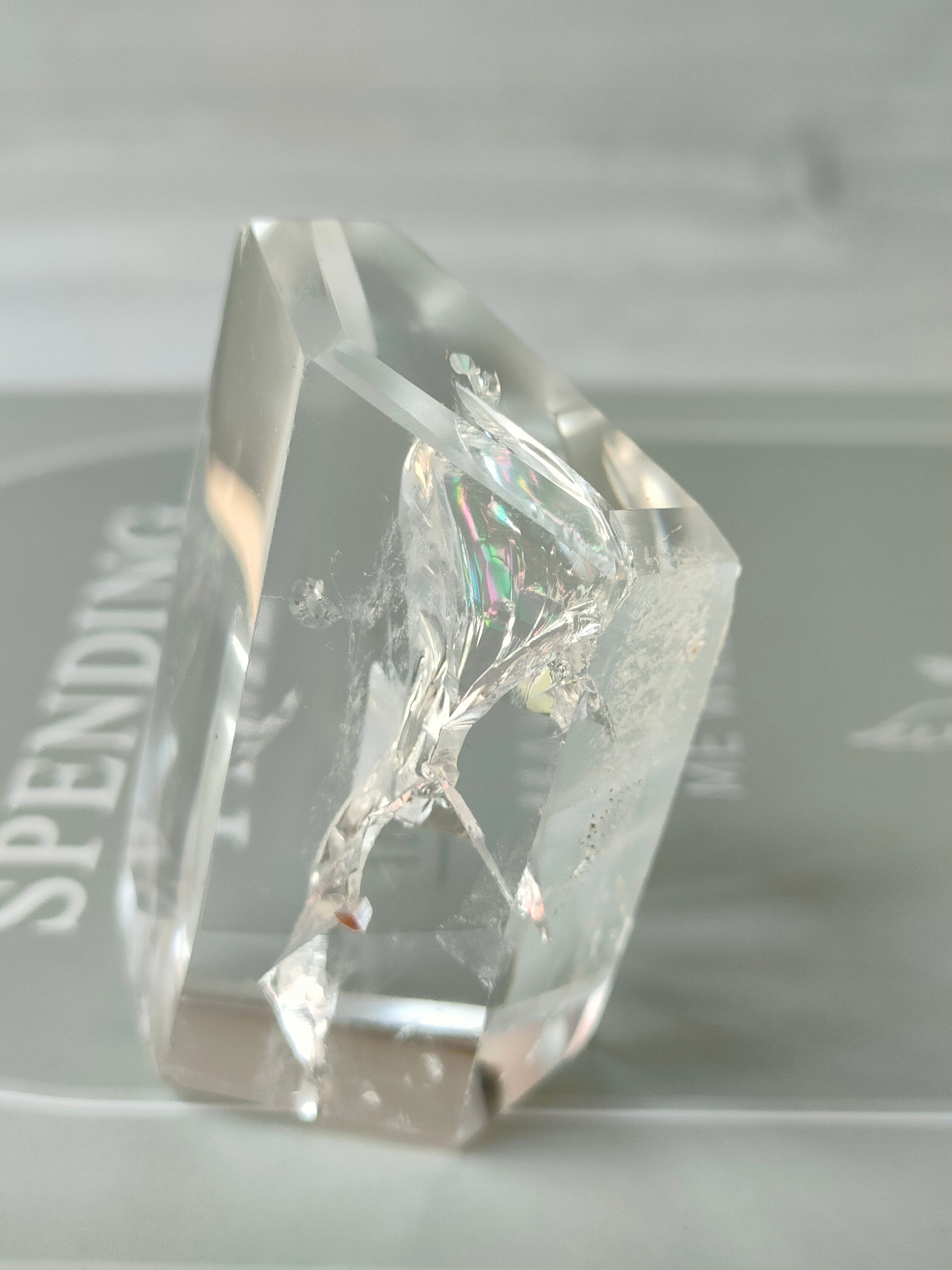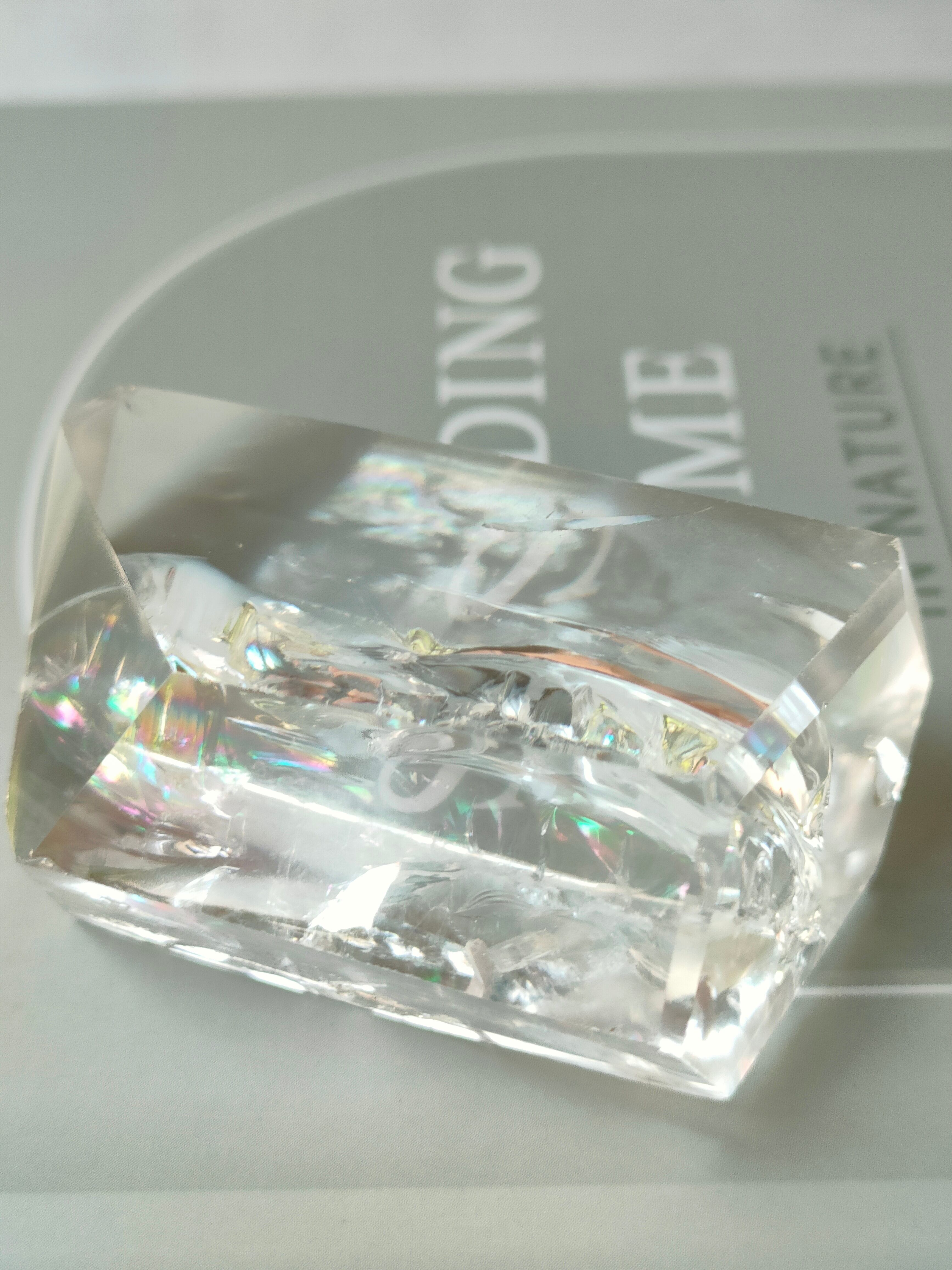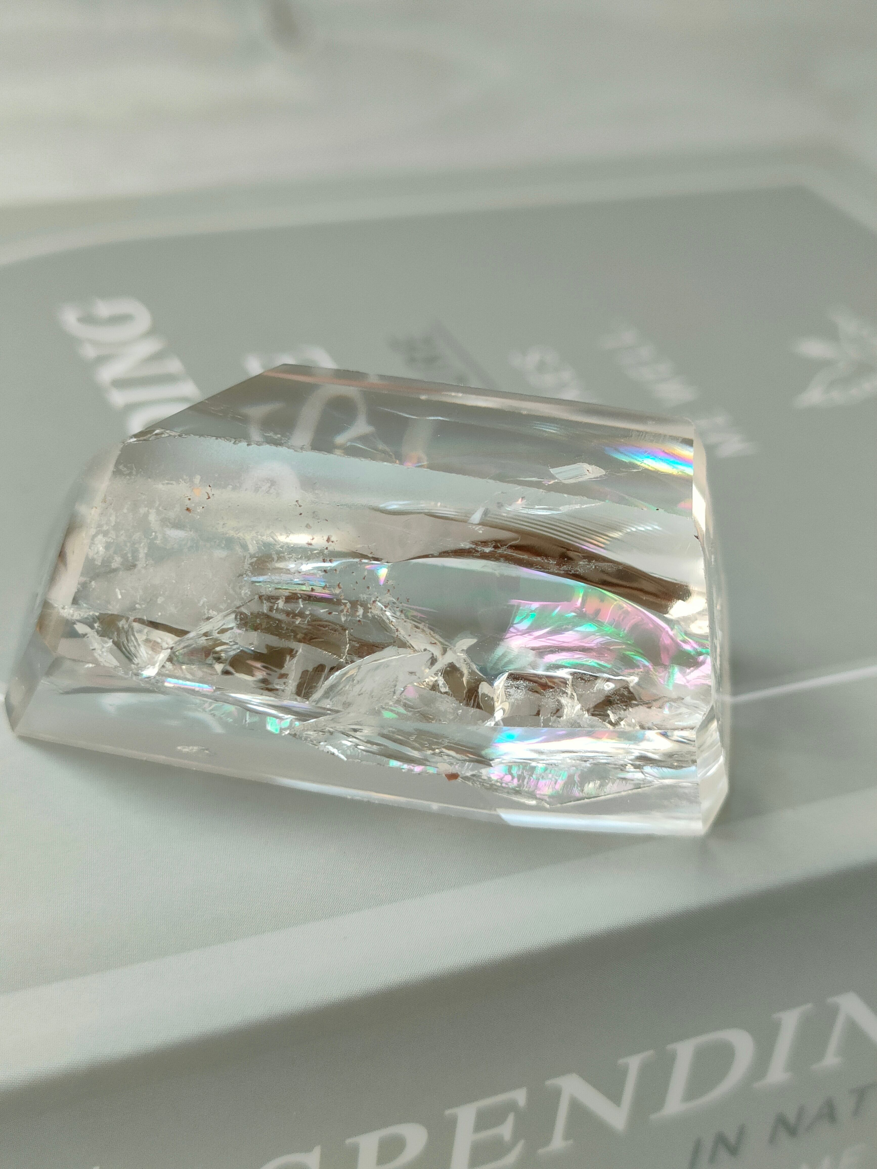 生成過程に鉱床内で圧力や温度の変化が加わったことで、結晶内部に歪みや亀裂ができて元々の光の屈折率が変化して虹色のスペクトルを放つ水晶です。