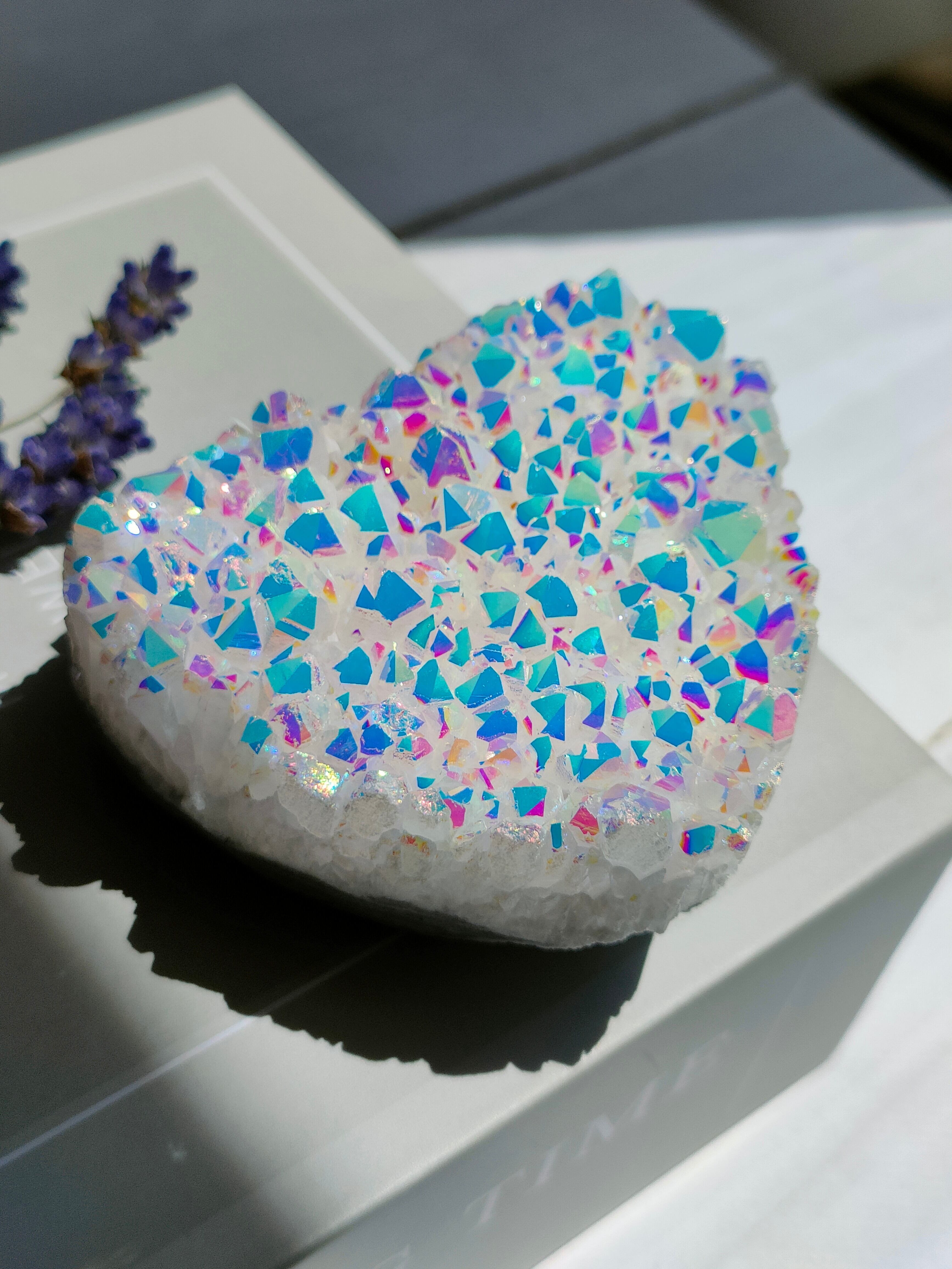 表面にシャボン玉のような独特な色彩を持つ『オーラクォーツ』は、加熱された真空内でイオン化した金属を水晶に皮膜蒸着したストーンです。エンジェルオーラにはプラチナと銀が使われています。