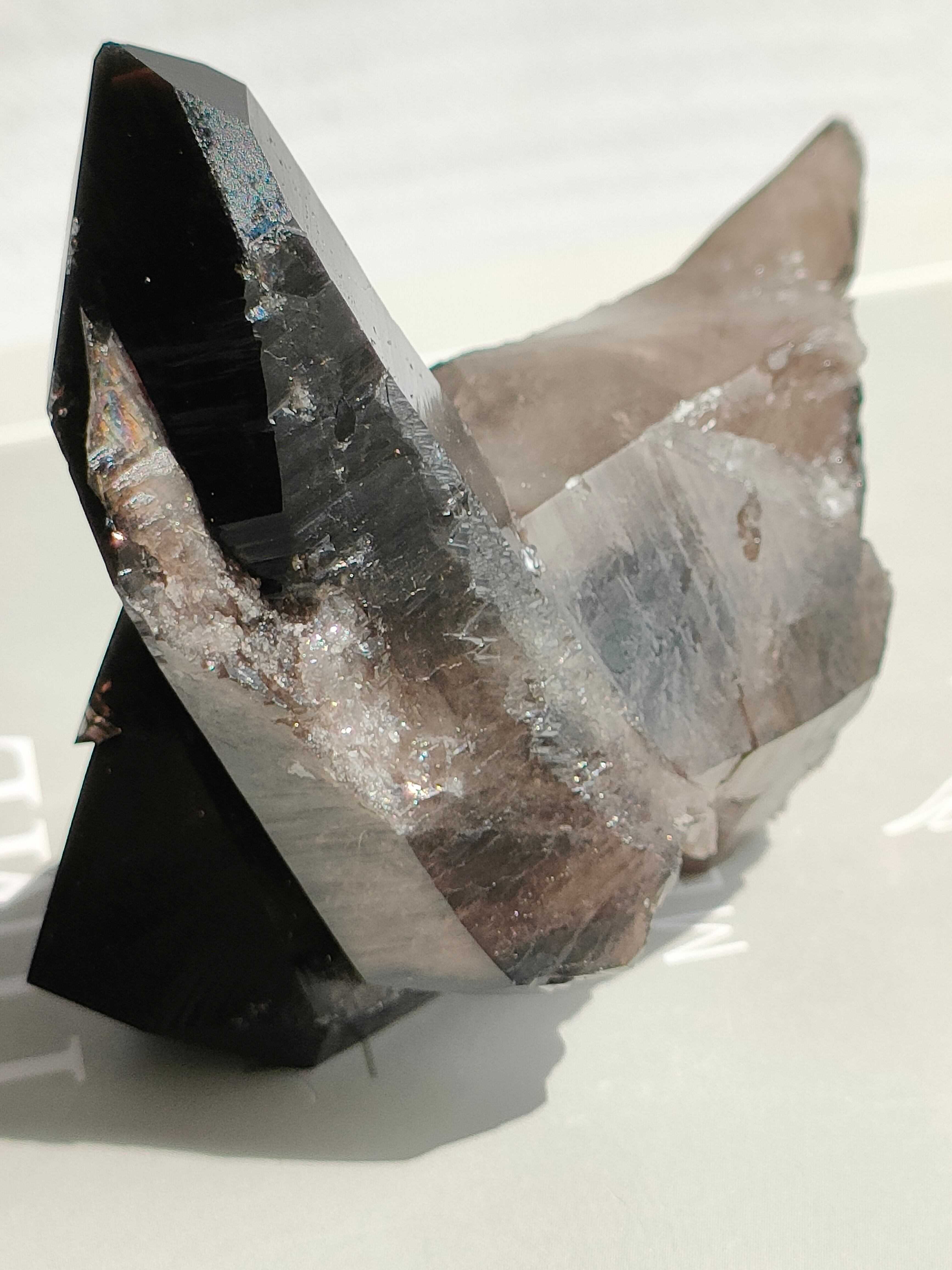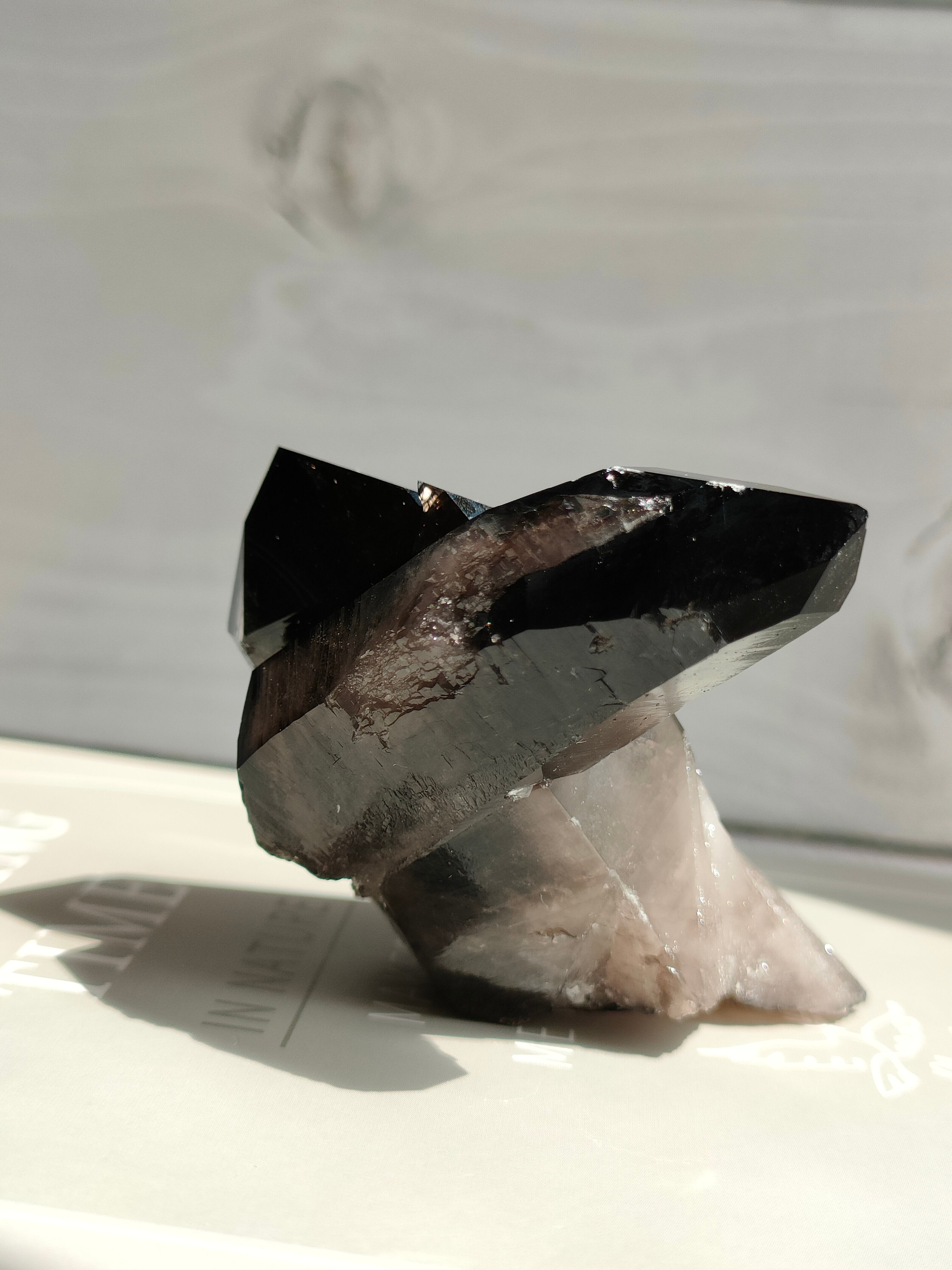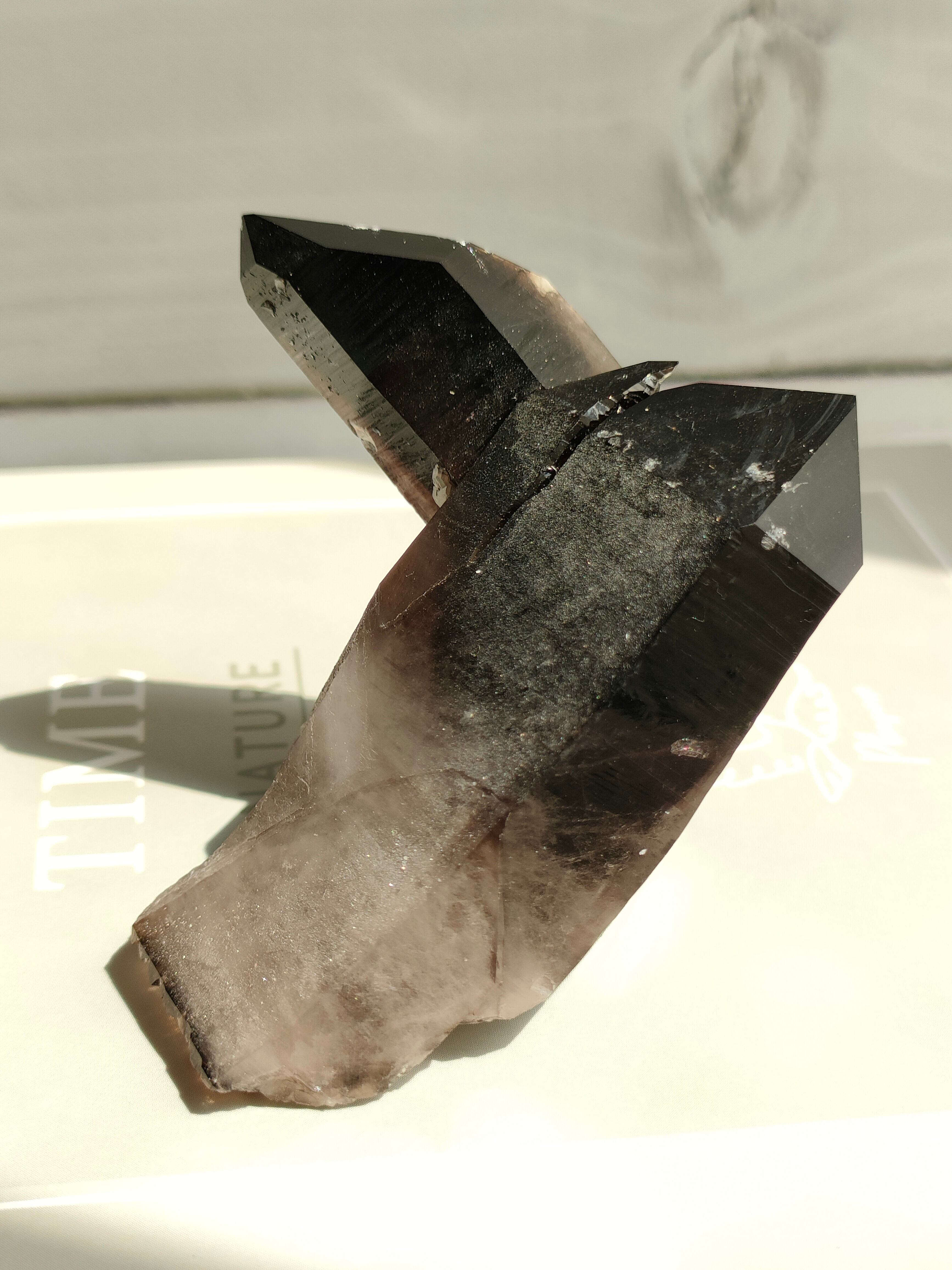 水晶は成長過程で含まれる微量のアルミニウムが放射性鉱物などの影響を受けると褐色から黒色に発色します。不透明で深い黒色をモリオンといいます。和名は黒水晶です。
