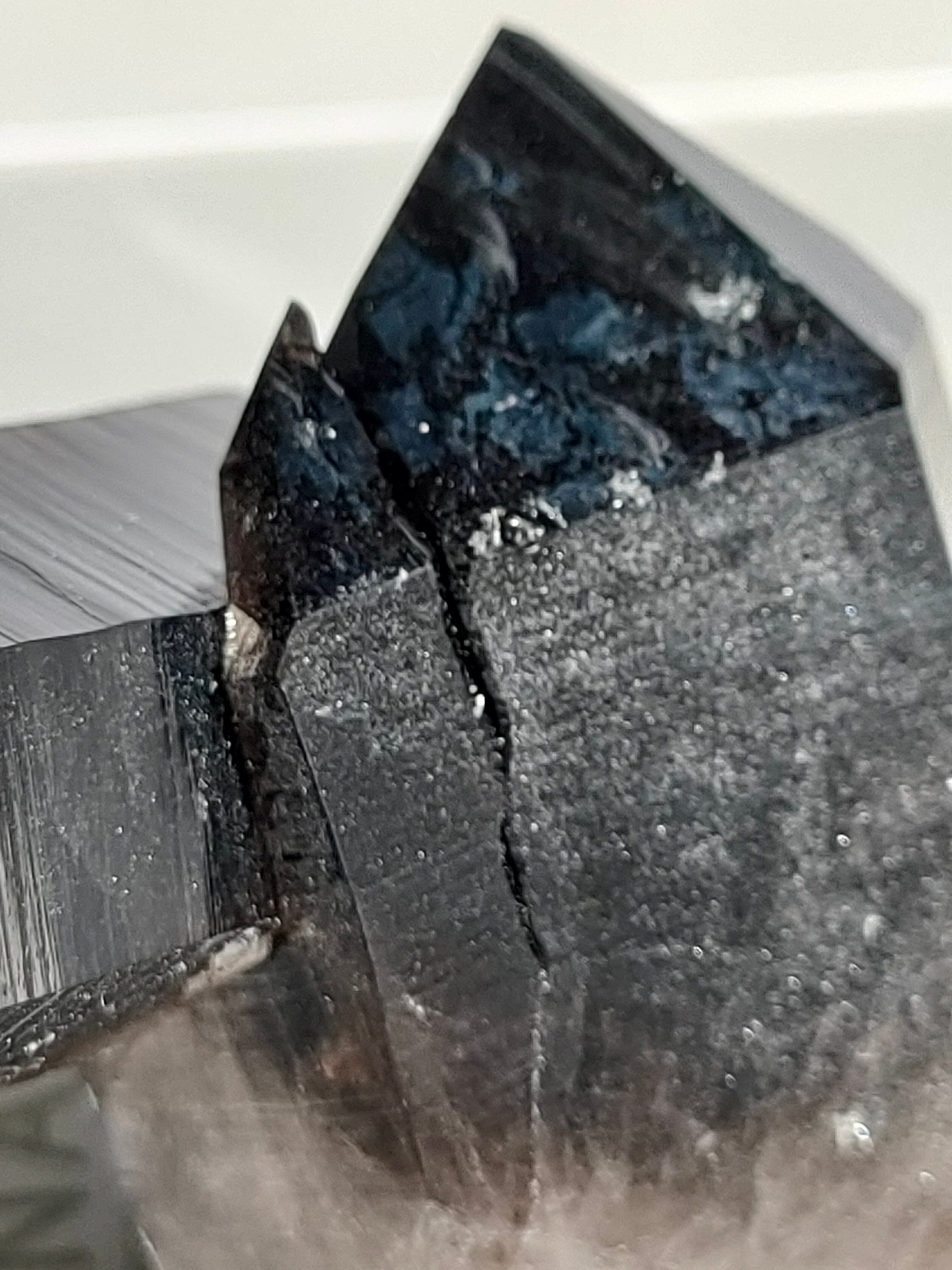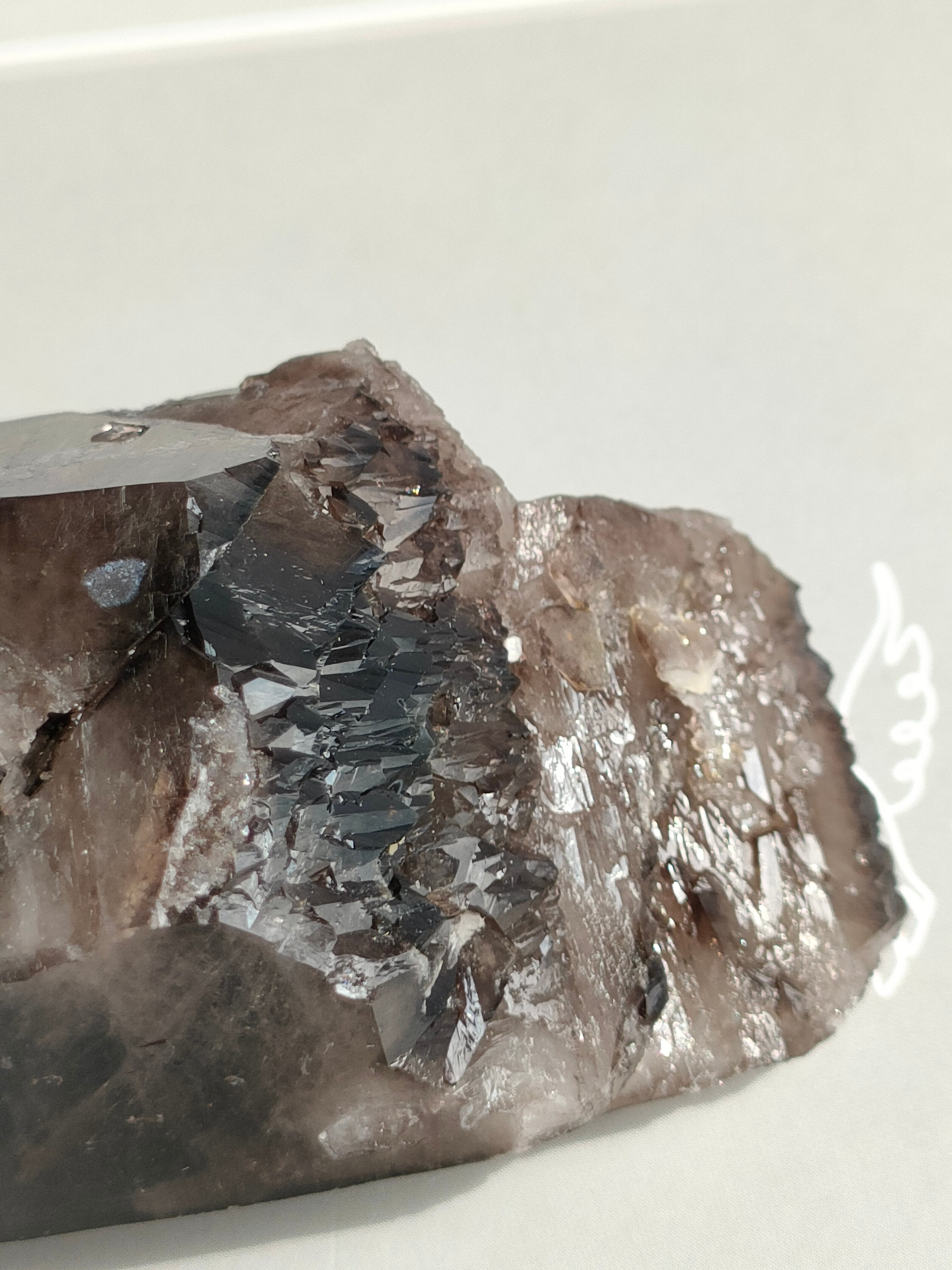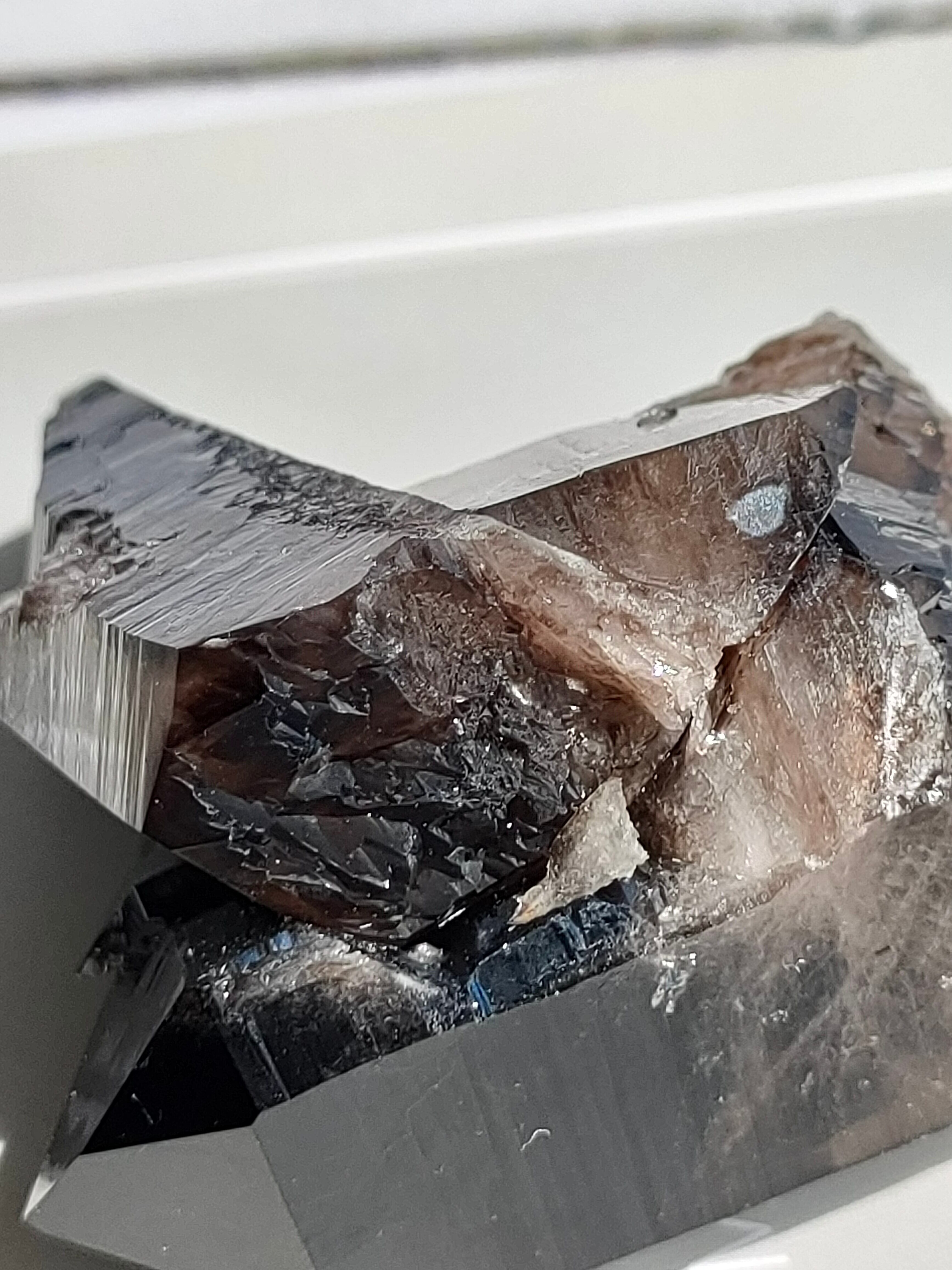水晶は成長過程で含まれる微量のアルミニウムが放射性鉱物などの影響を受けると褐色から黒色に発色します。不透明で深い黒色をモリオンといいます。和名は黒水晶です。