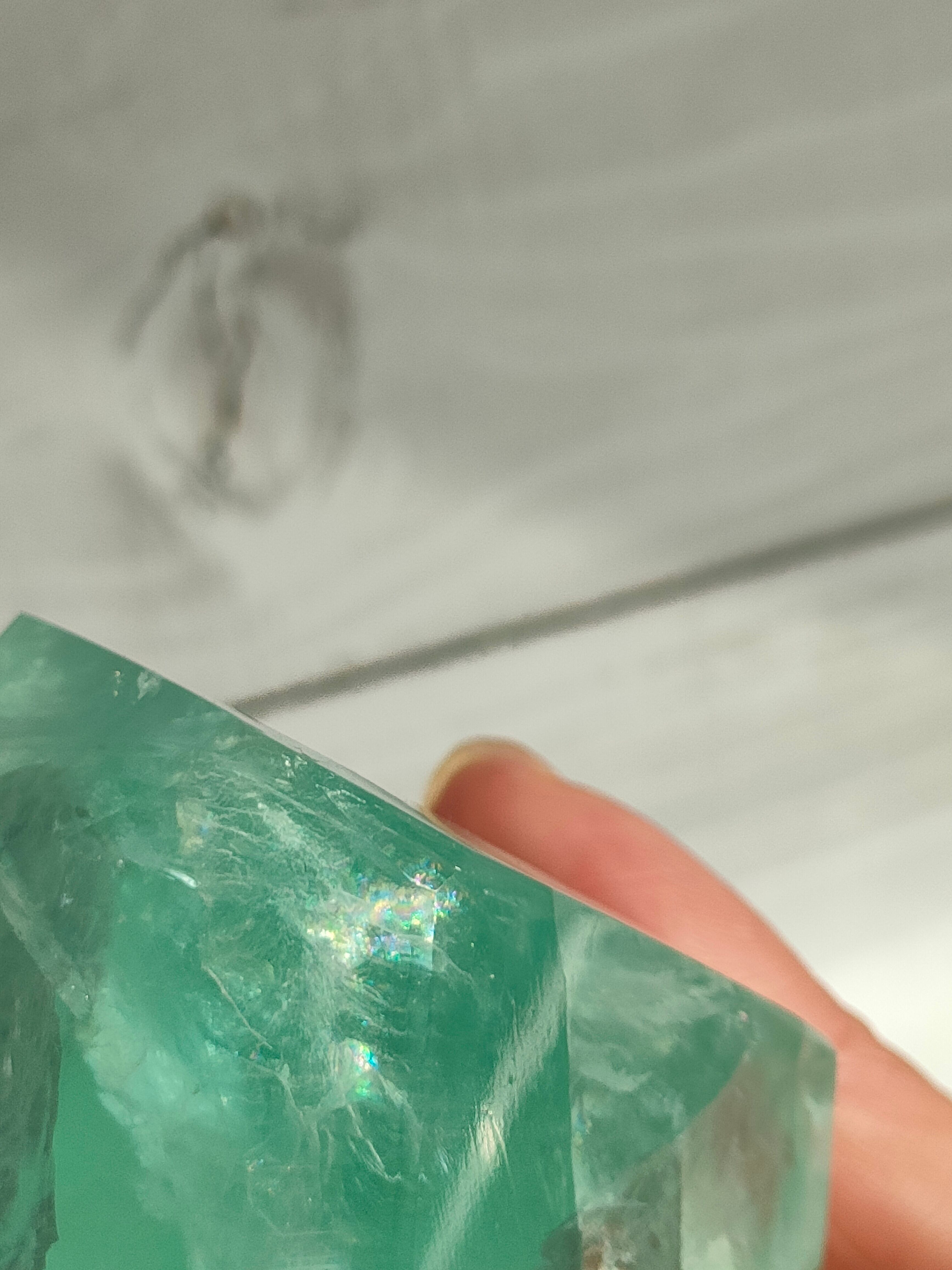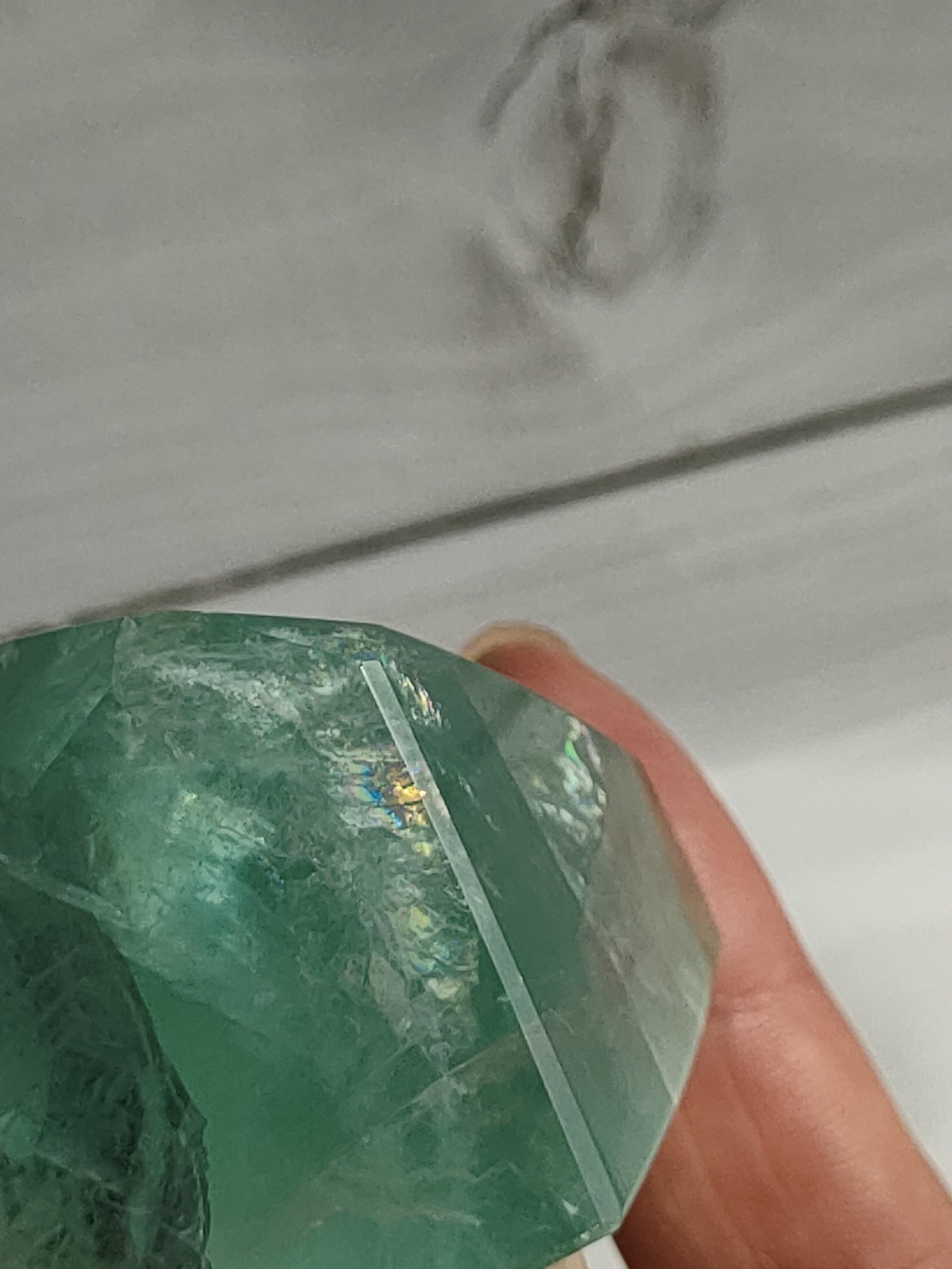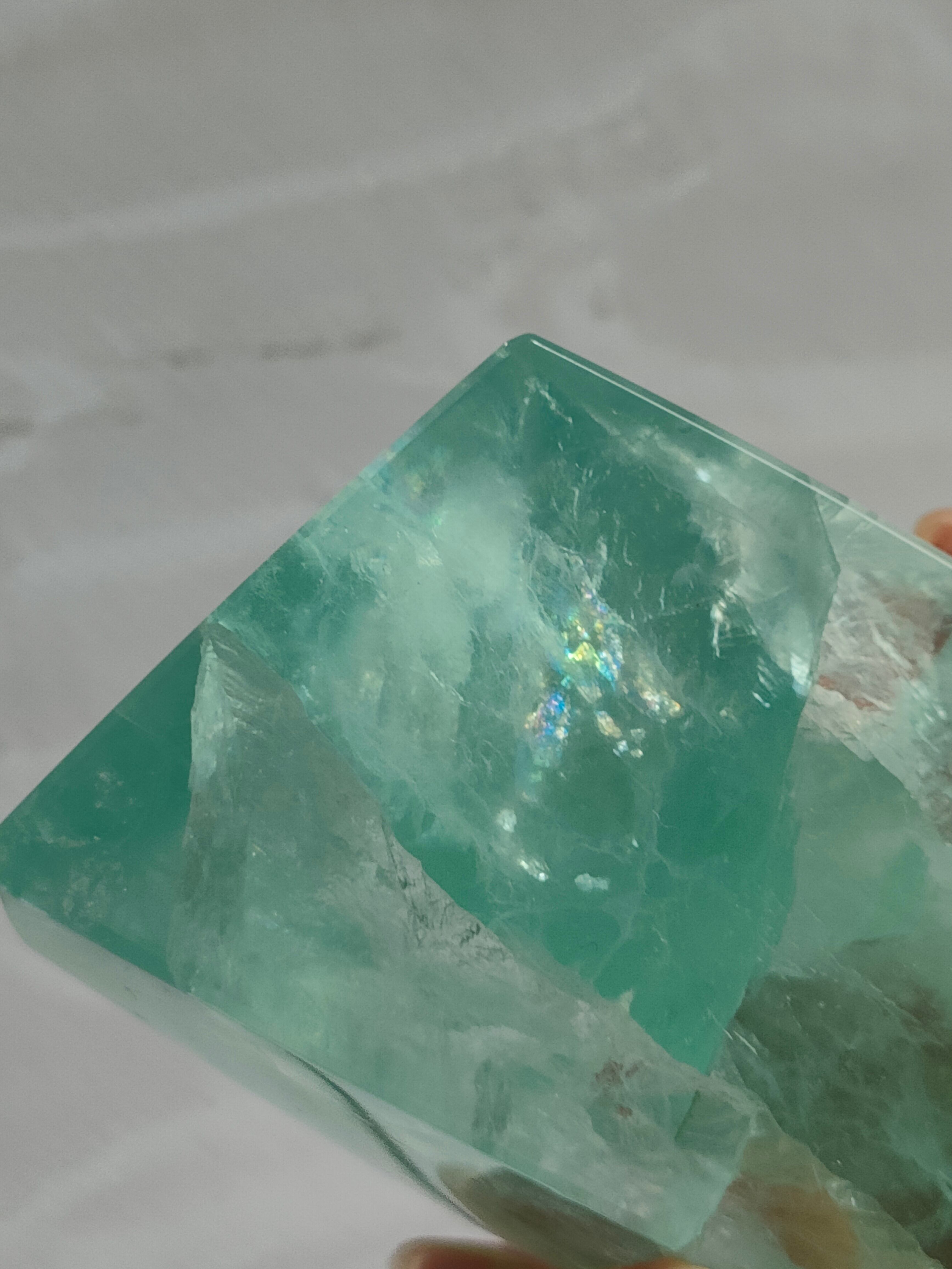 透明感のある淡いミントグリーンが優しく、内側のクラックの輝きもとても綺麗です。虹もたくさんみられます。