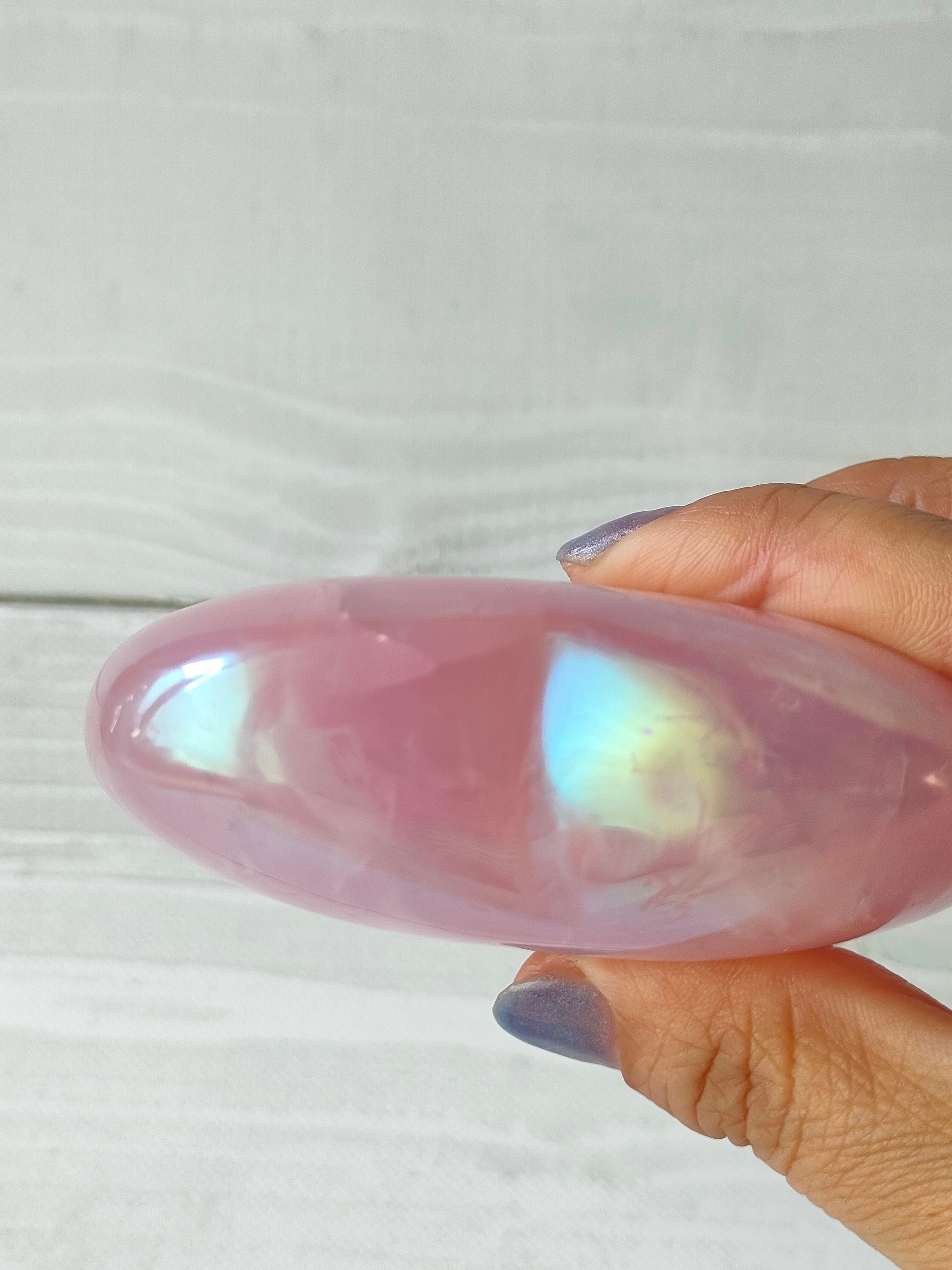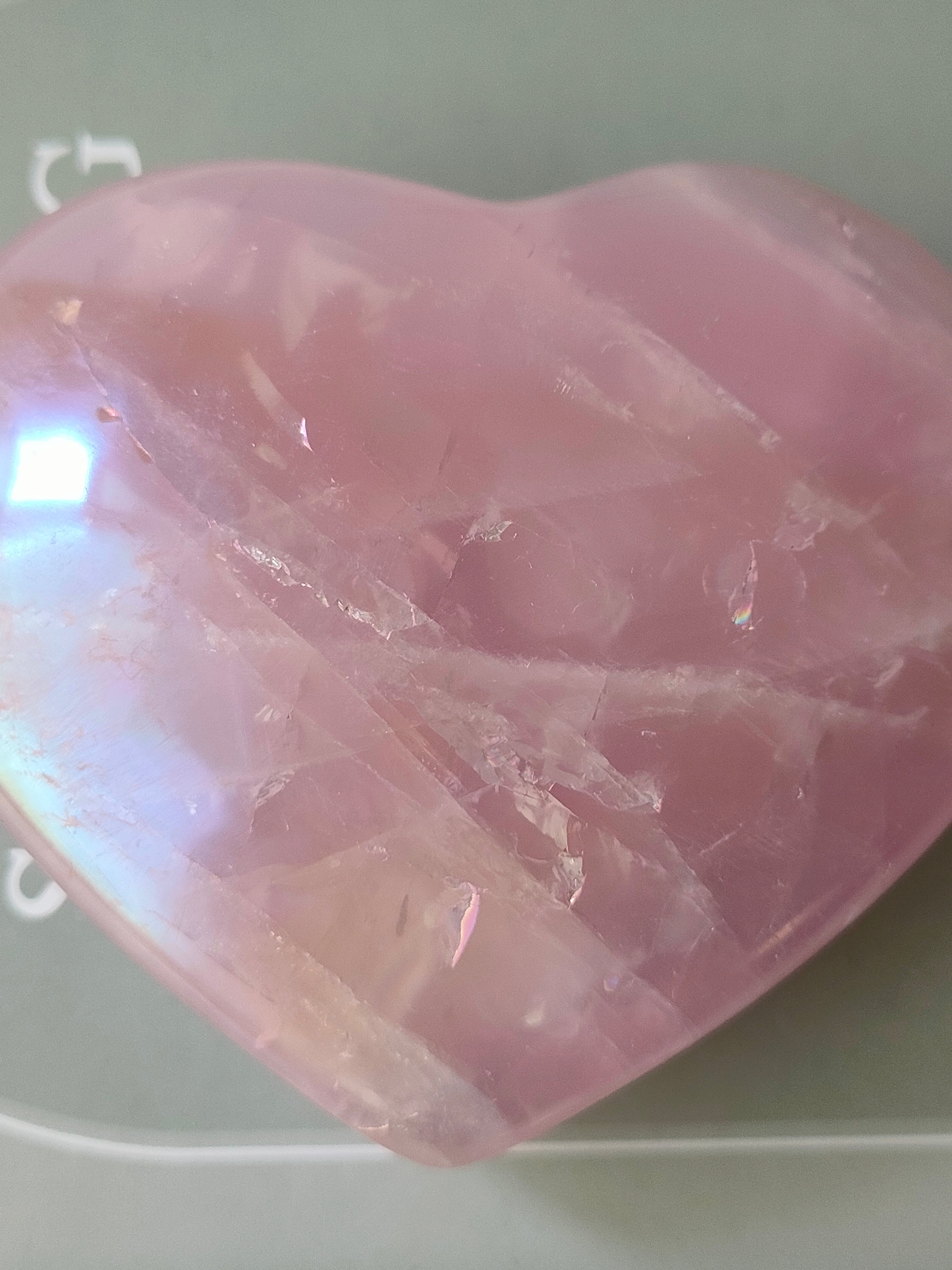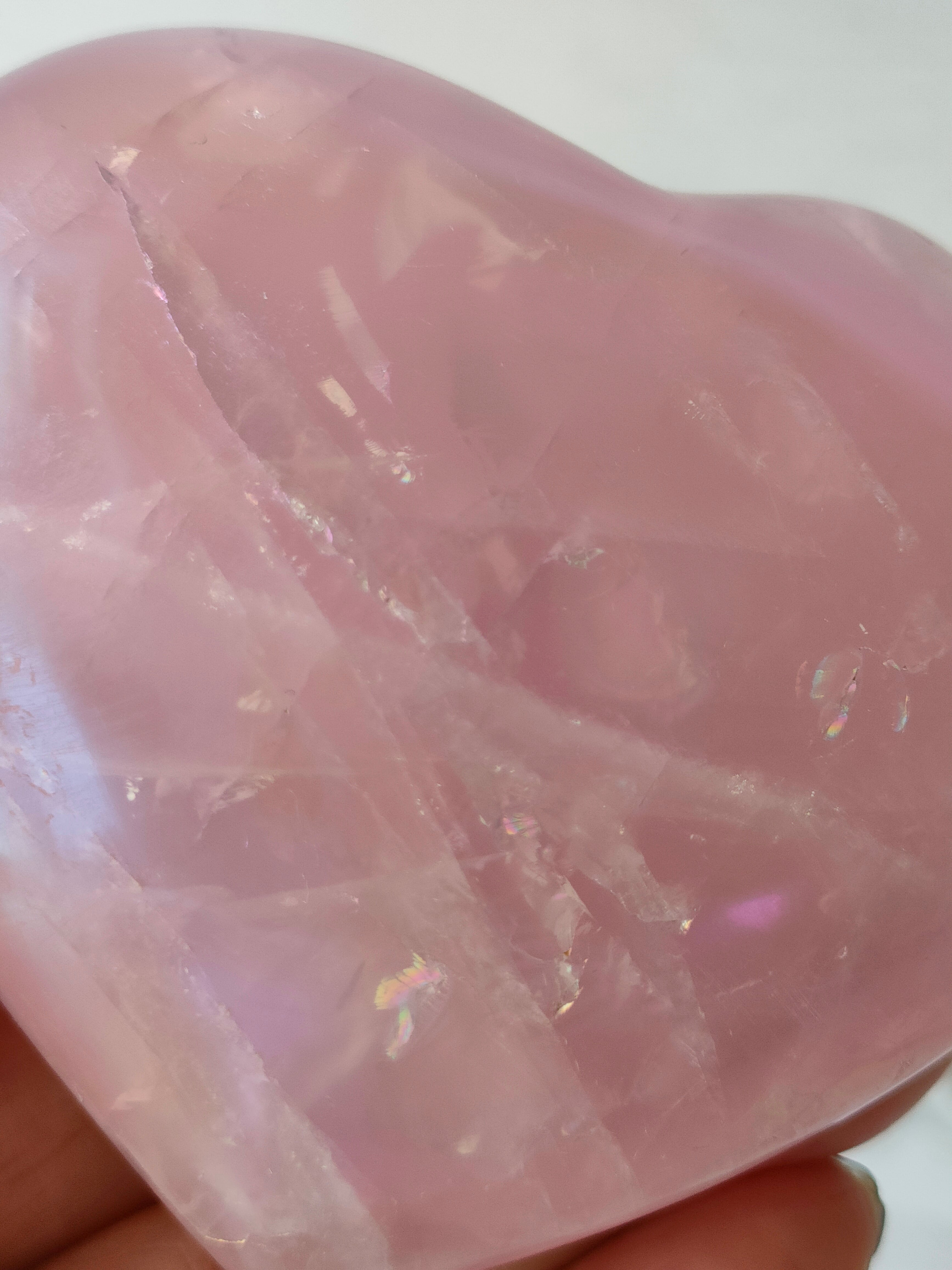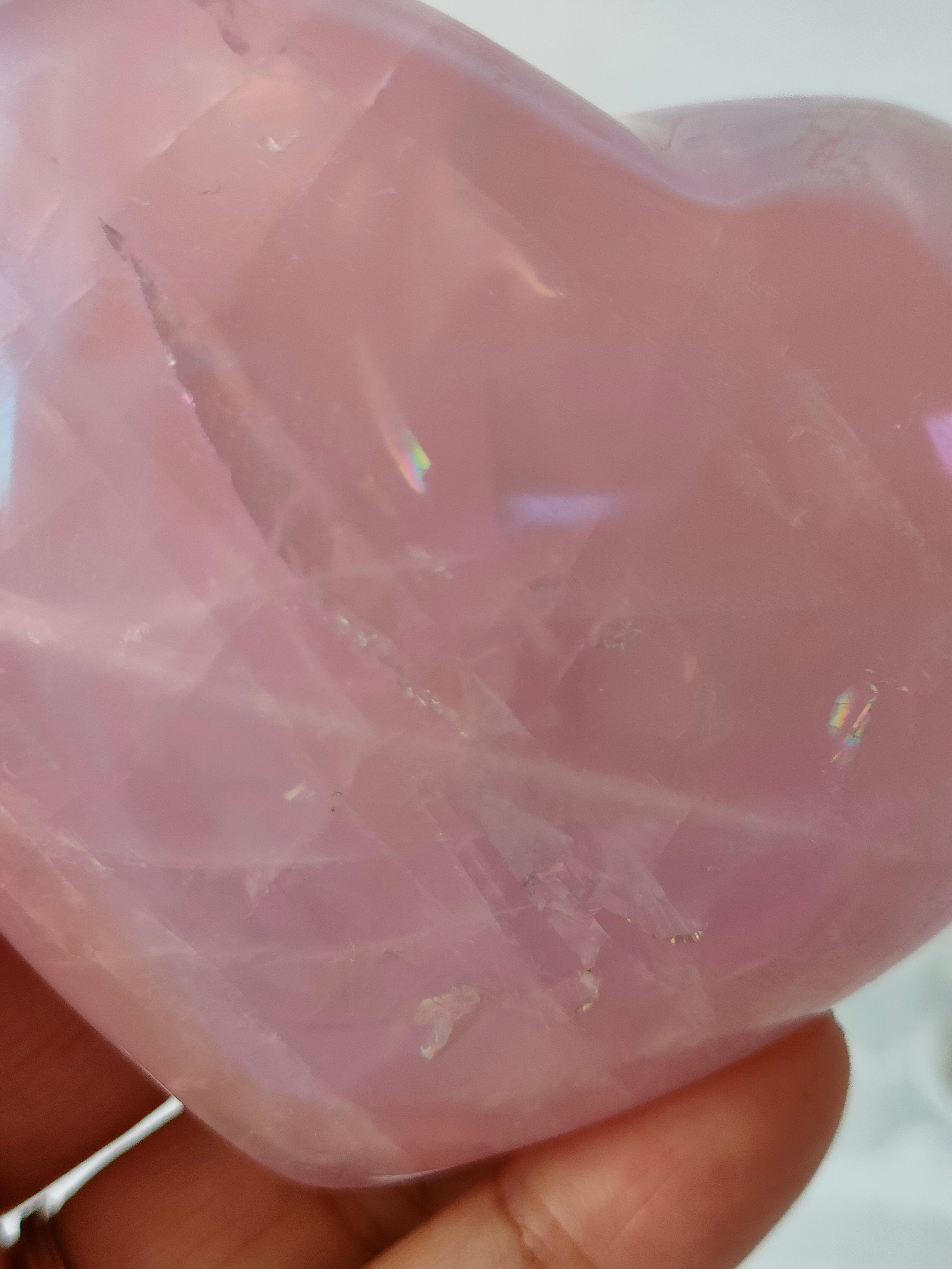 ローズクォーツにオーラ特有の輝きがより可愛らしく、虹もみられます。