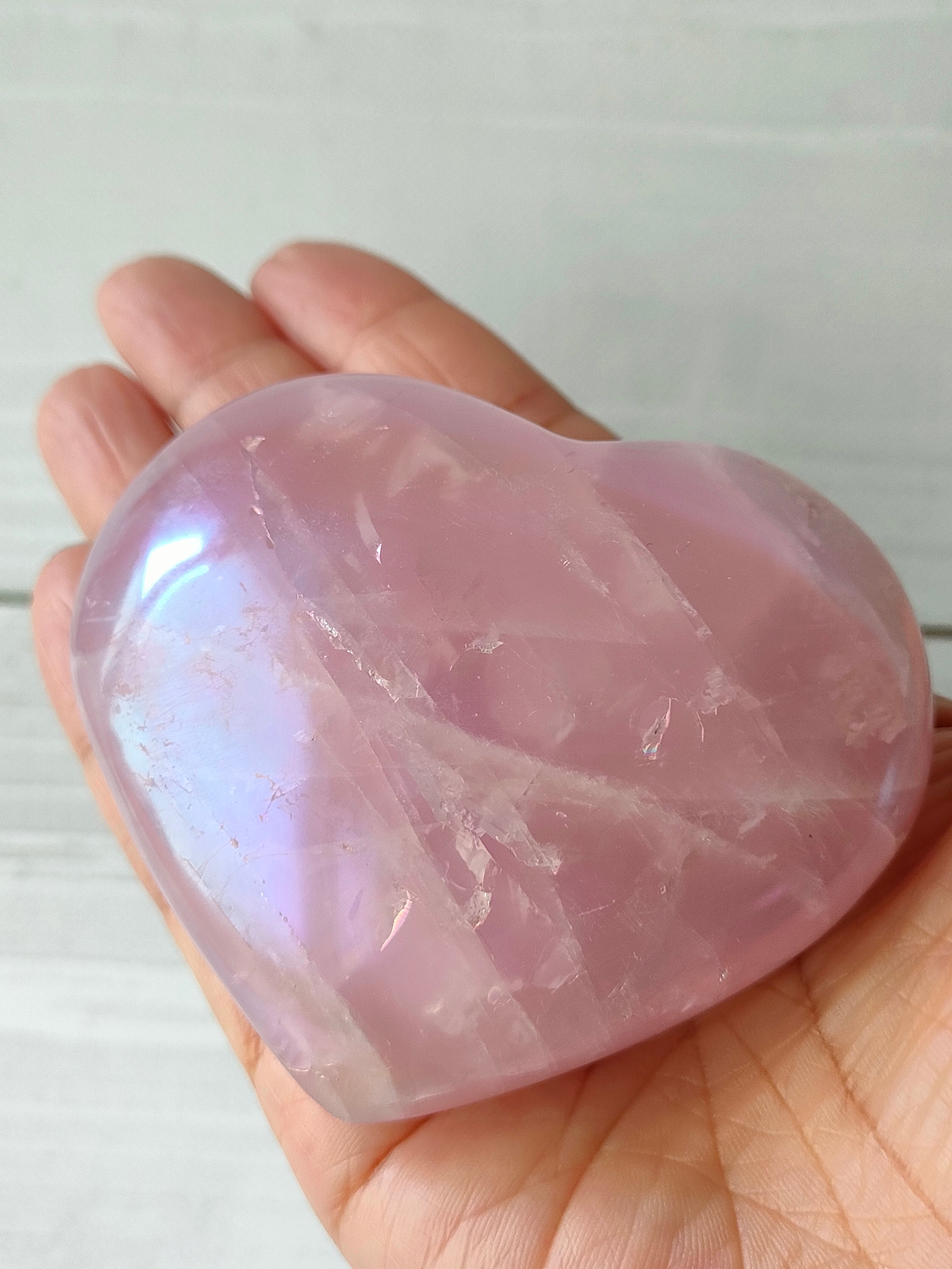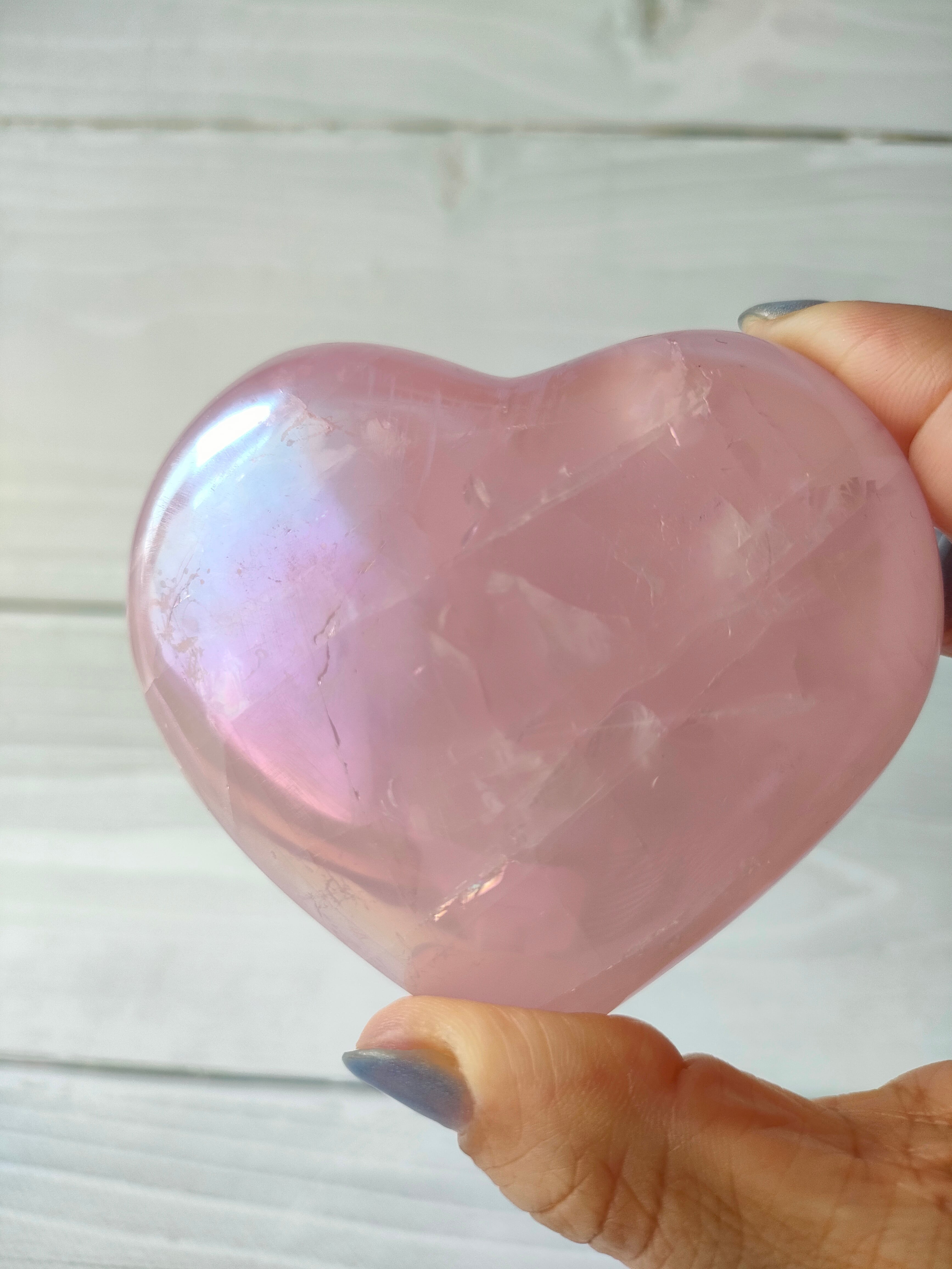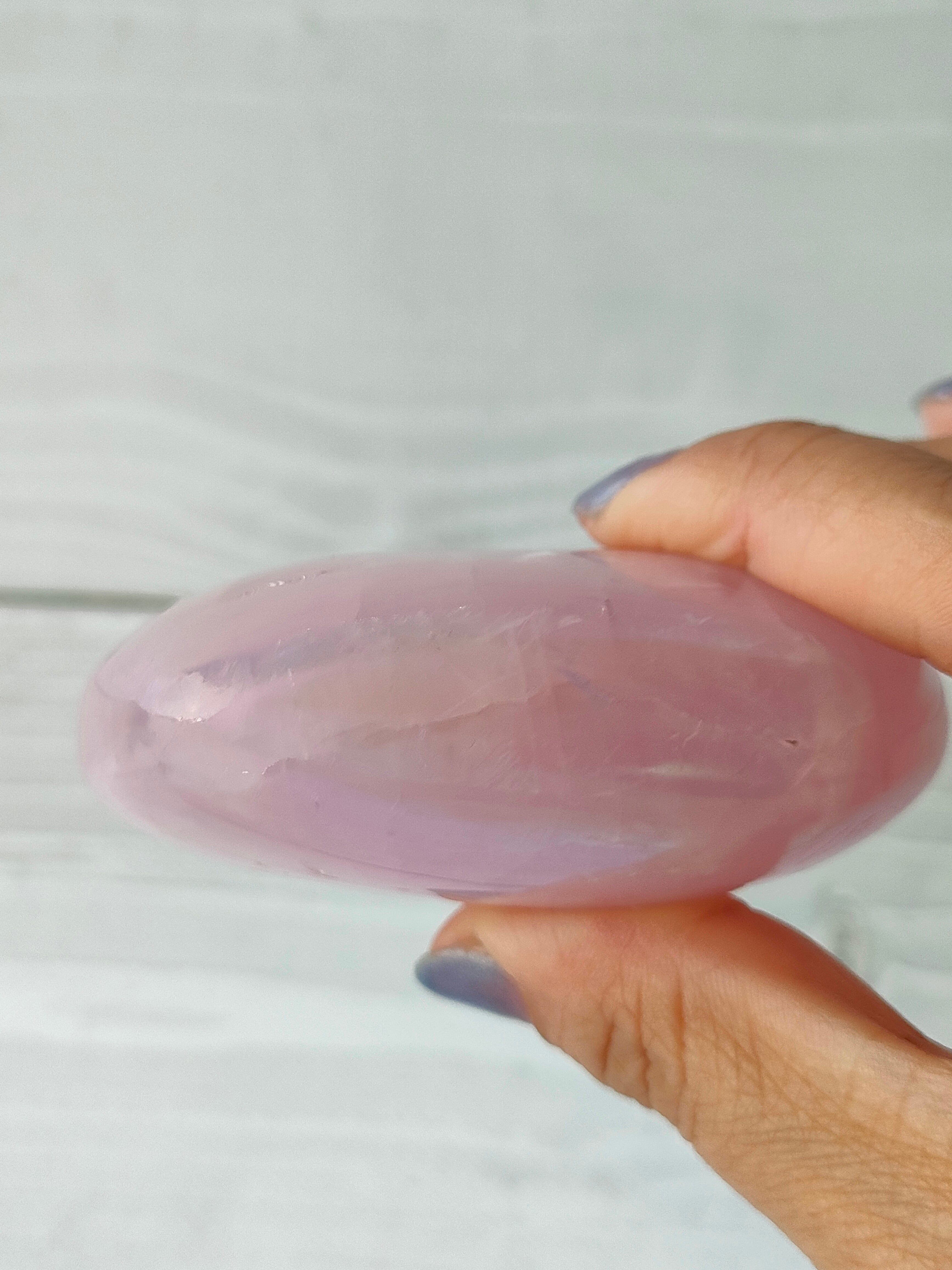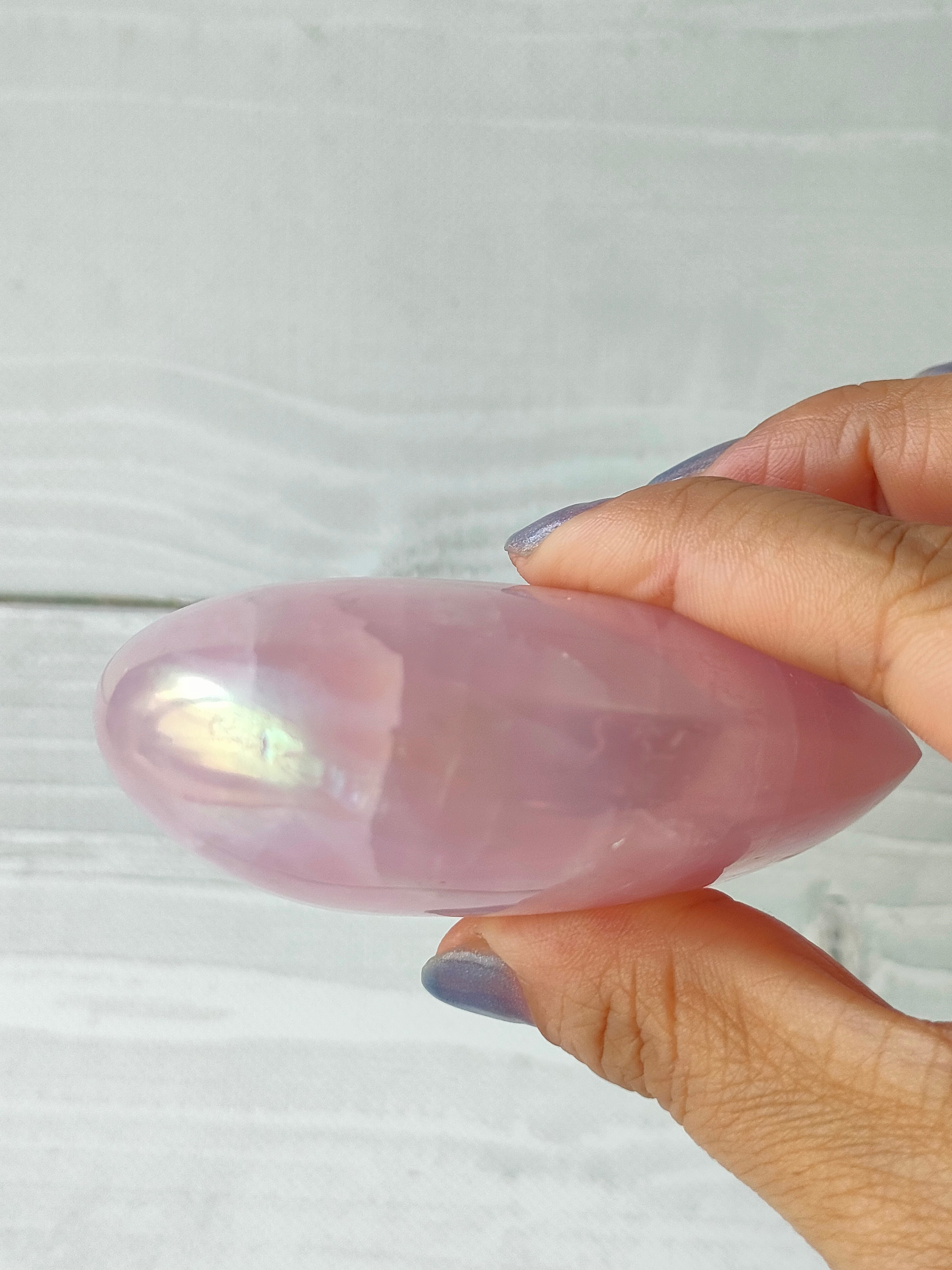 ローズクォーツにオーラ特有の輝きがより可愛らしく、虹もみられます。