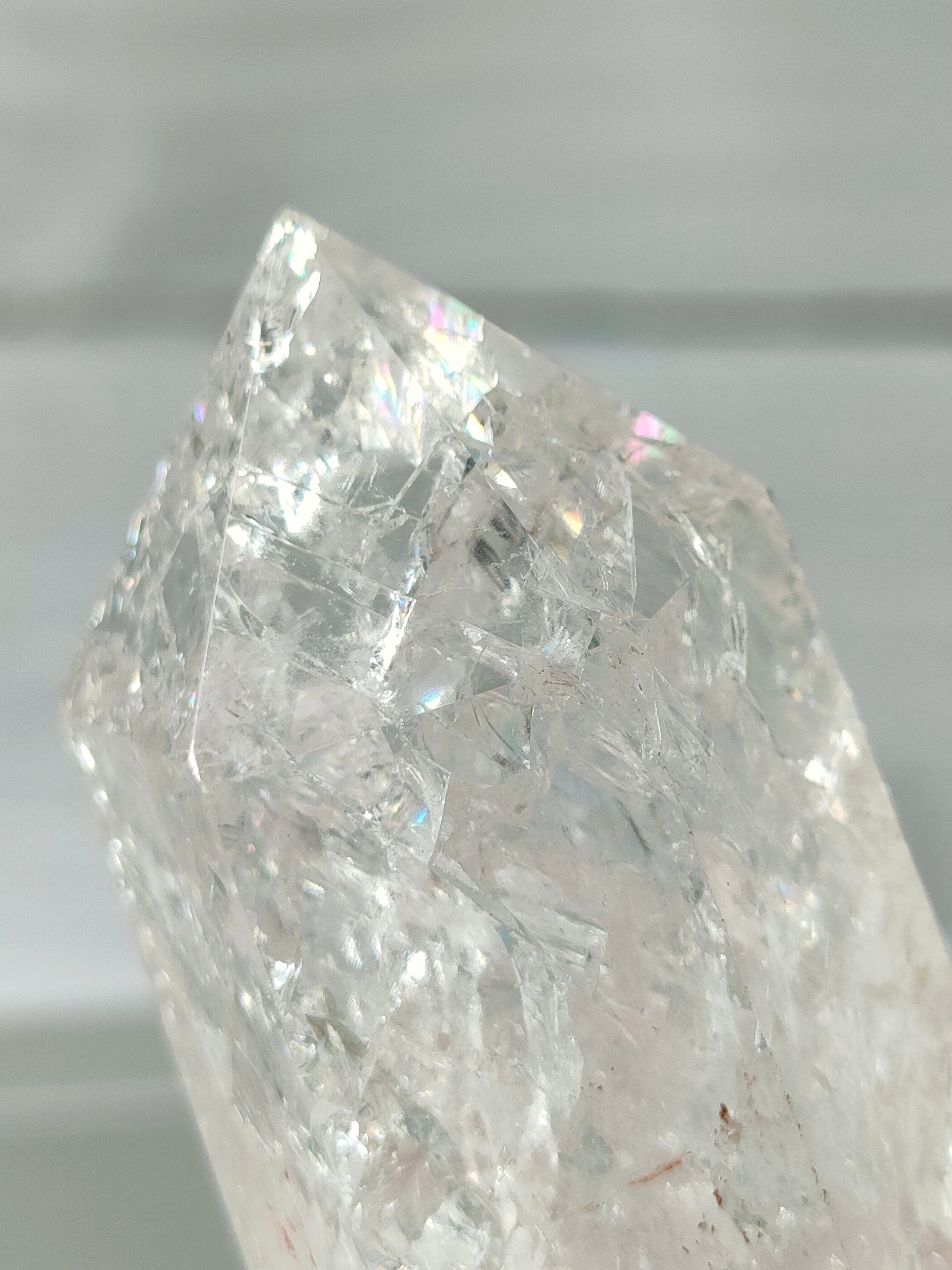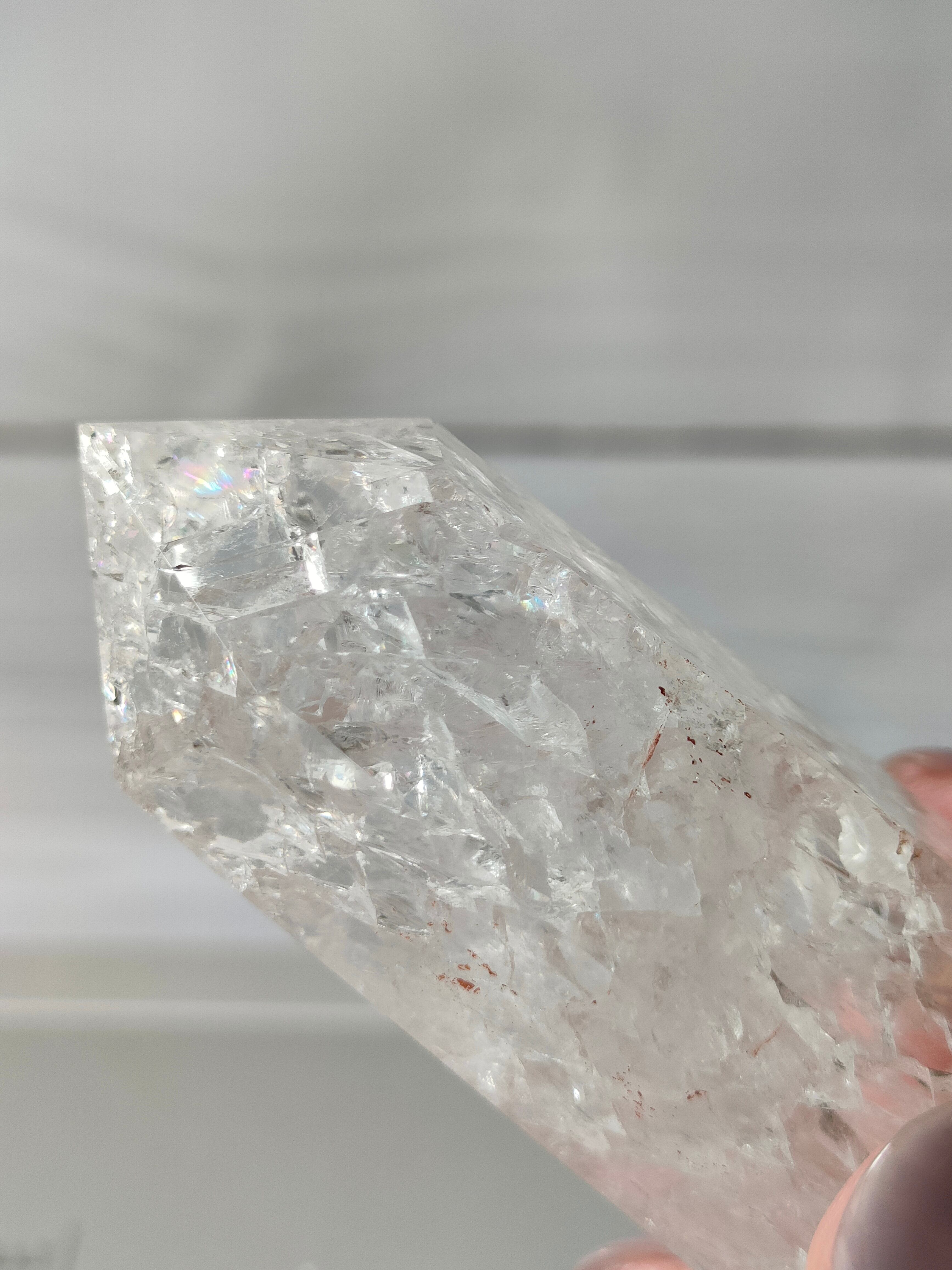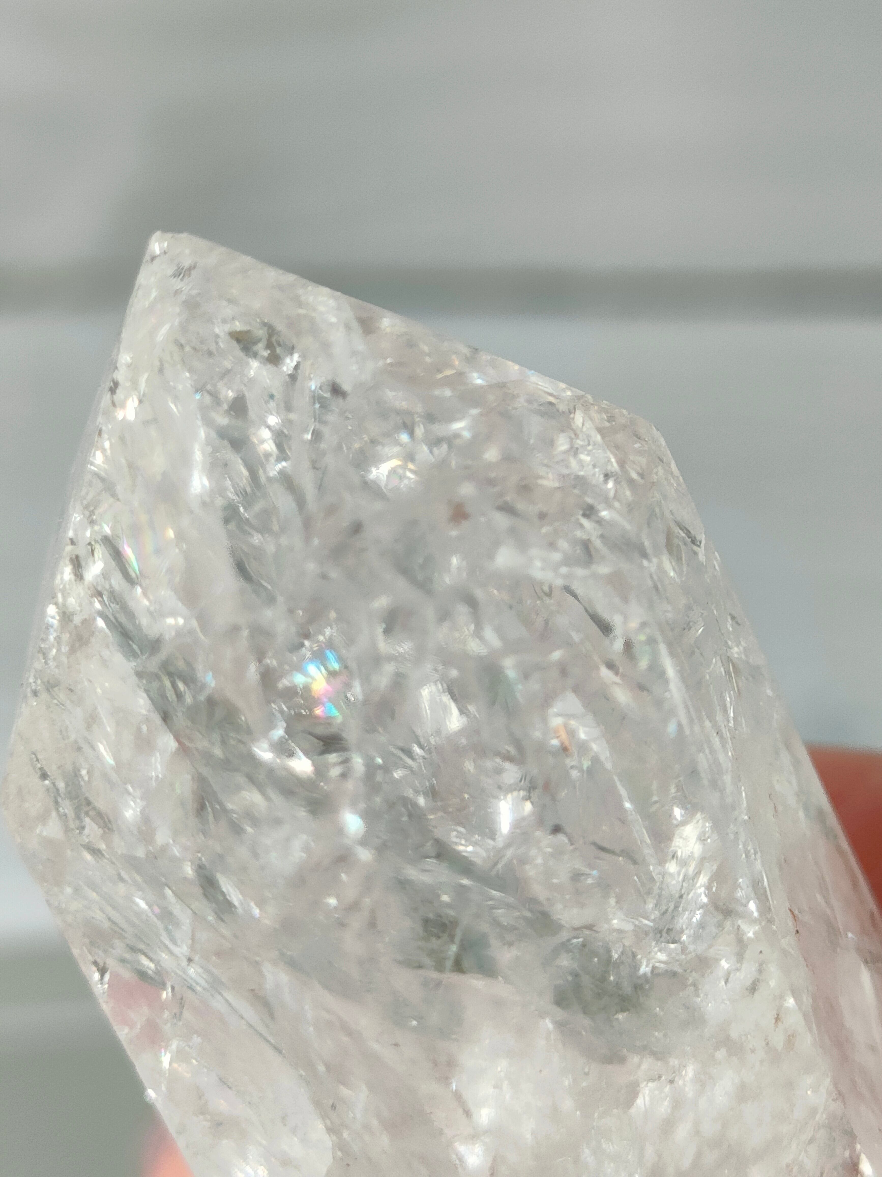 クラッククォーツは、水晶に高温や圧力などを加えて人工的にクラック(ヒビ)を入れています。クラックが出来る事により、虹があちこちにみられます。