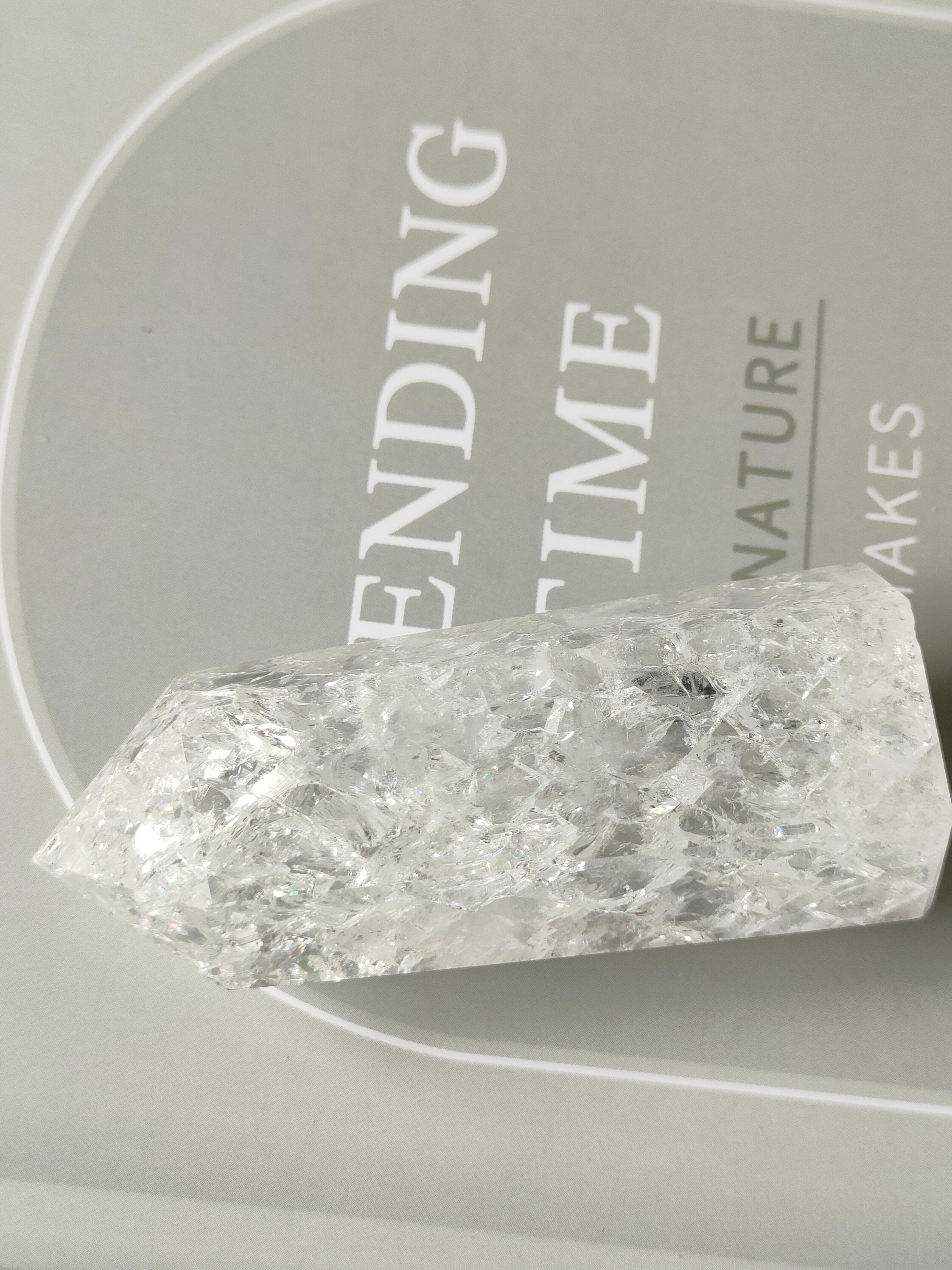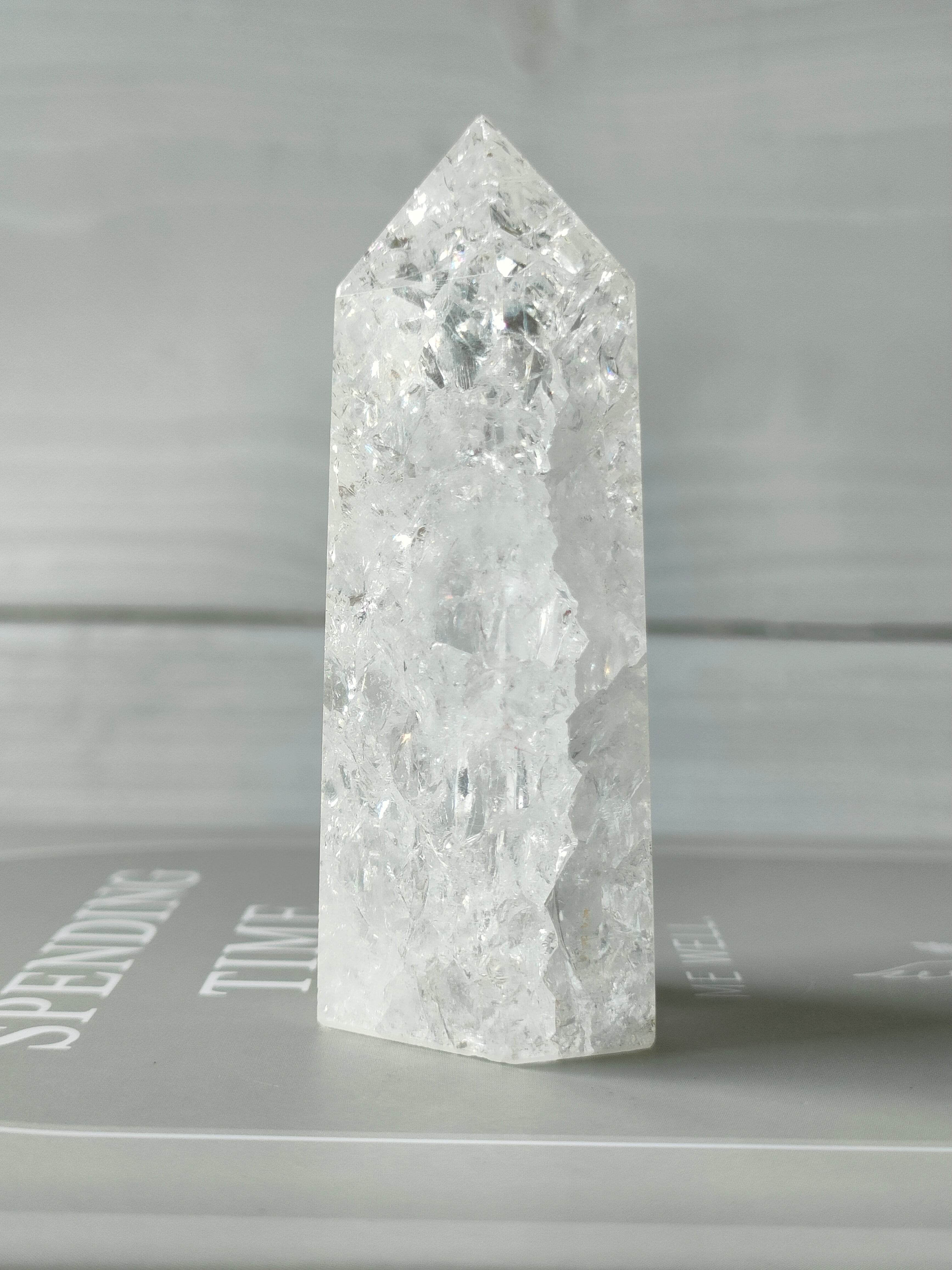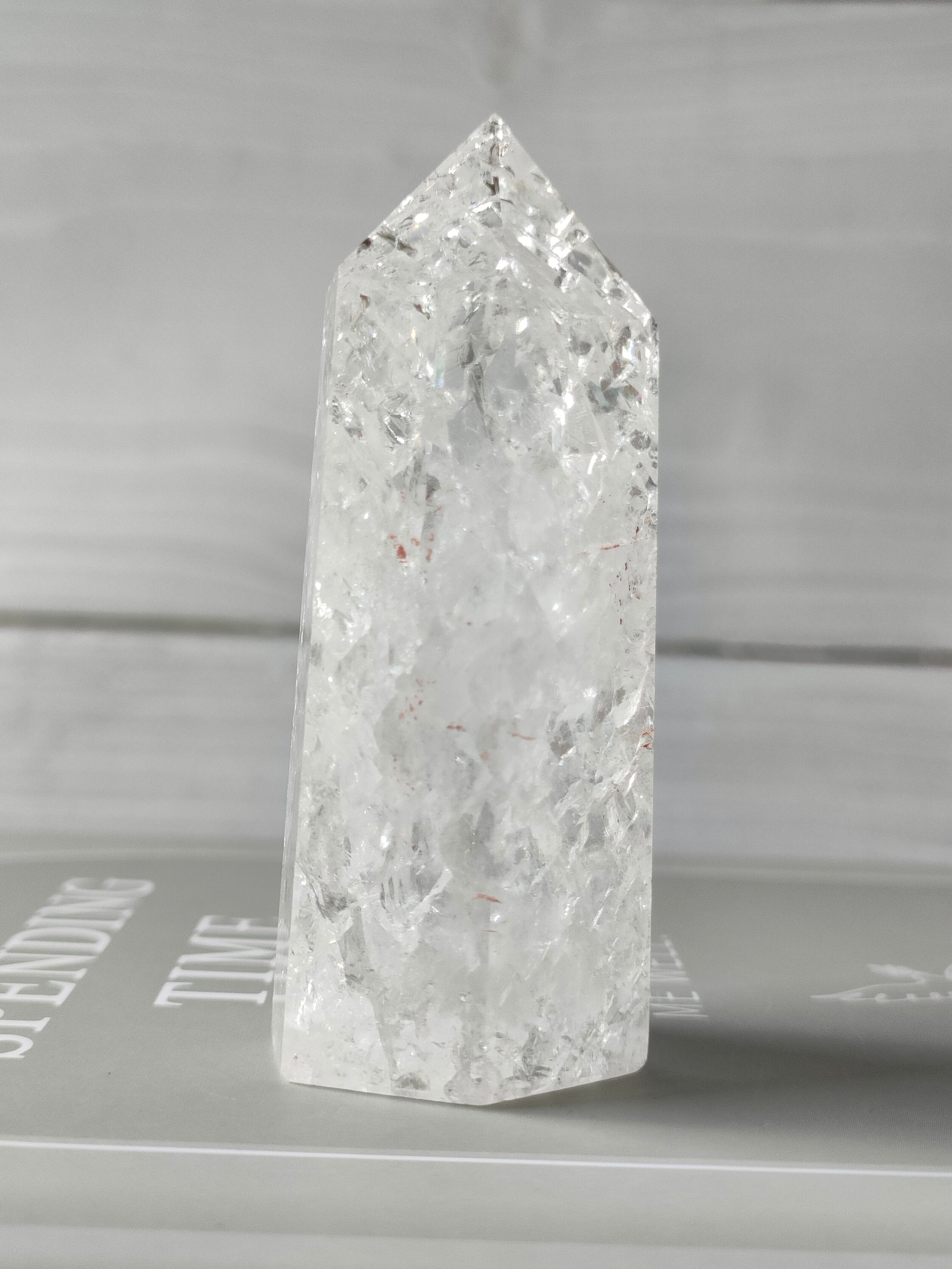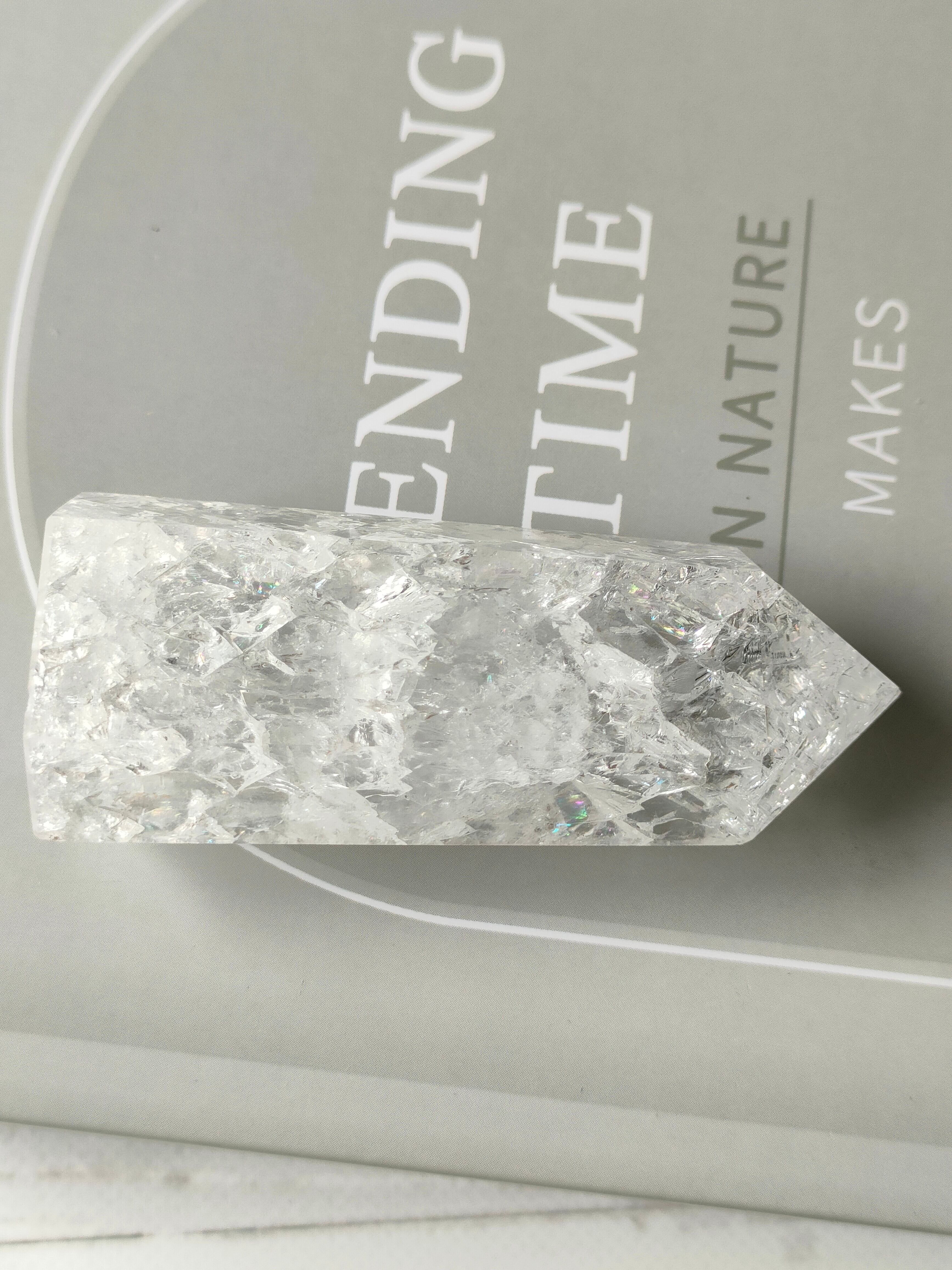クラッククォーツは、水晶に高温や圧力などを加えて人工的にクラック(ヒビ)を入れています。クラックが出来る事により、虹があちこちにみられます。