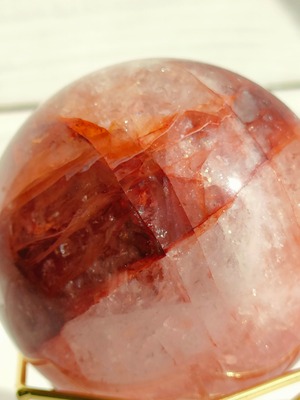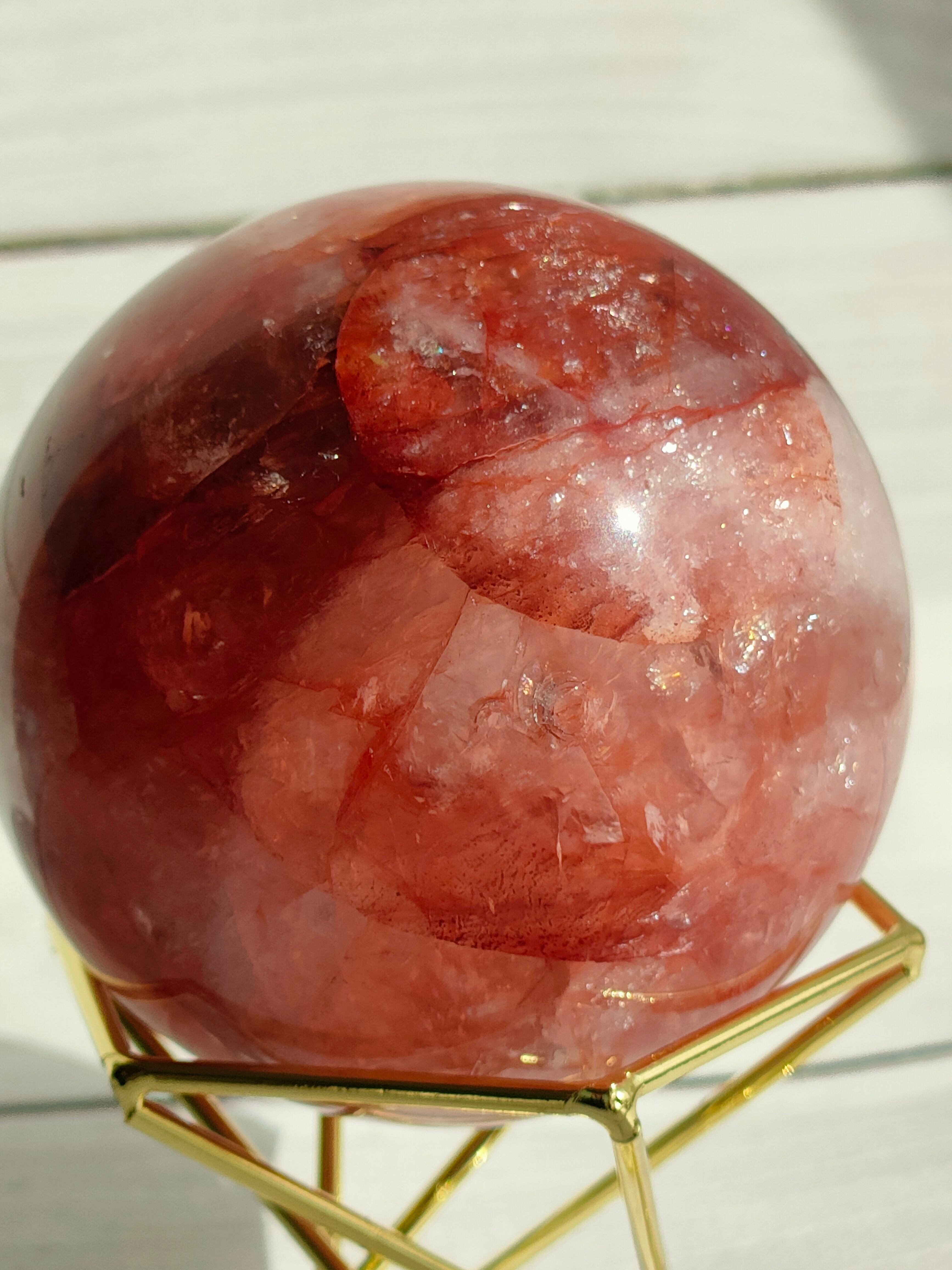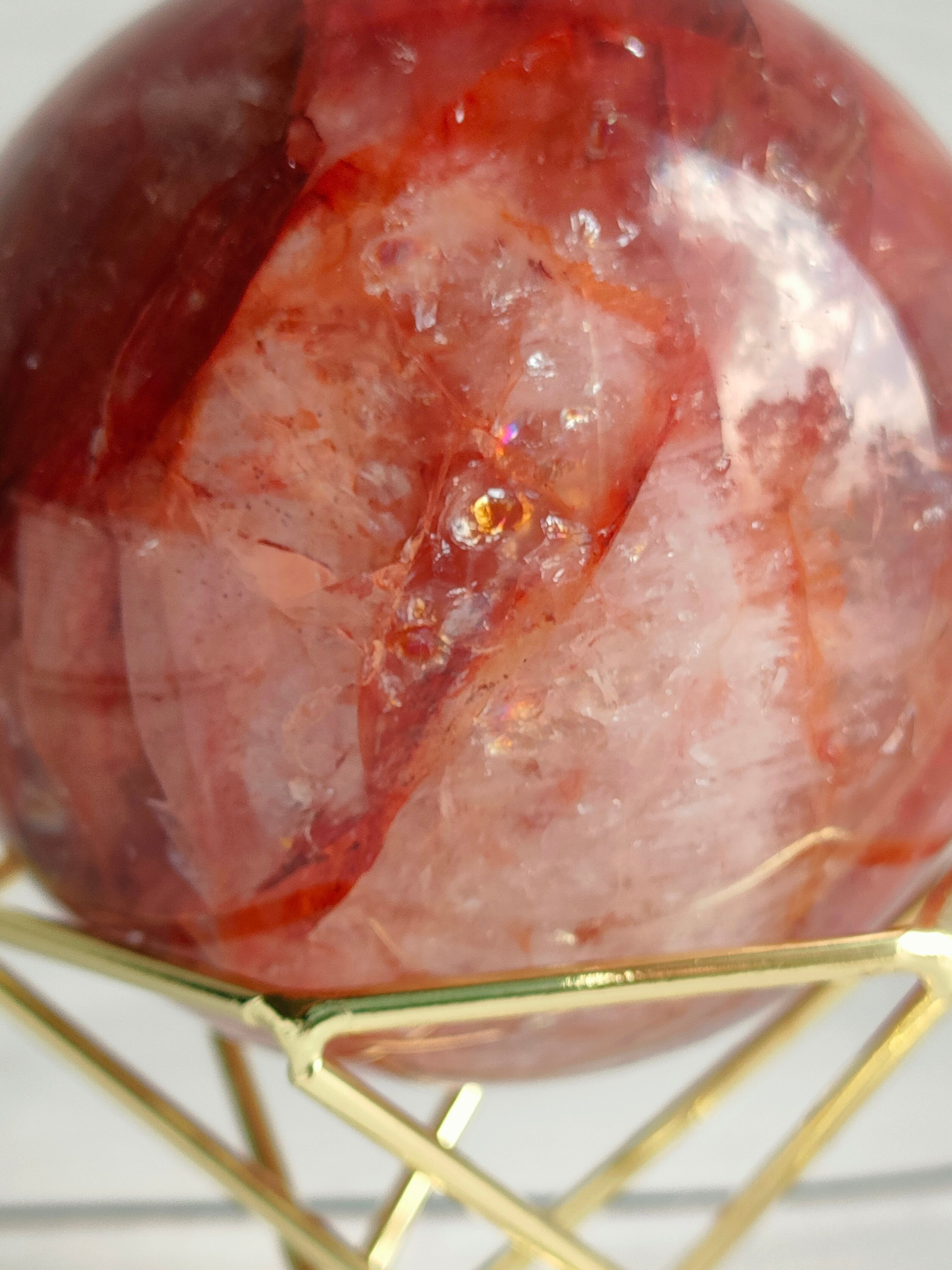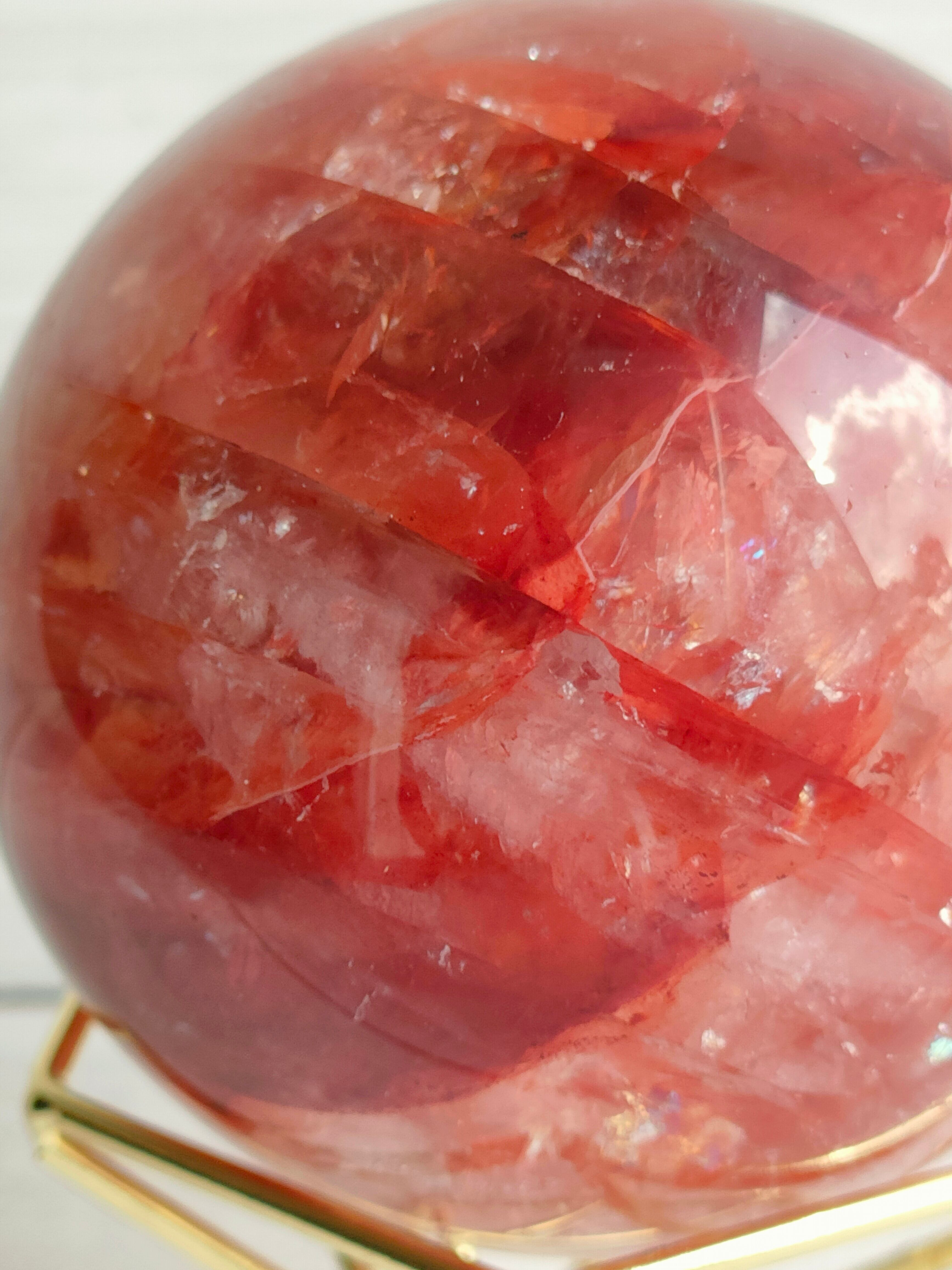 透明度ある水晶に赤色が情熱的で、あちこちから虹や輝きがみられます。