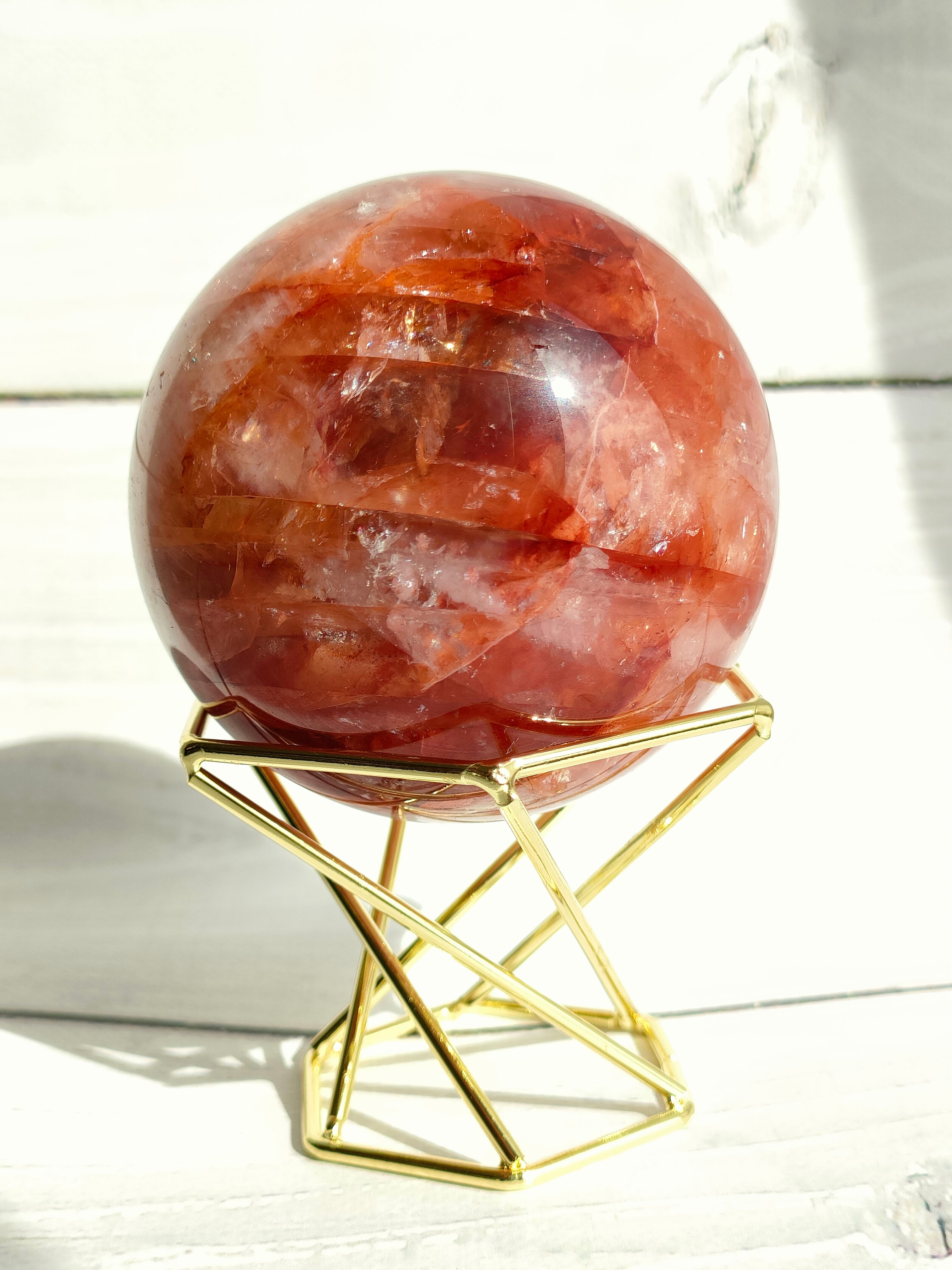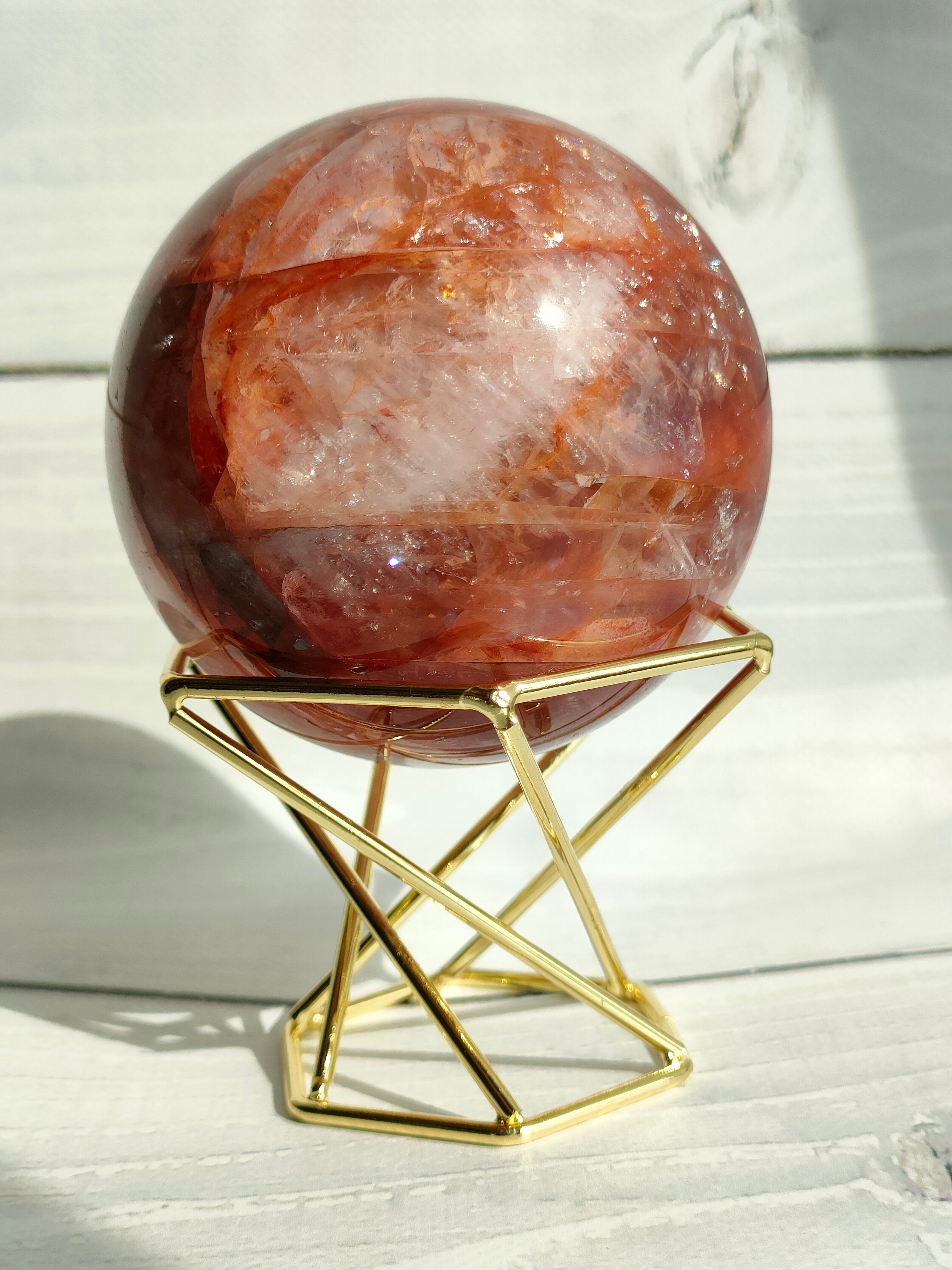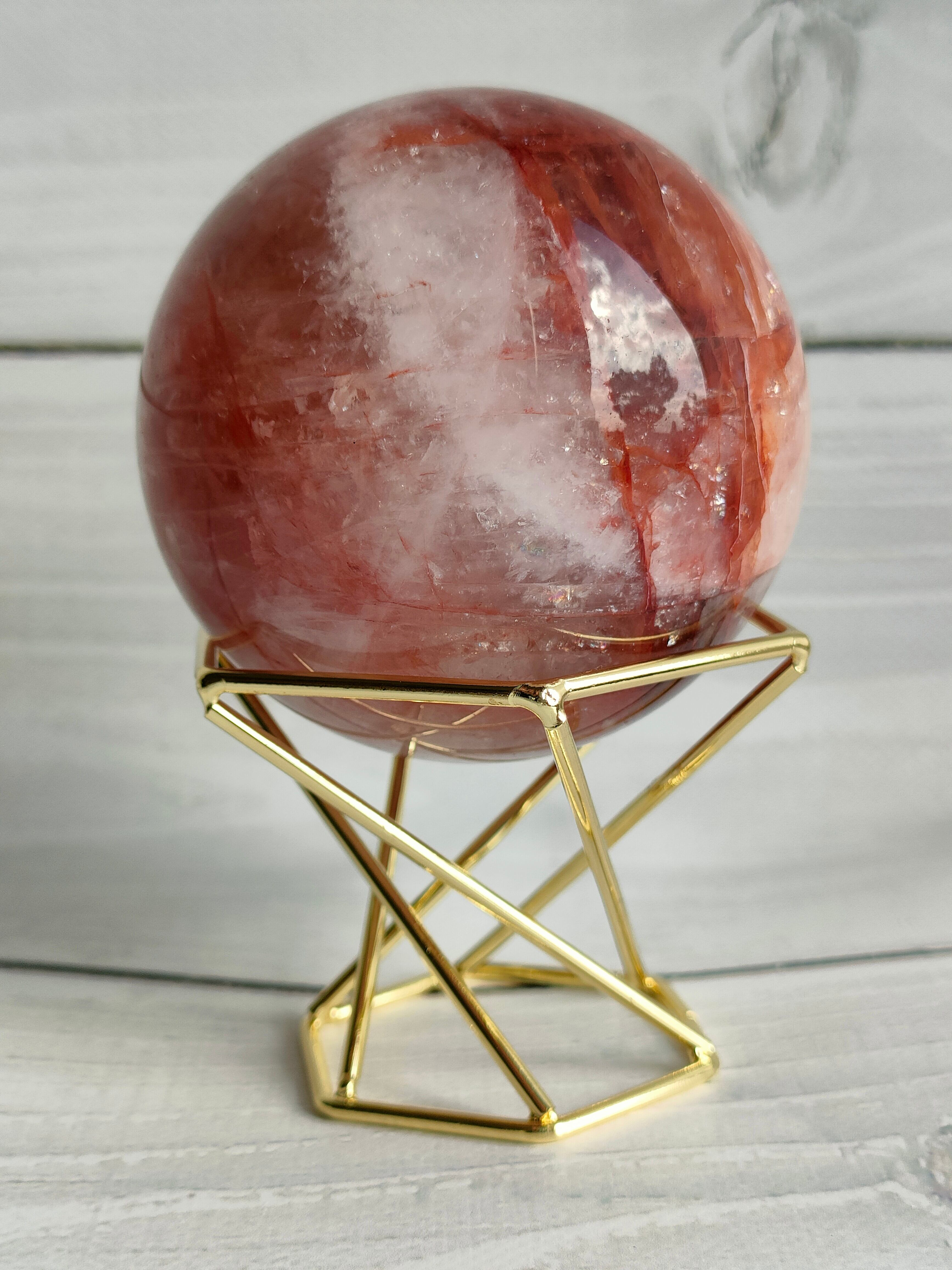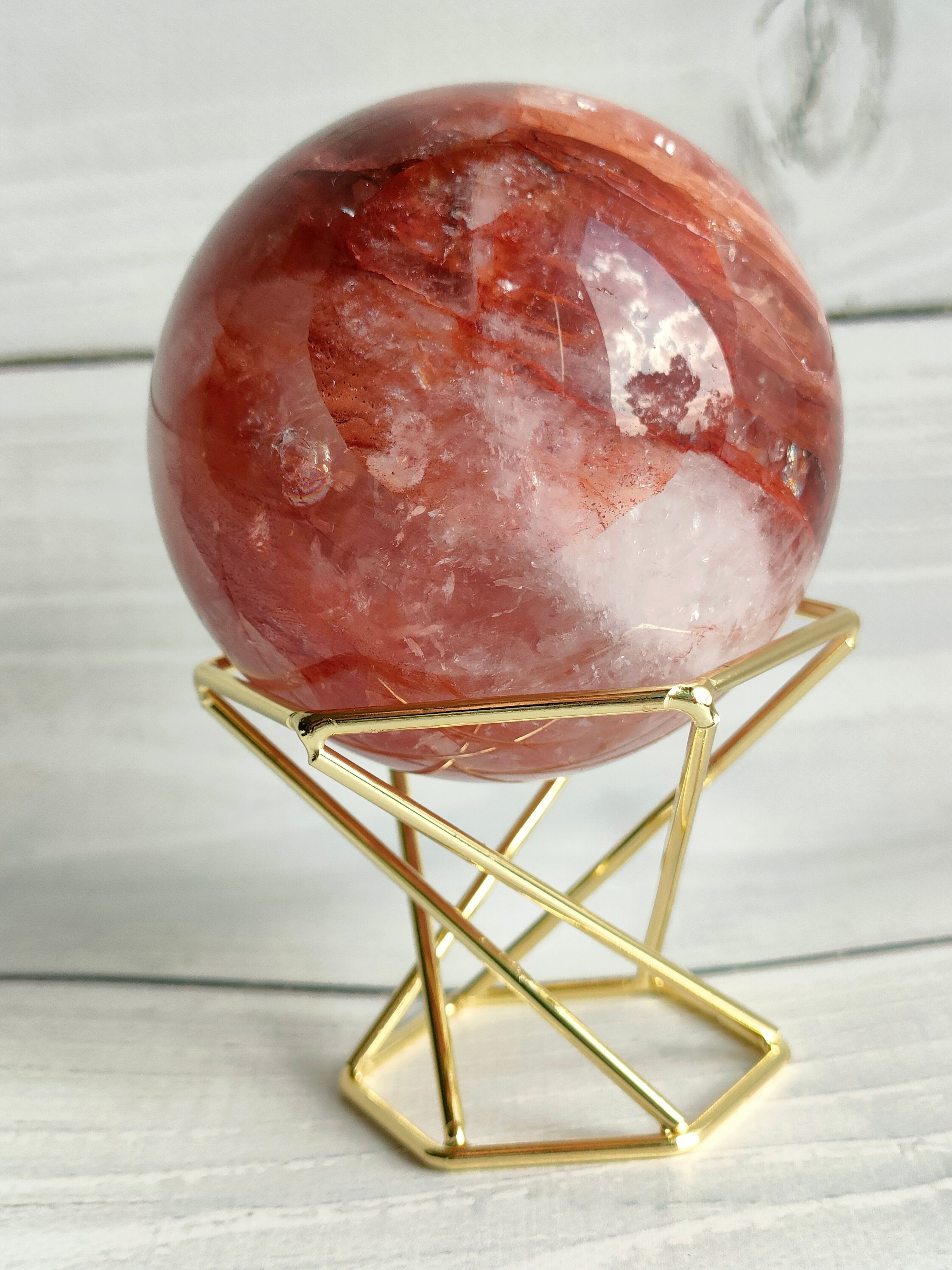 透明度ある水晶に赤色が情熱的で、あちこちから虹や輝きがみられます。