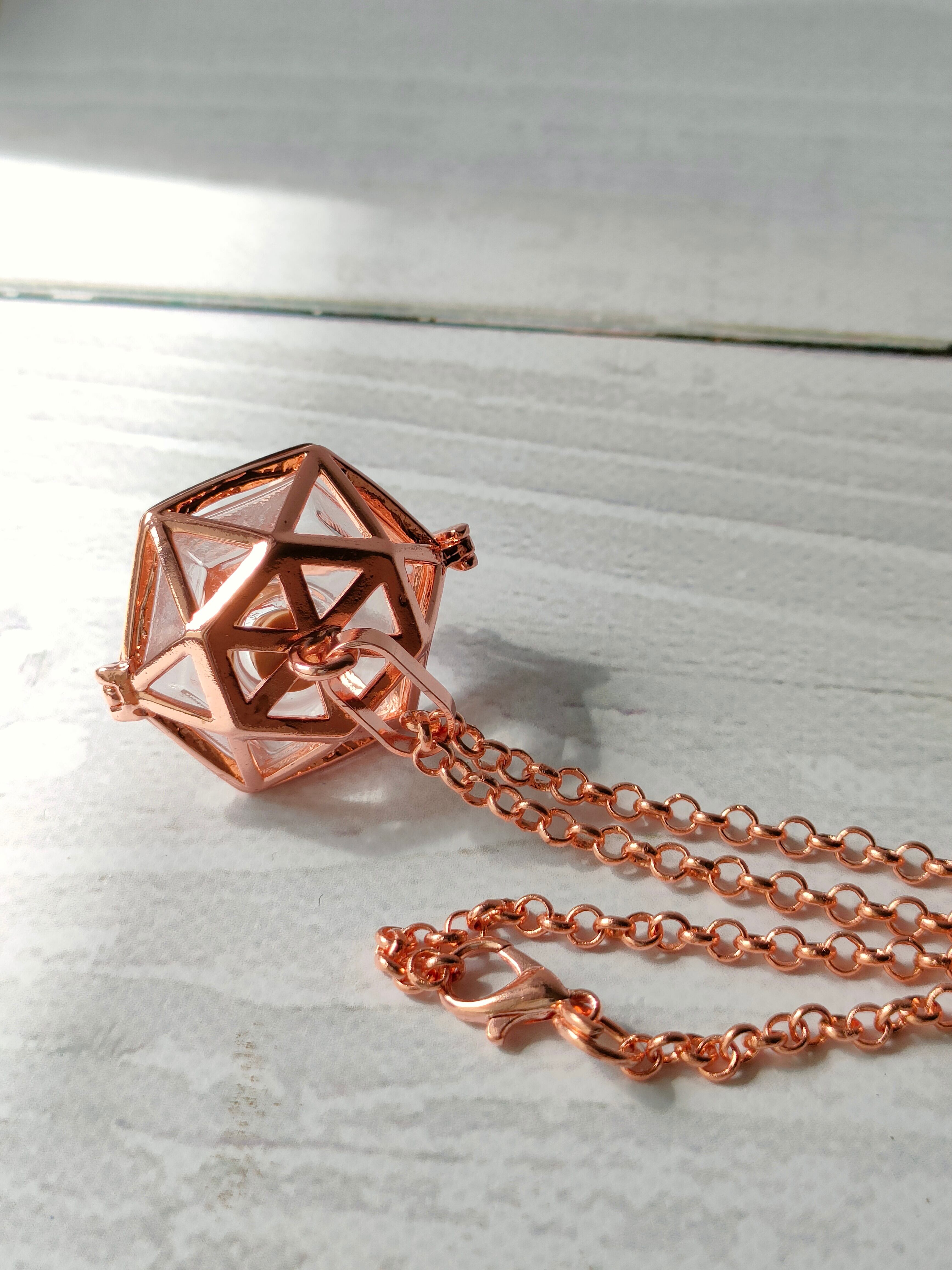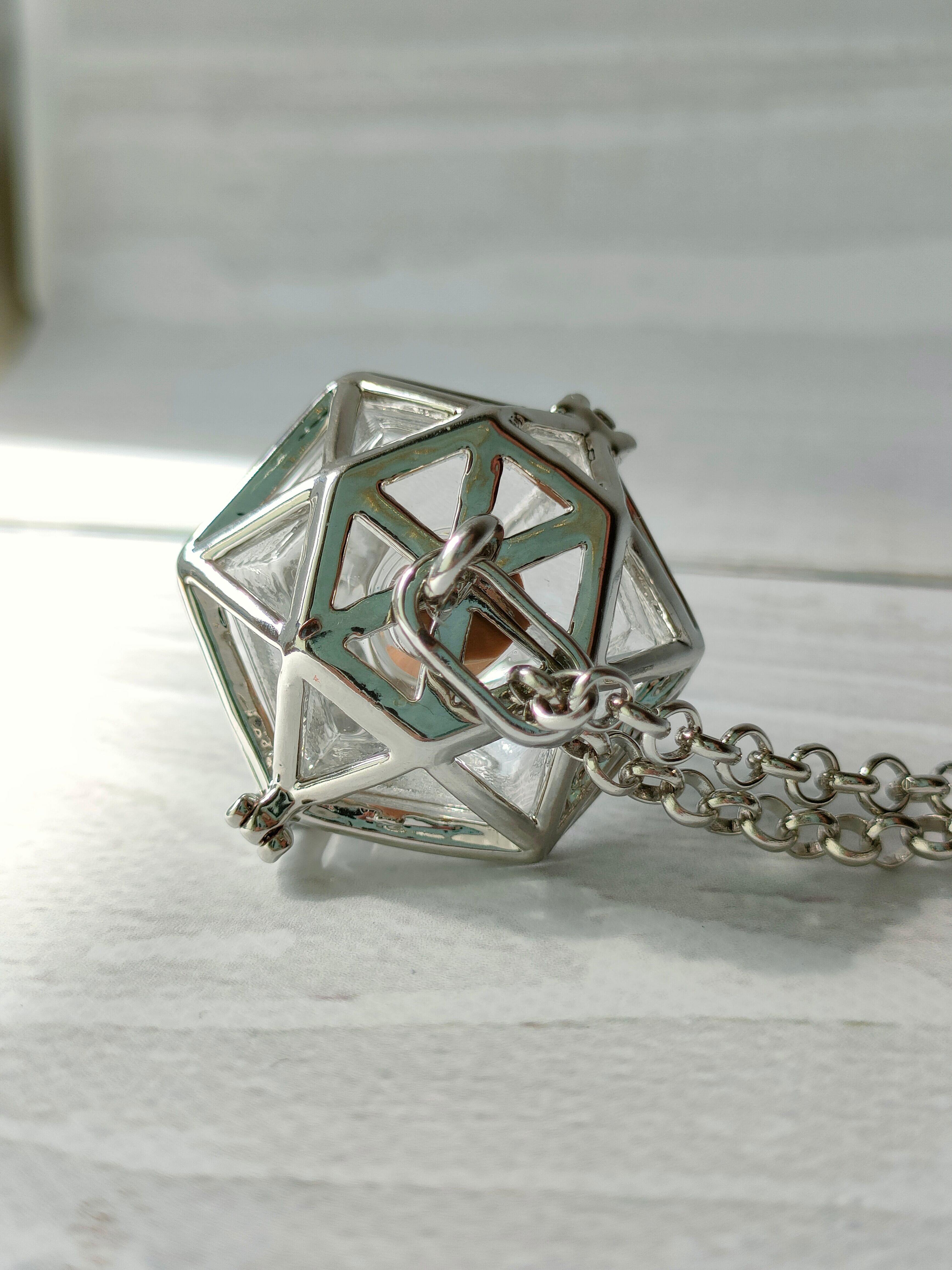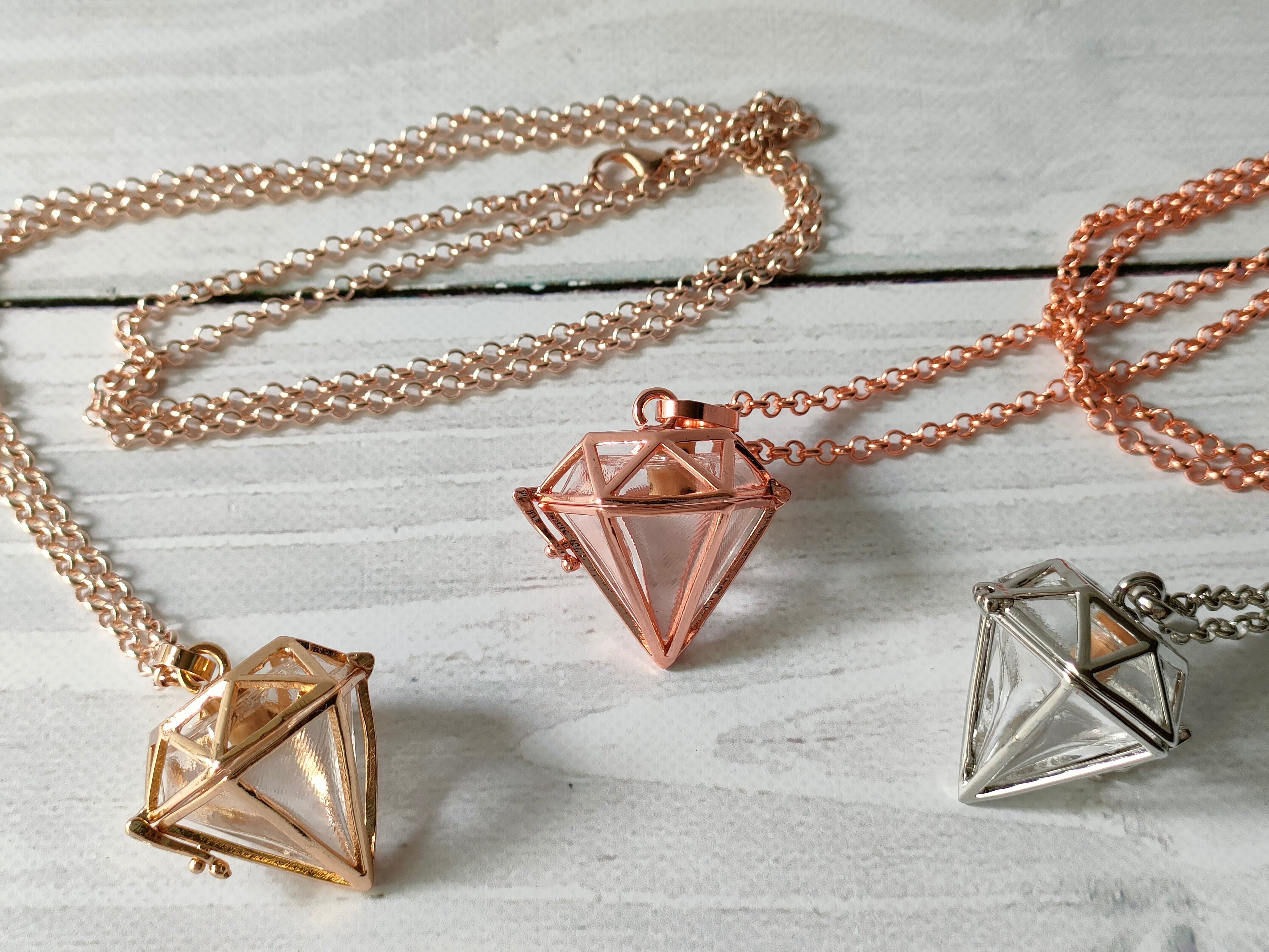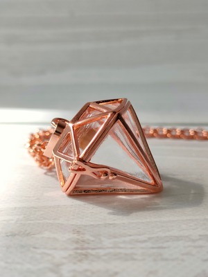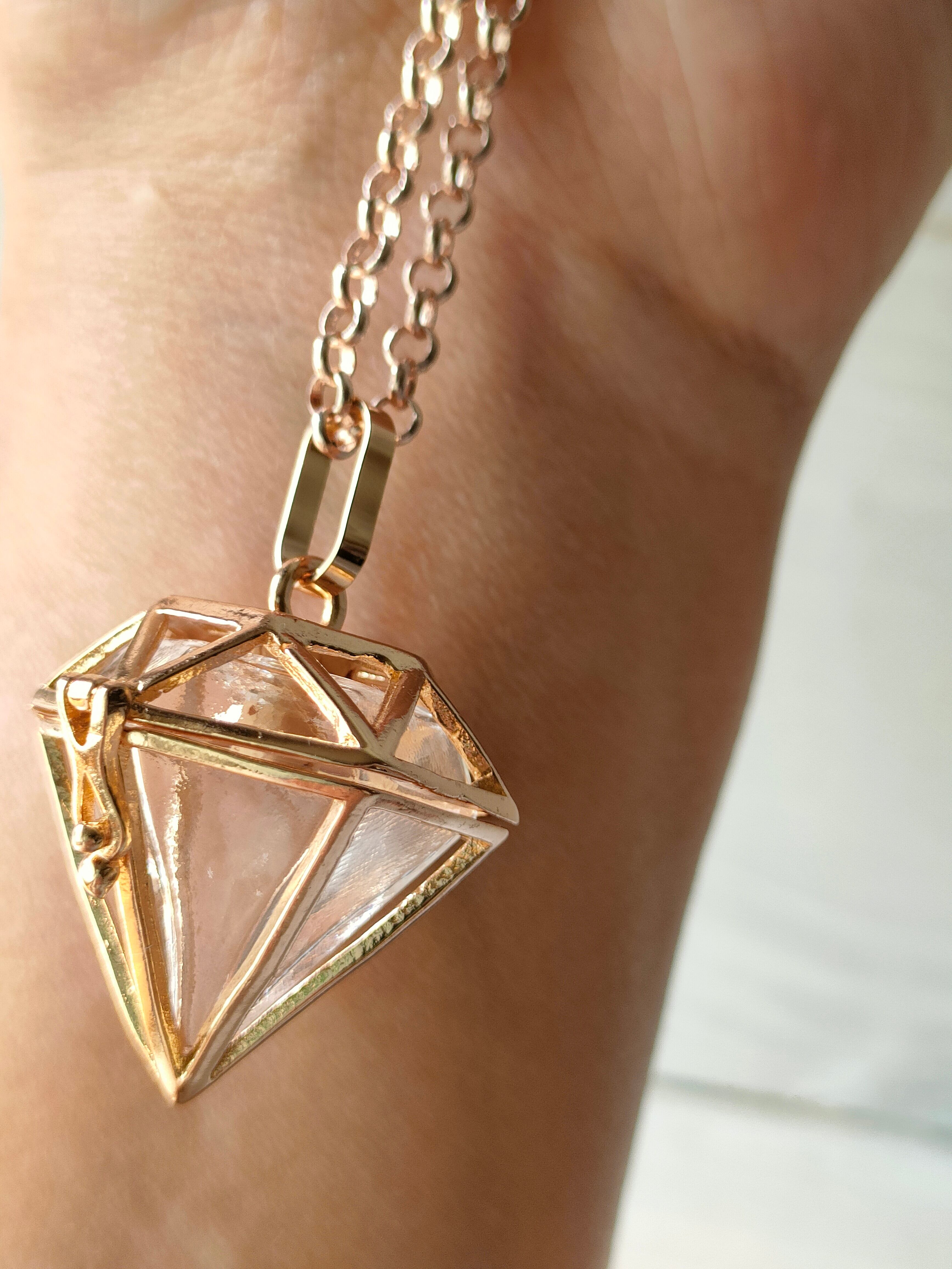 ケージの中に小さな鉱石を入れて持ち歩くことができるネックレスです。ダイヤモンドカットを型どった形がかわいい♡