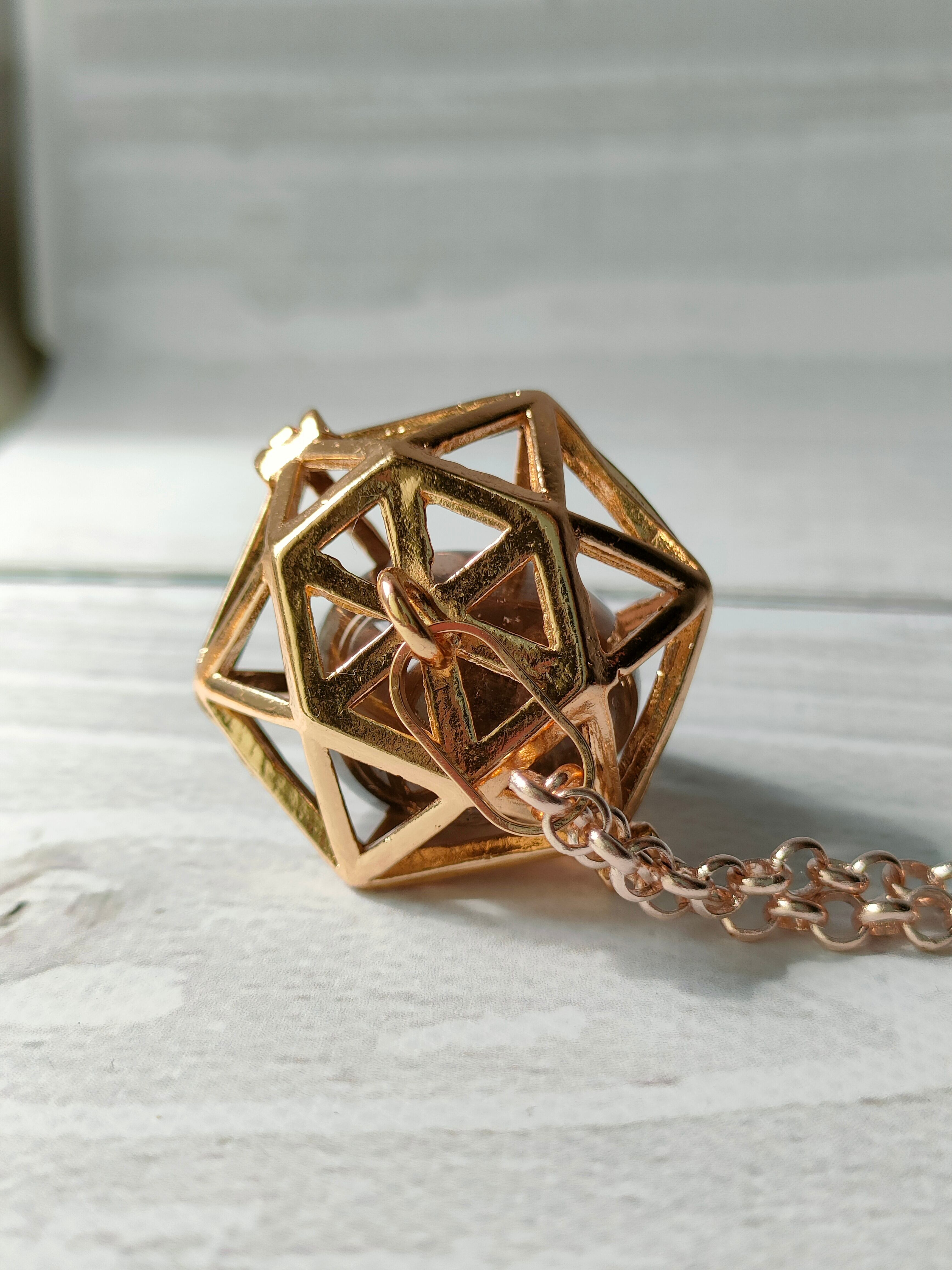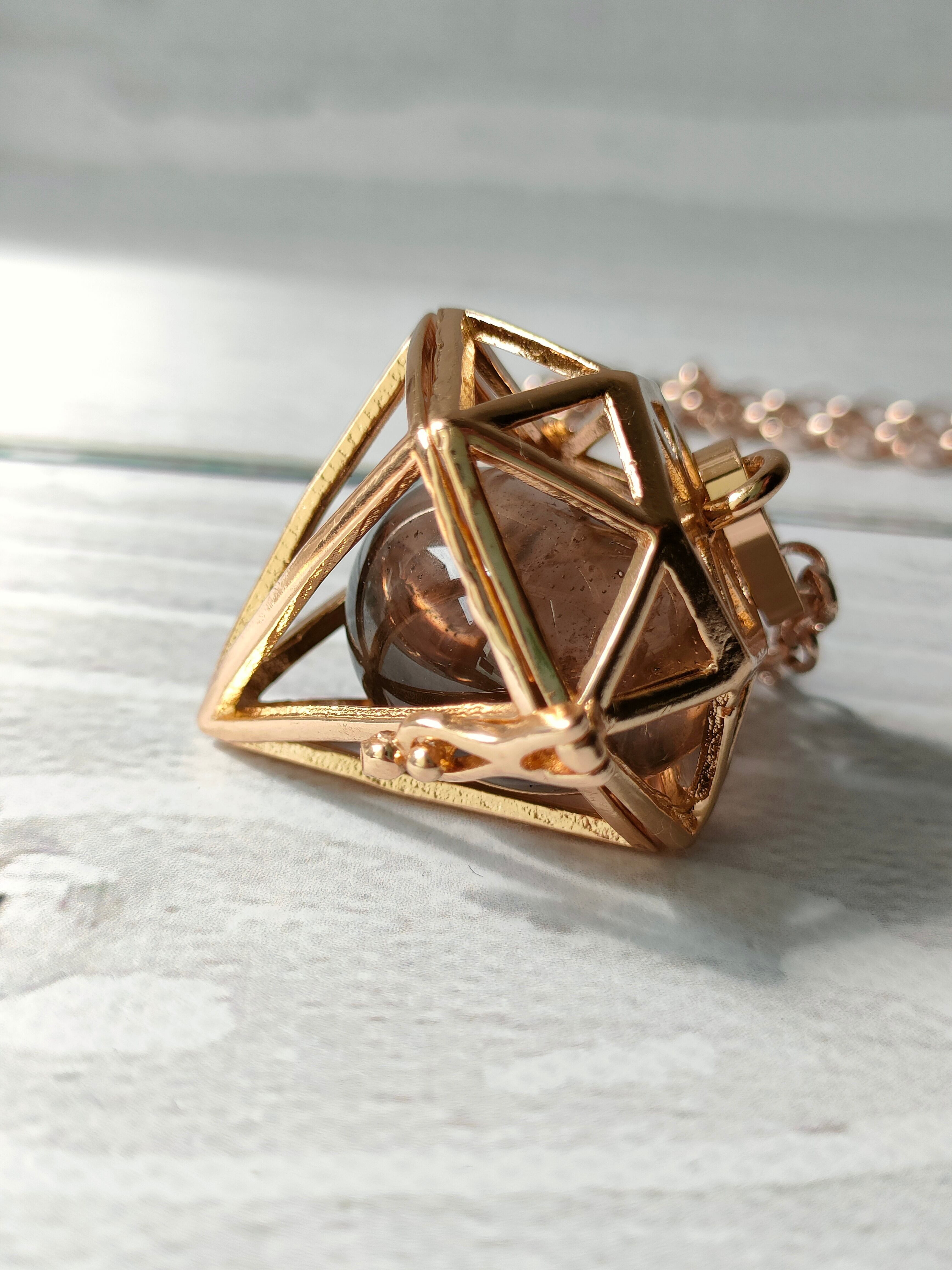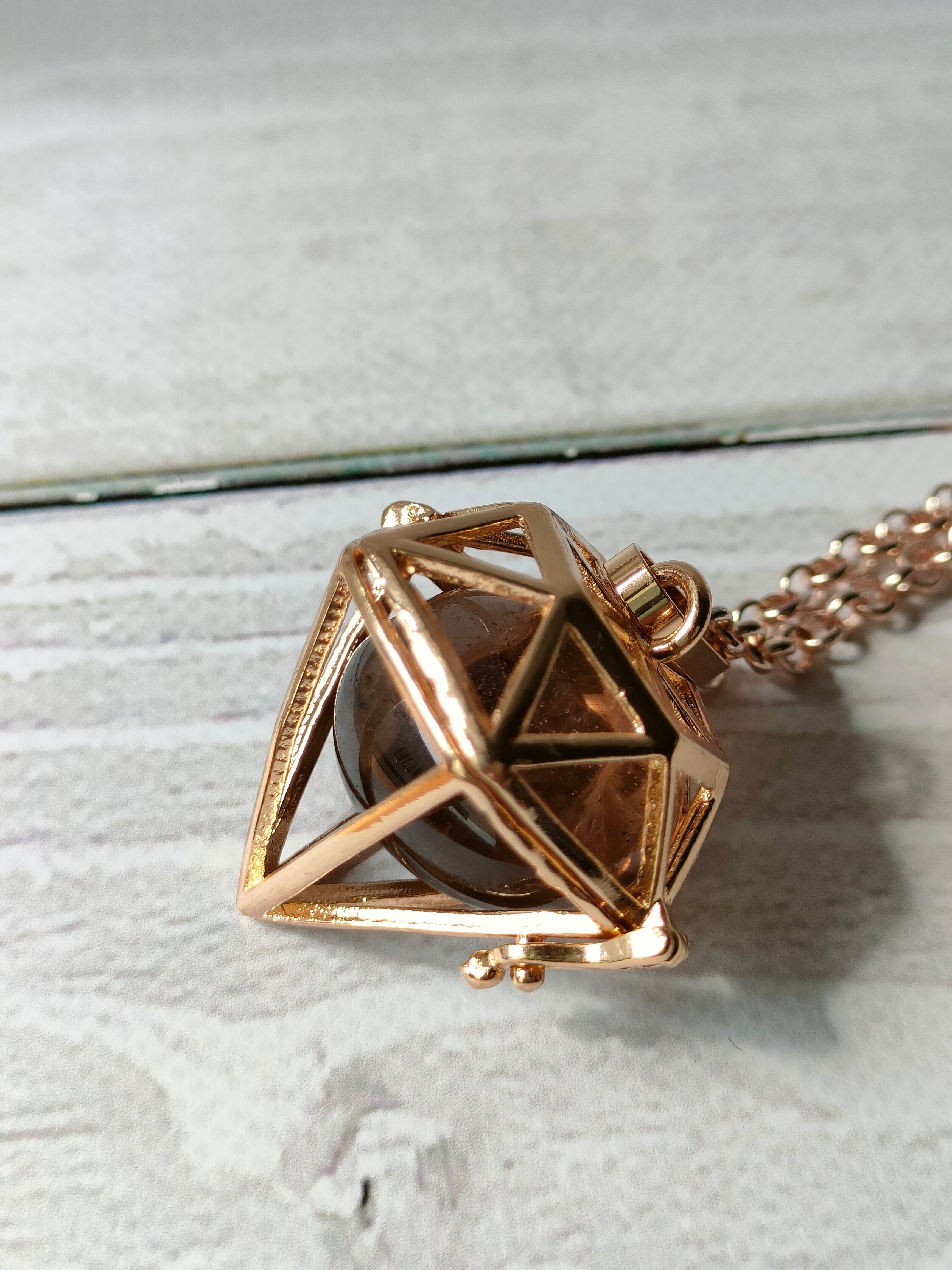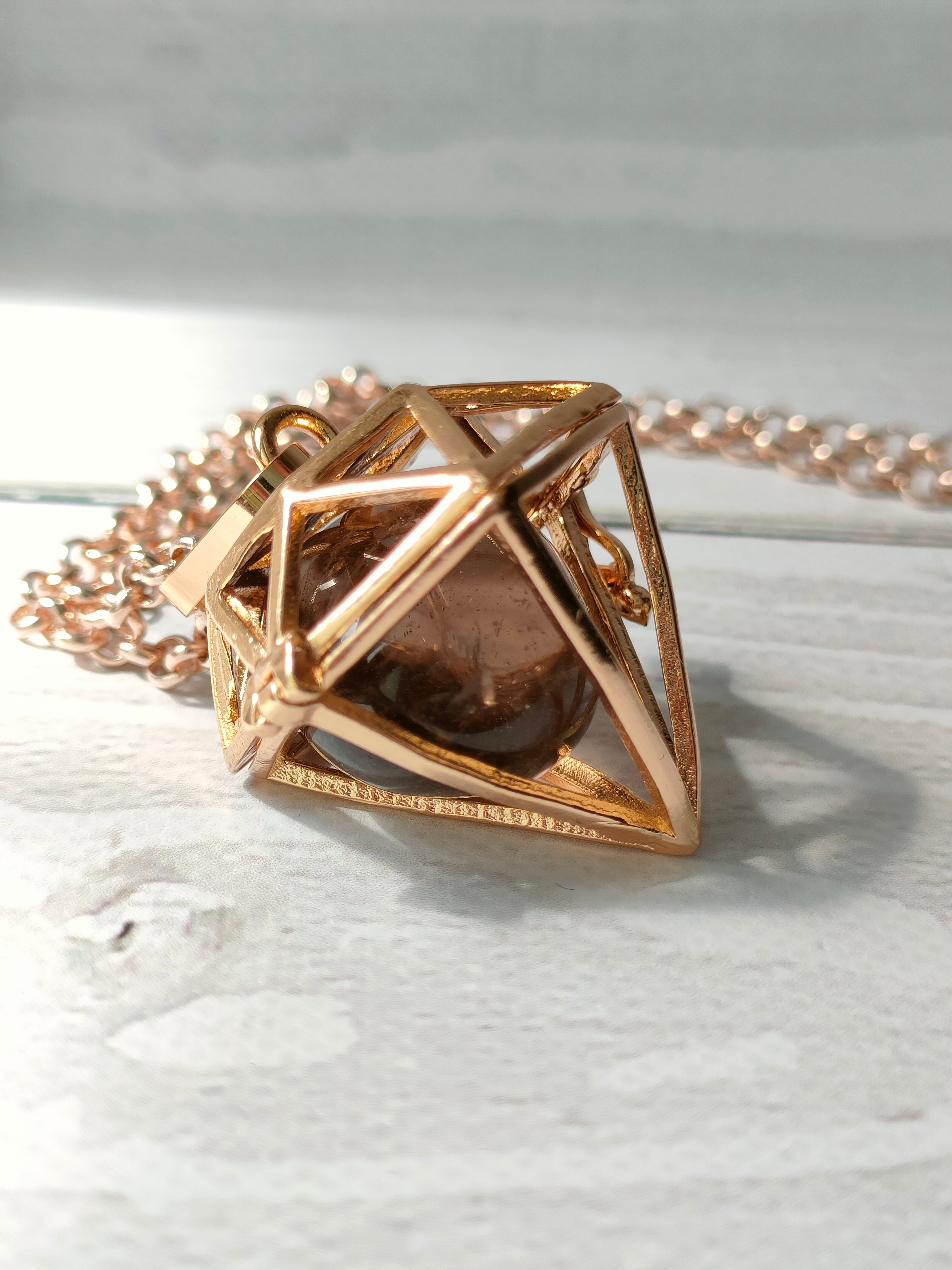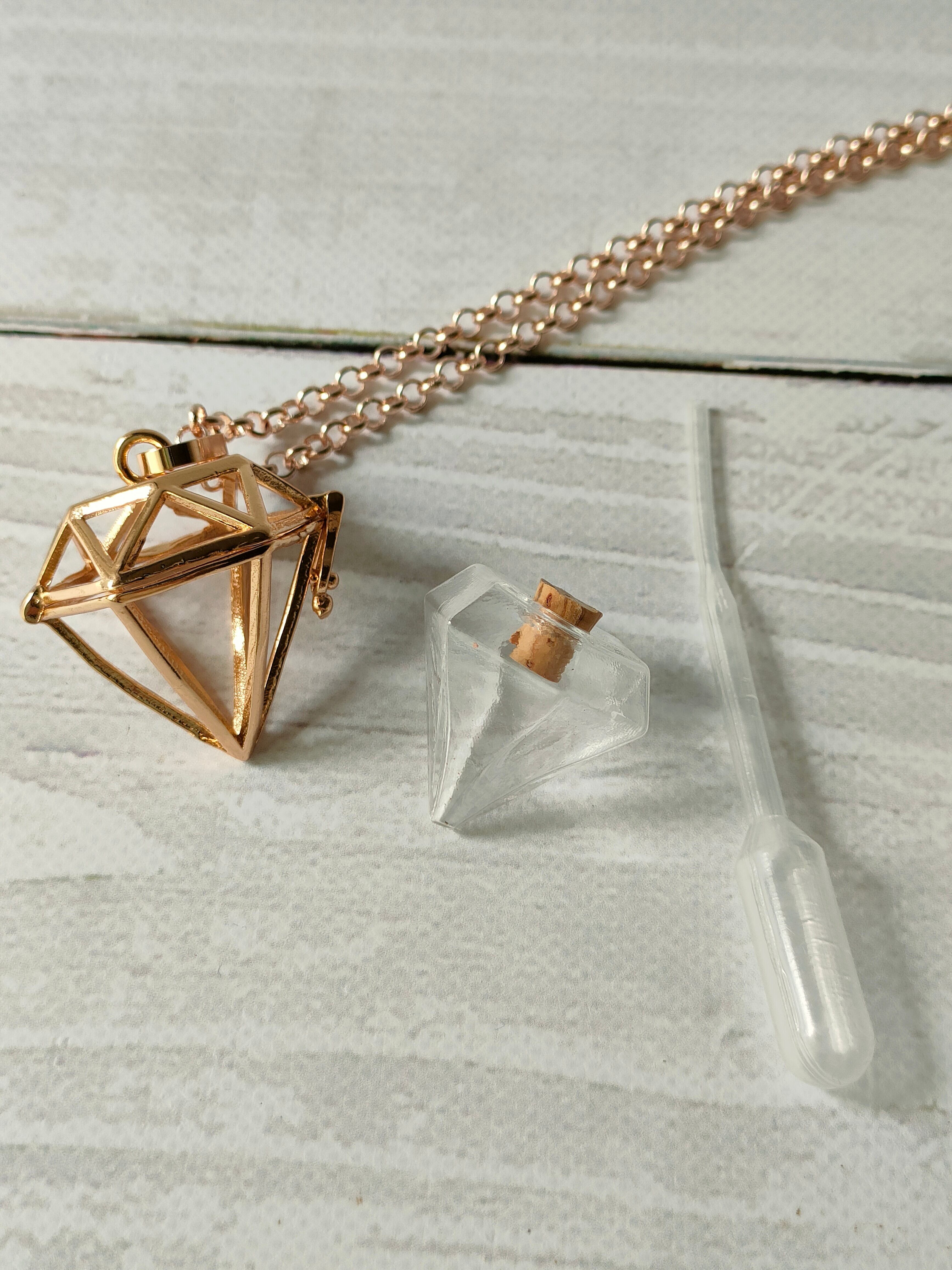 ケージの中に小さな鉱石を入れて持ち歩くことができるネックレスです。ダイヤモンドカットを型どった形がかわいい♡