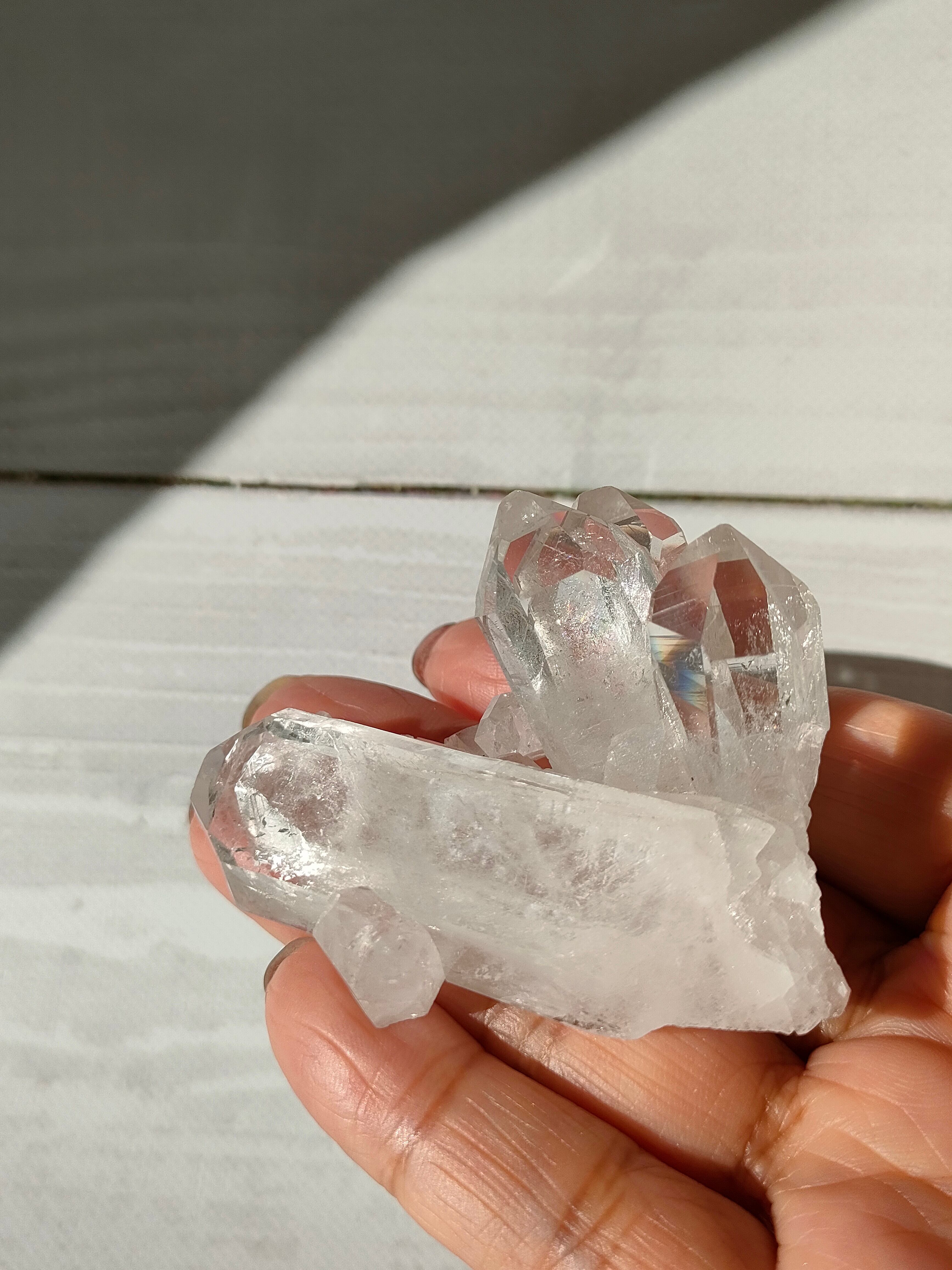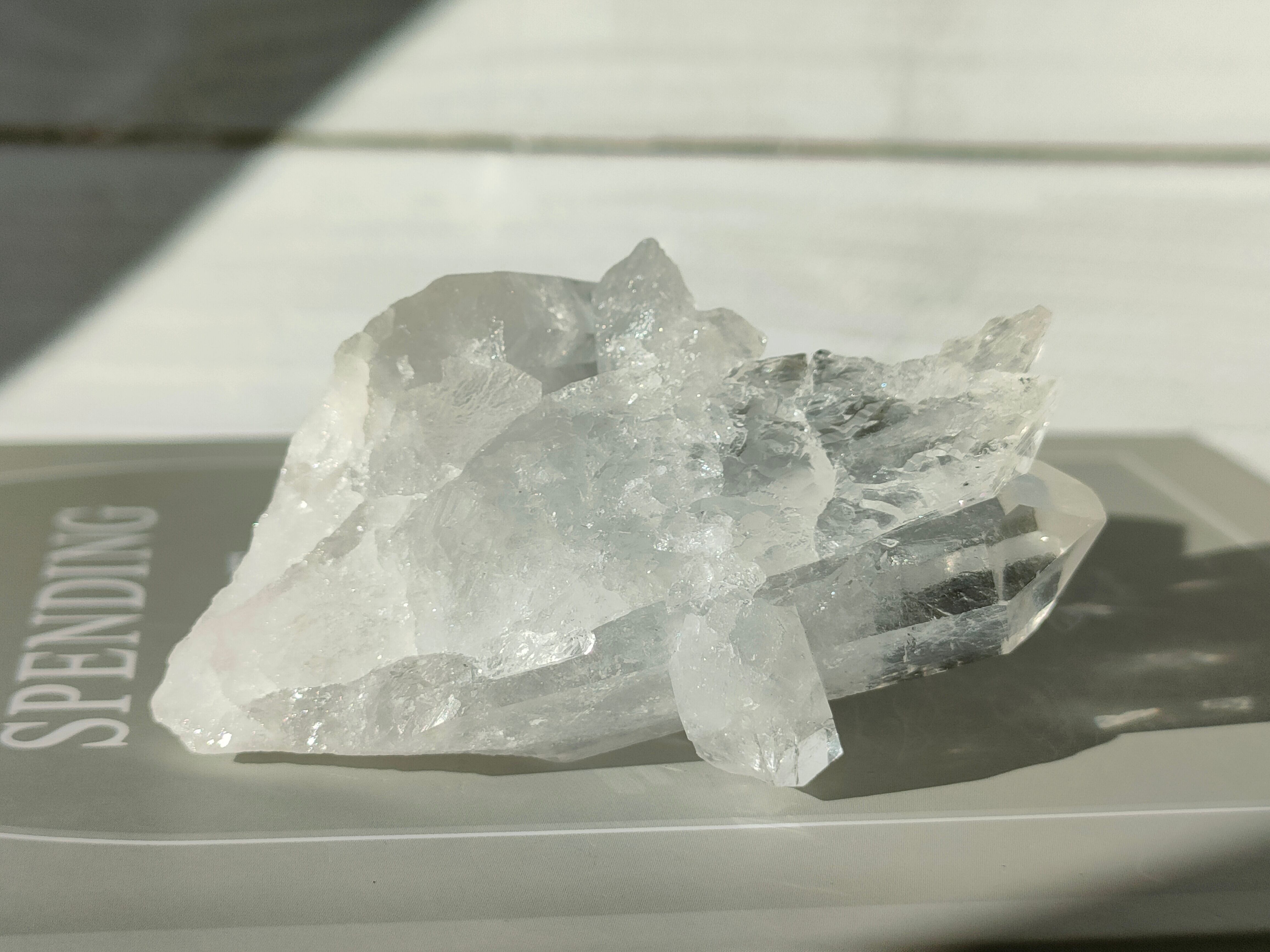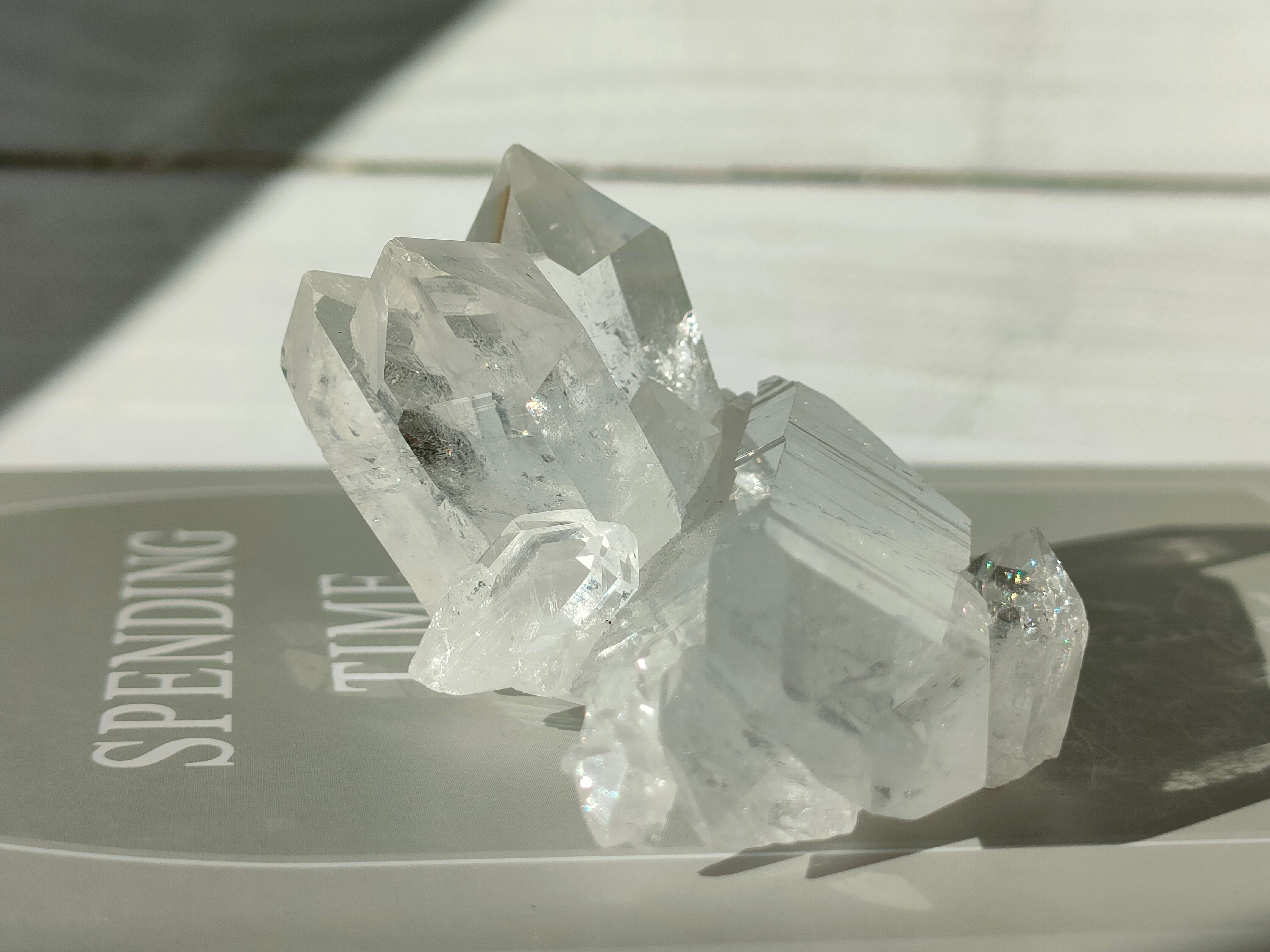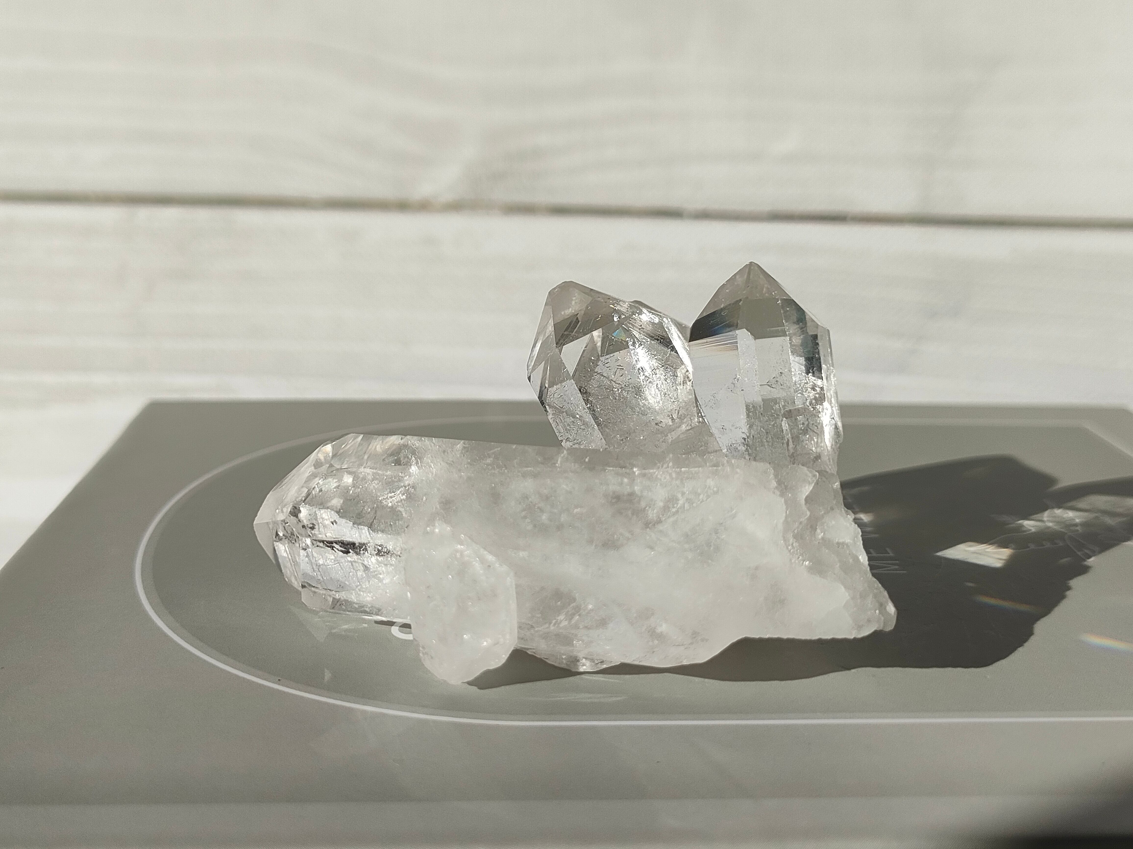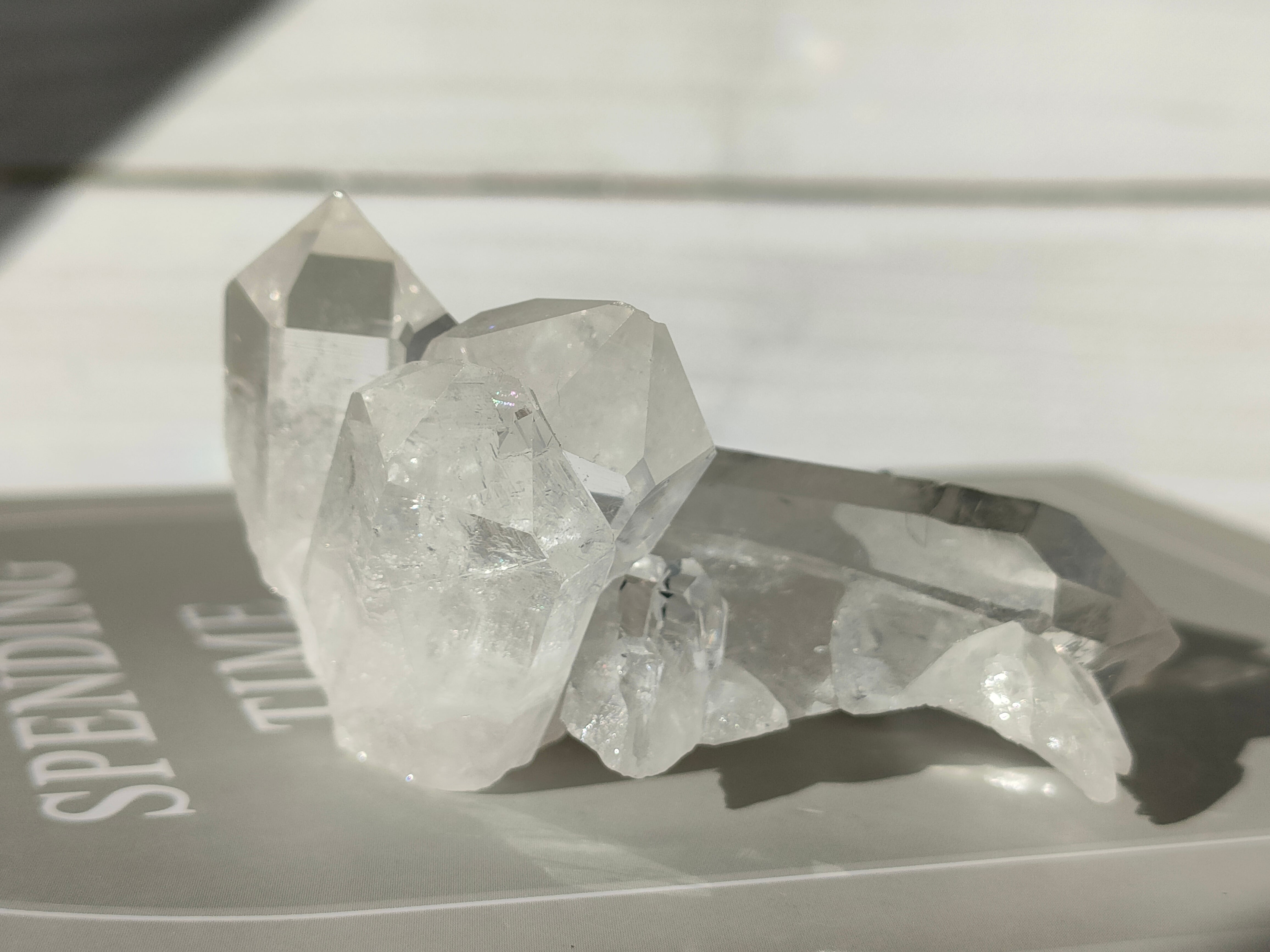 横たわった水晶の後ろにタントリックツイン(ふたつのクリスタルがひとつの根元から成長している)と透明度の高い水晶、一番手前には小さな水晶とバランスが良いクラスターです。