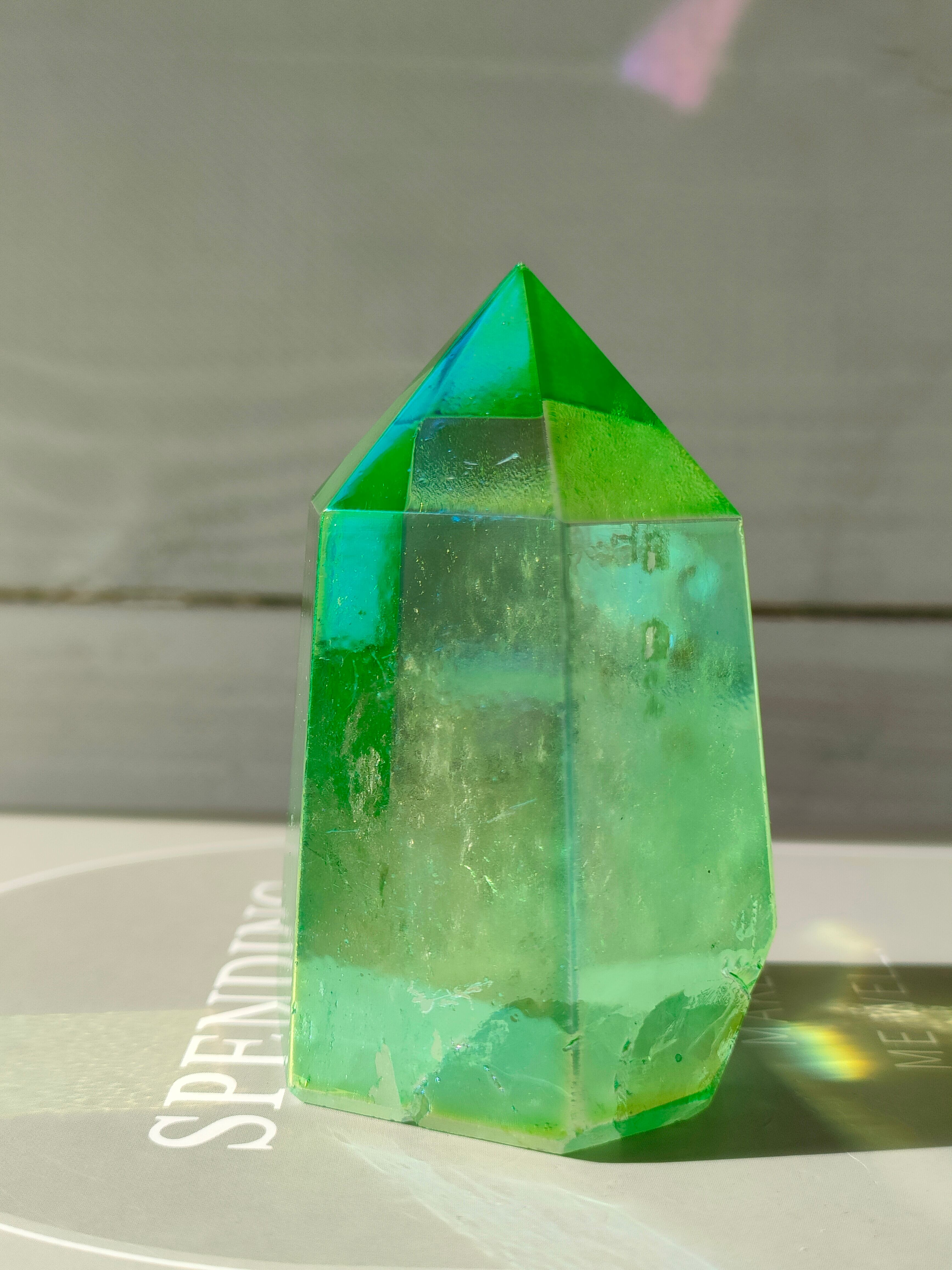 オーラクォーツは表面にシャボン玉のような独特な色彩を持つ『オーラクォーツ』は、加熱された真空内でイオン化した金属を水晶に皮膜蒸着したストーンです。