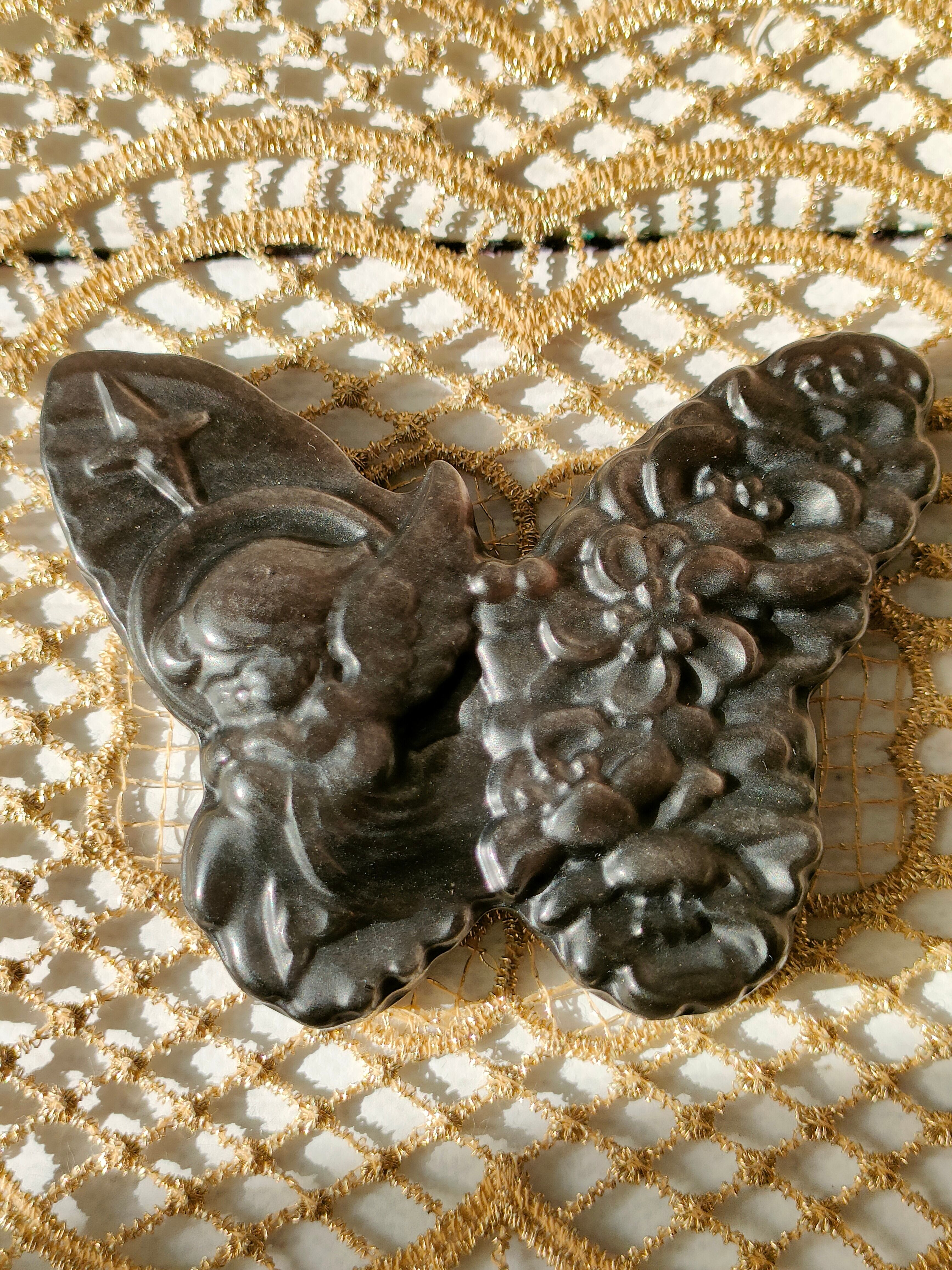蝶を型どった中に可愛らしい天使と花が美しく施されています。光に傾けると立体的に見えさらに美しさを増します。