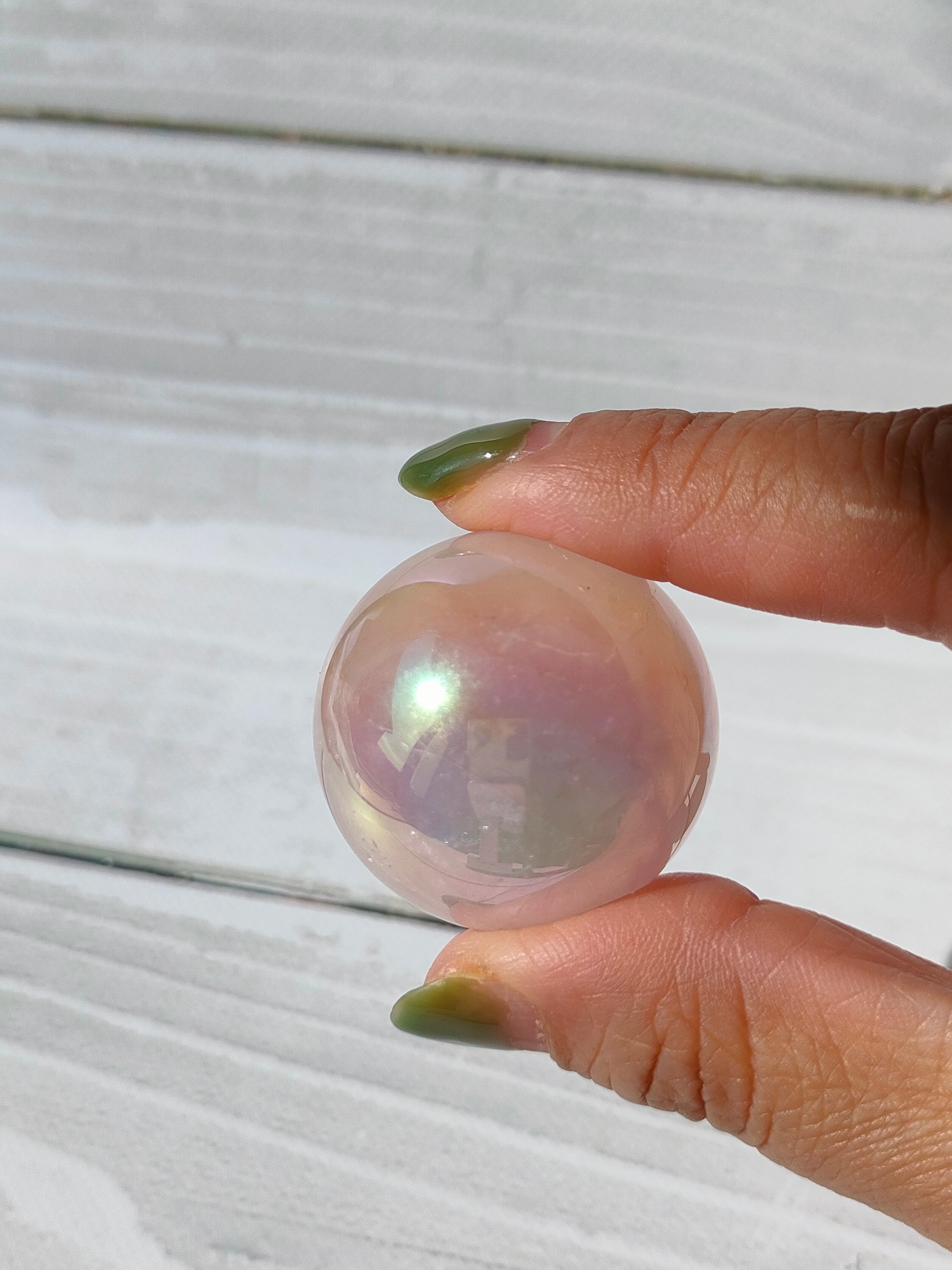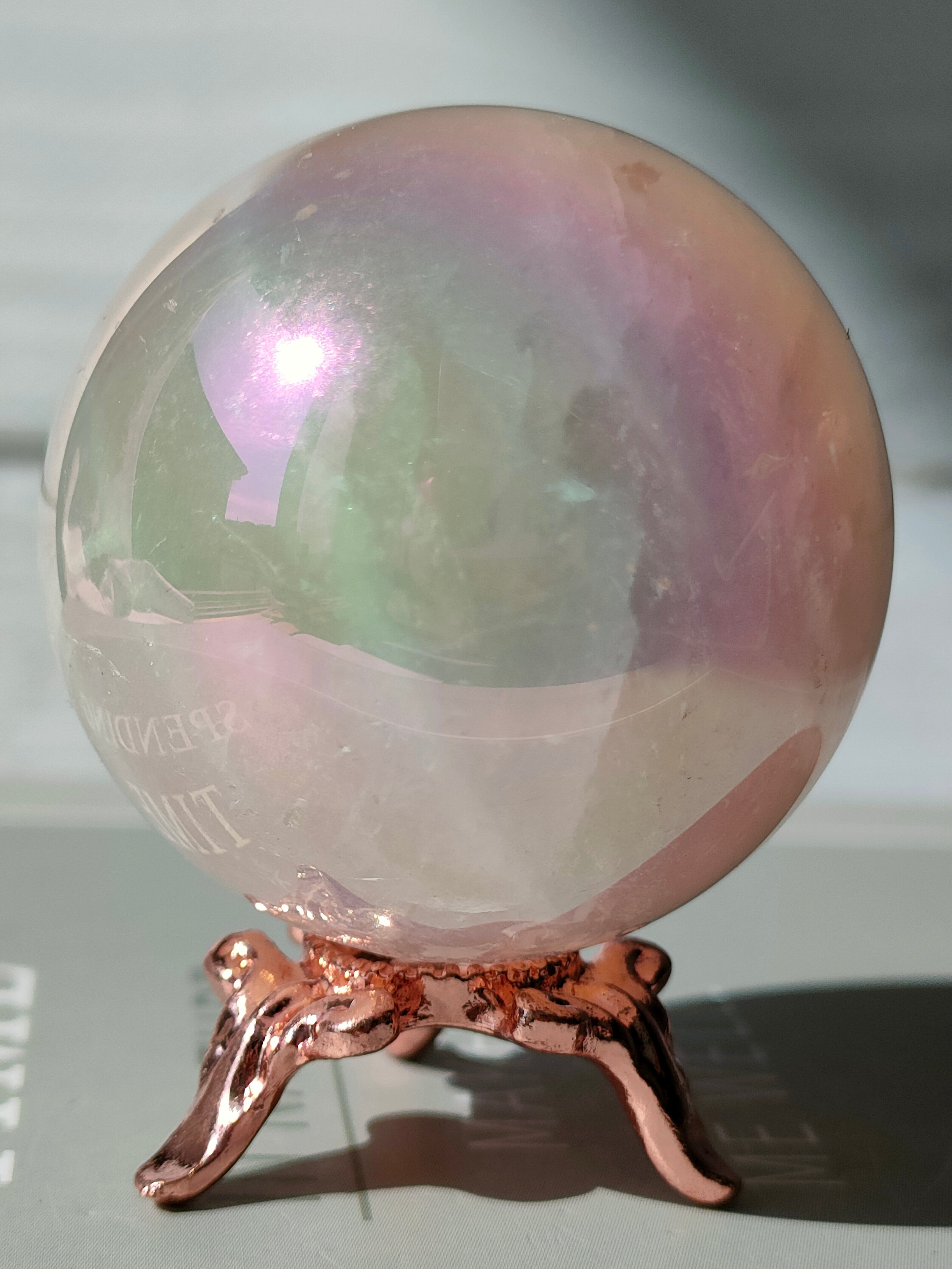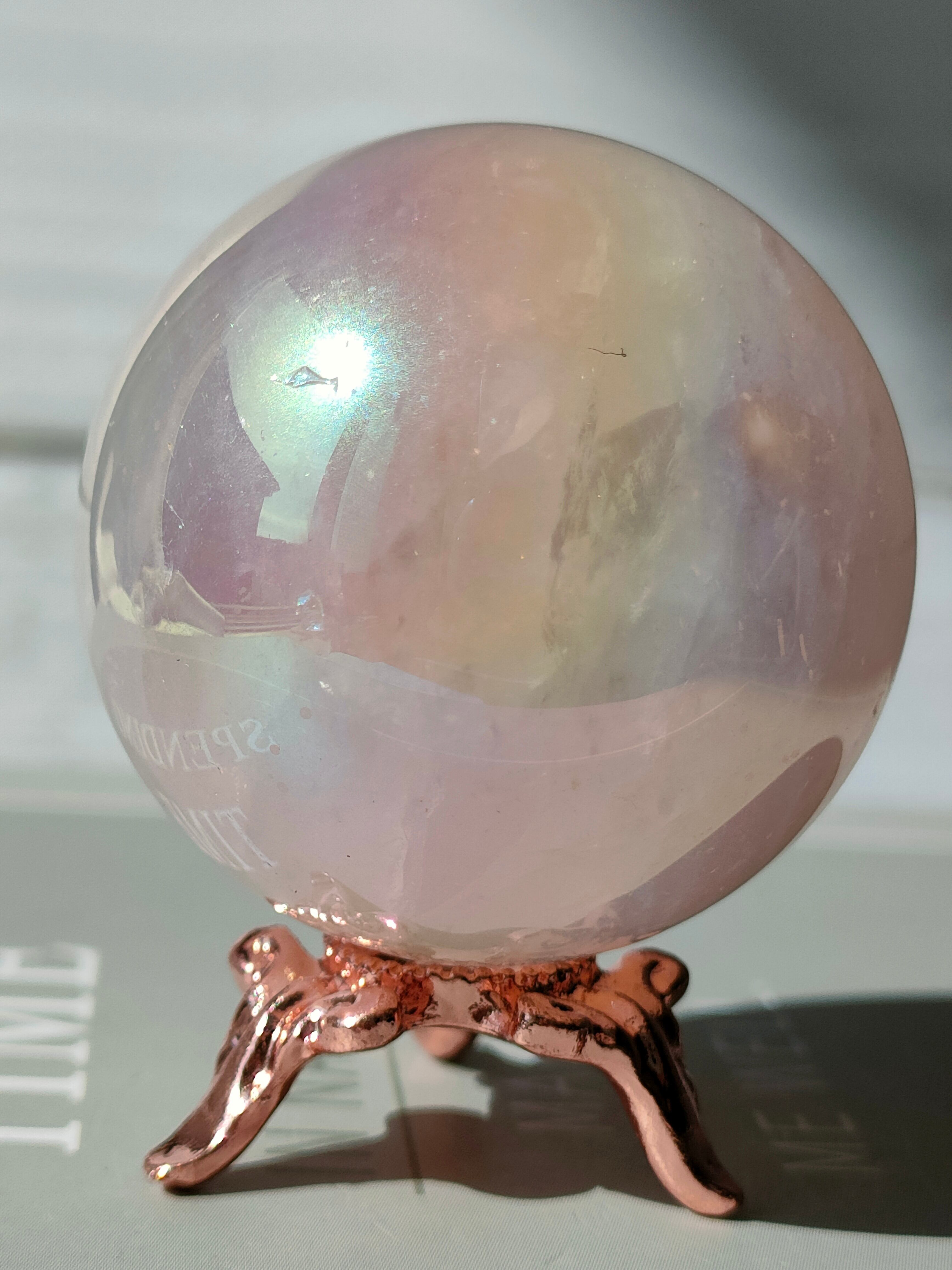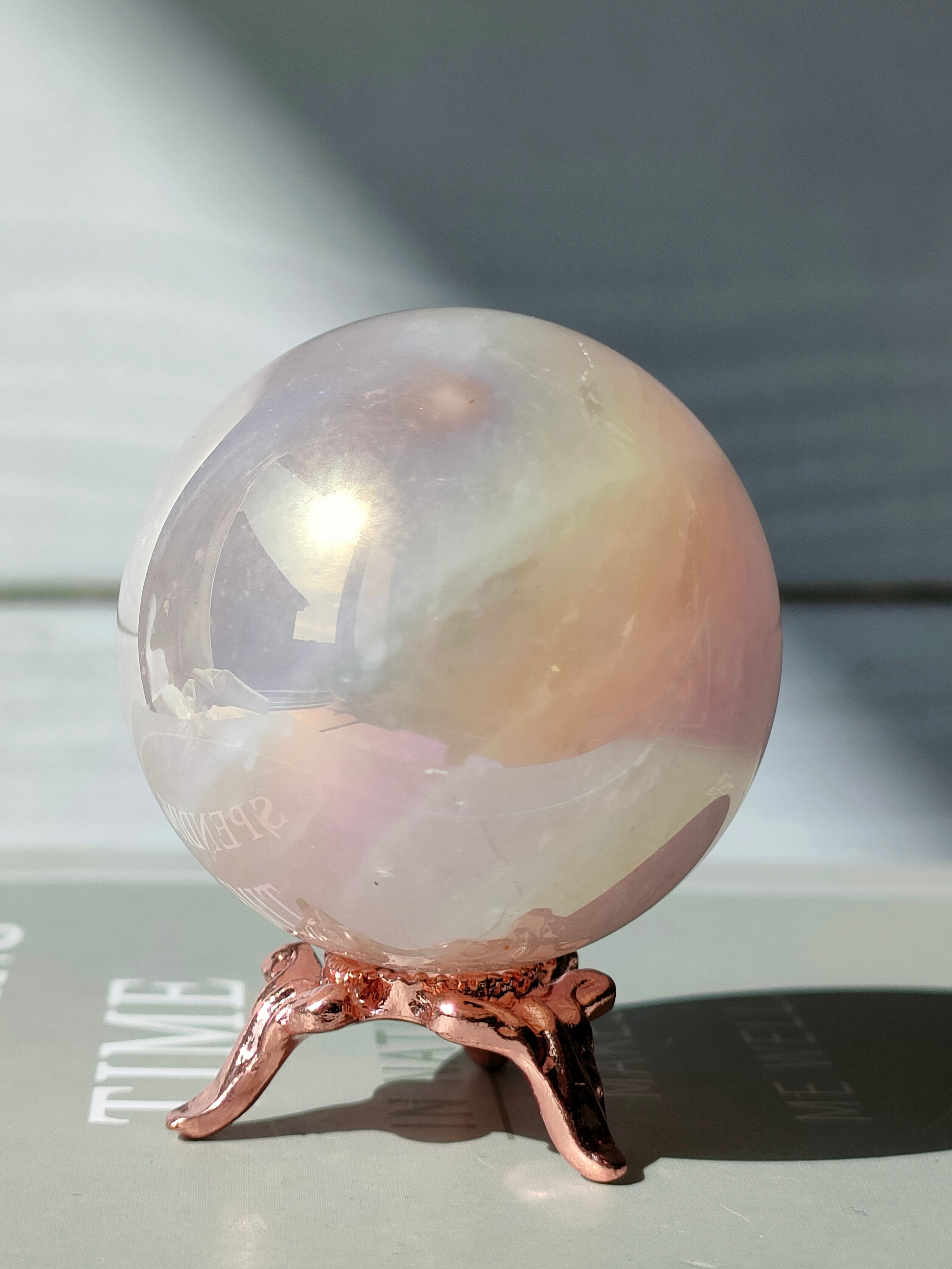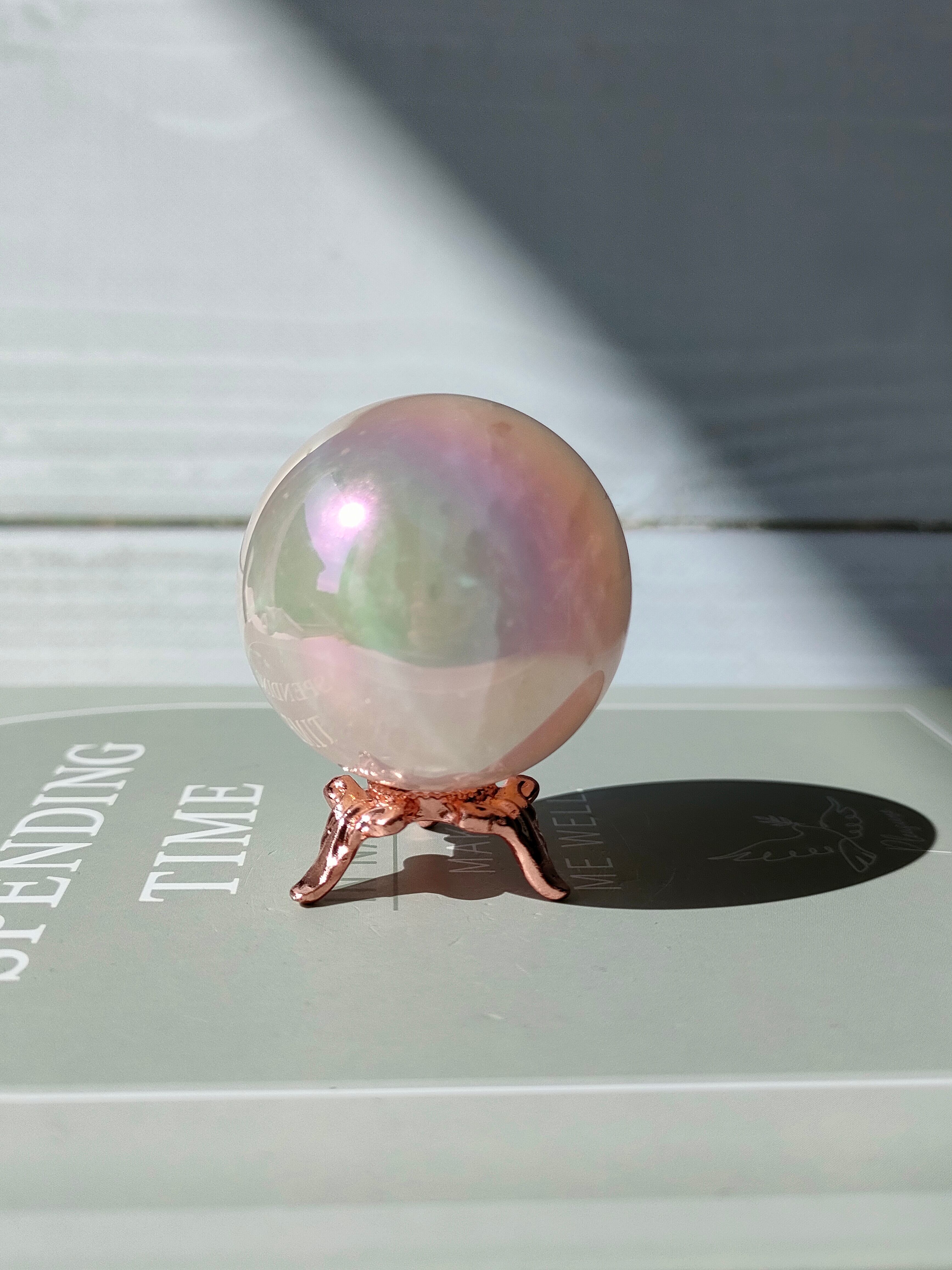 表面にシャボン玉のような独特な色彩を持つ『オーラクォーツ』は、加熱された真空内でイオン化した金属を水晶に皮膜蒸着したストーンです。ローズオーラはチタンを蒸着させています。