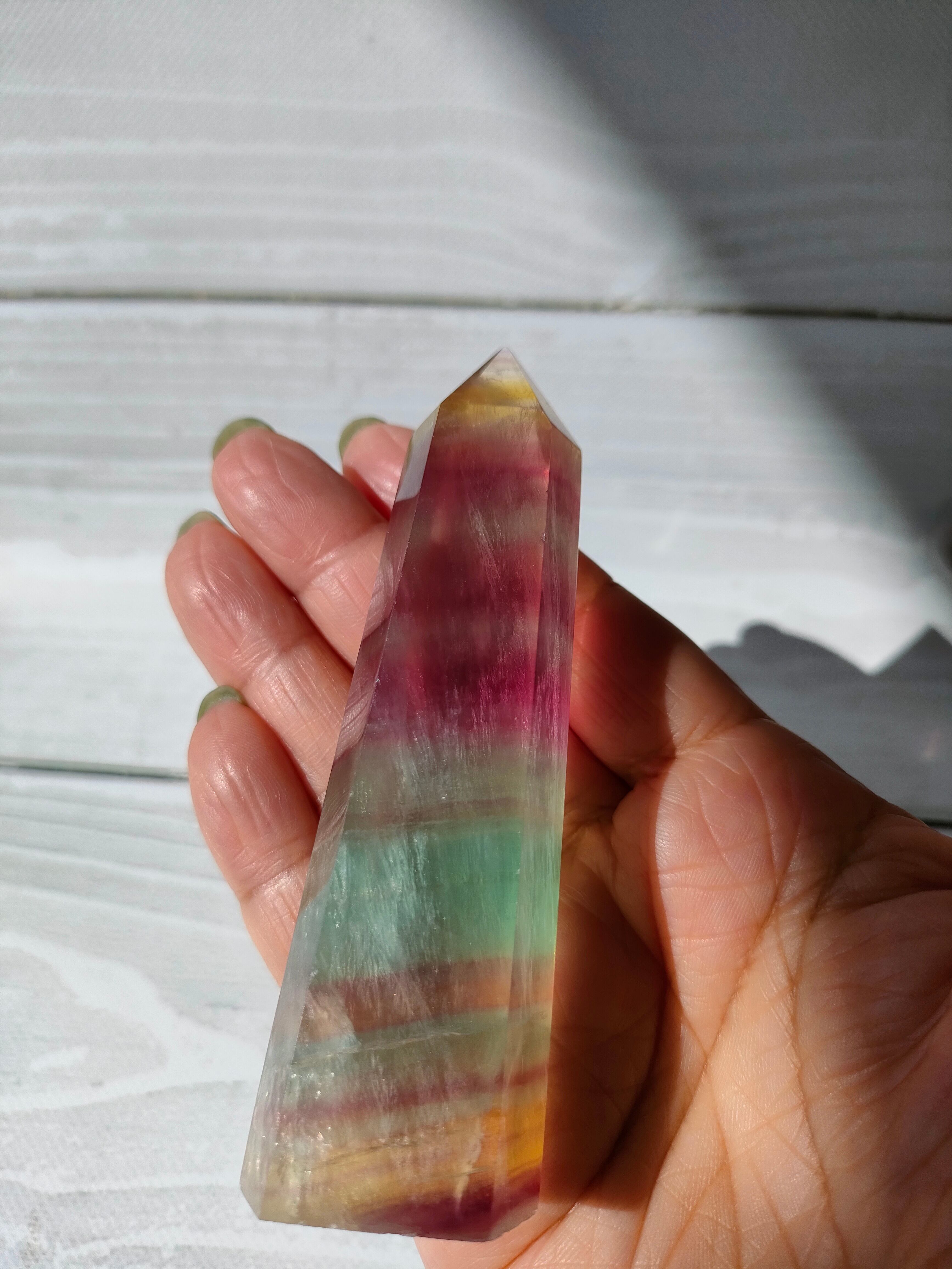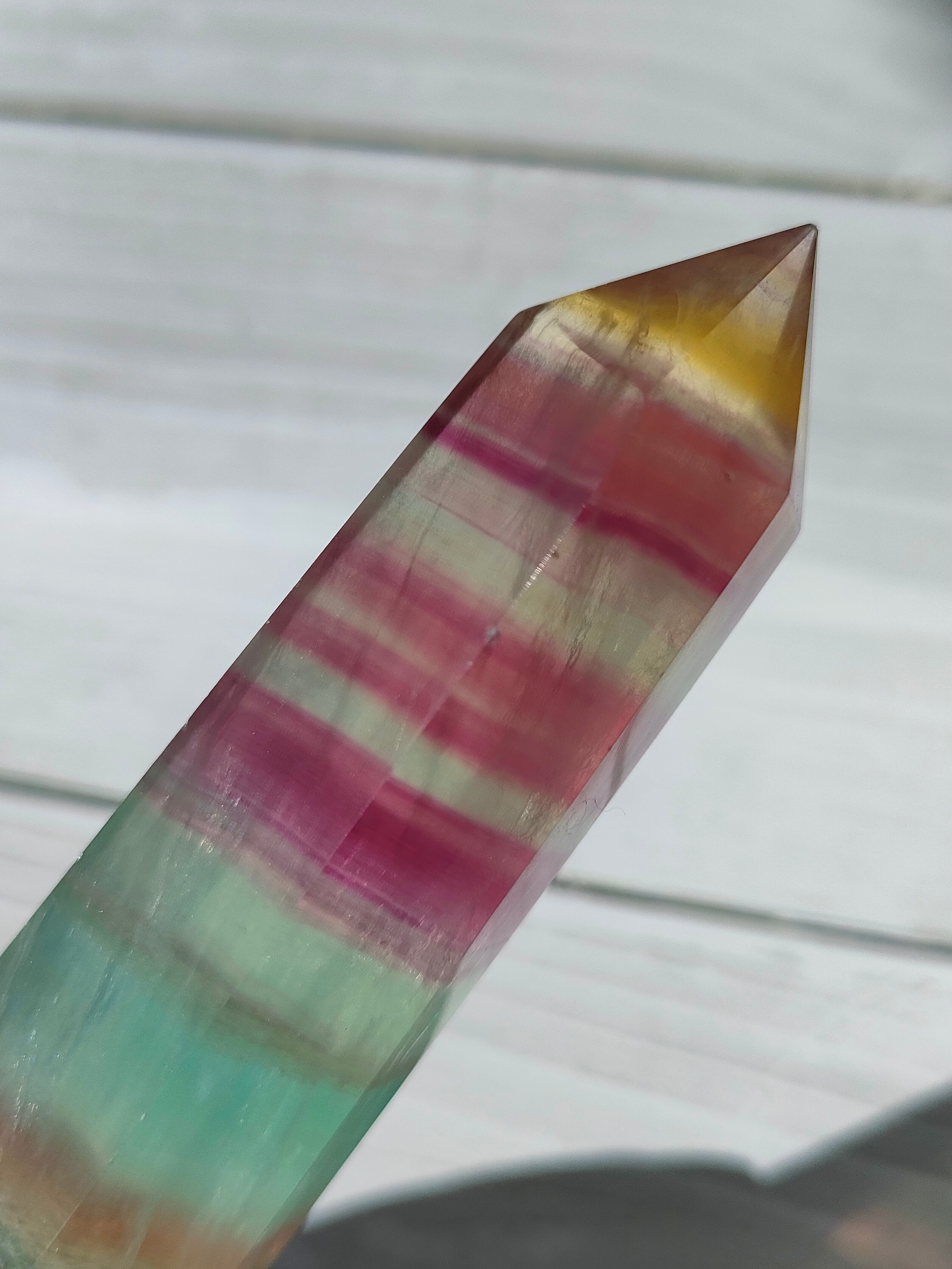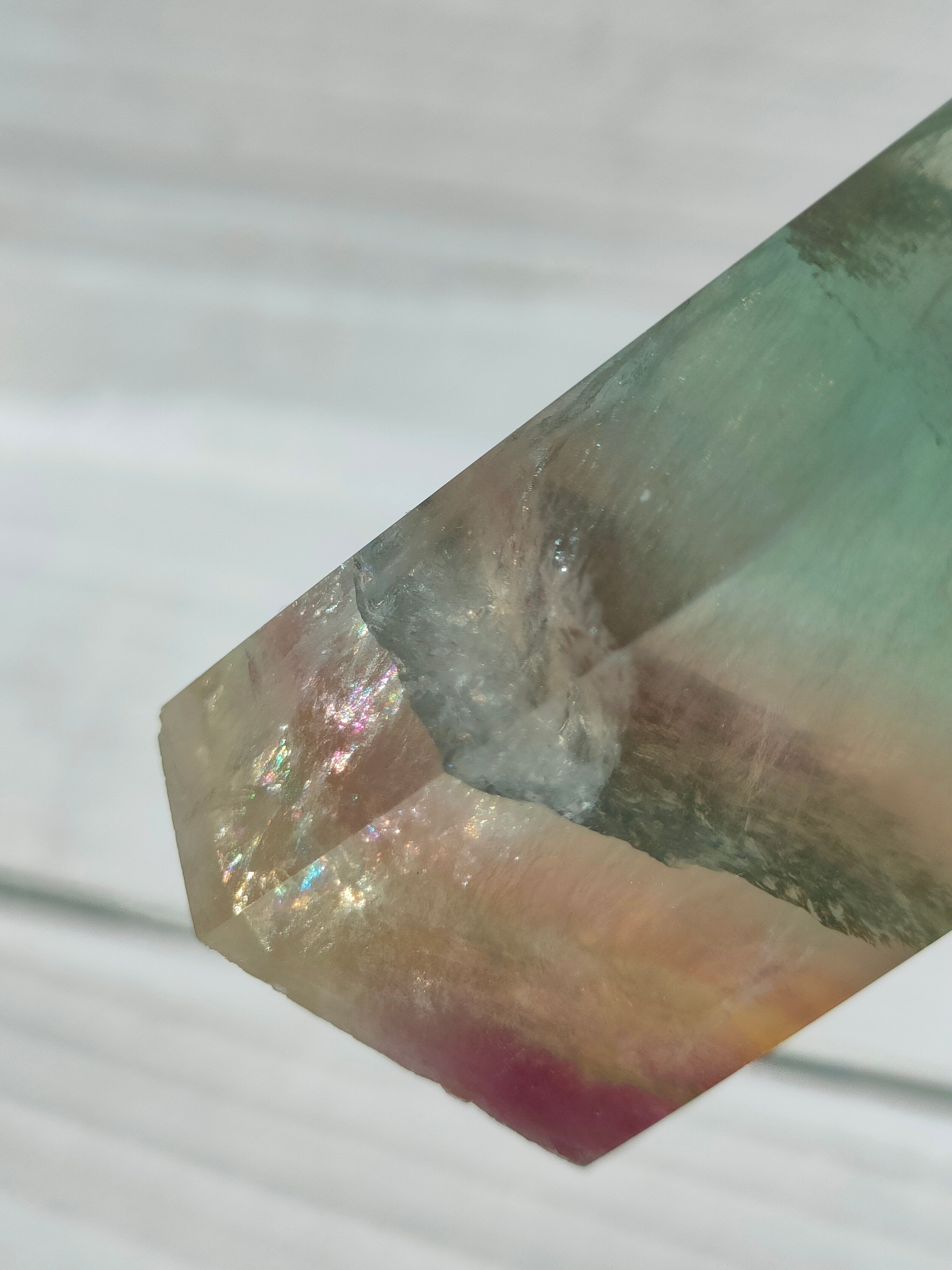 透明感あるフローライトにイエロー、パープル、グリーンの層がとても爽やかです。
