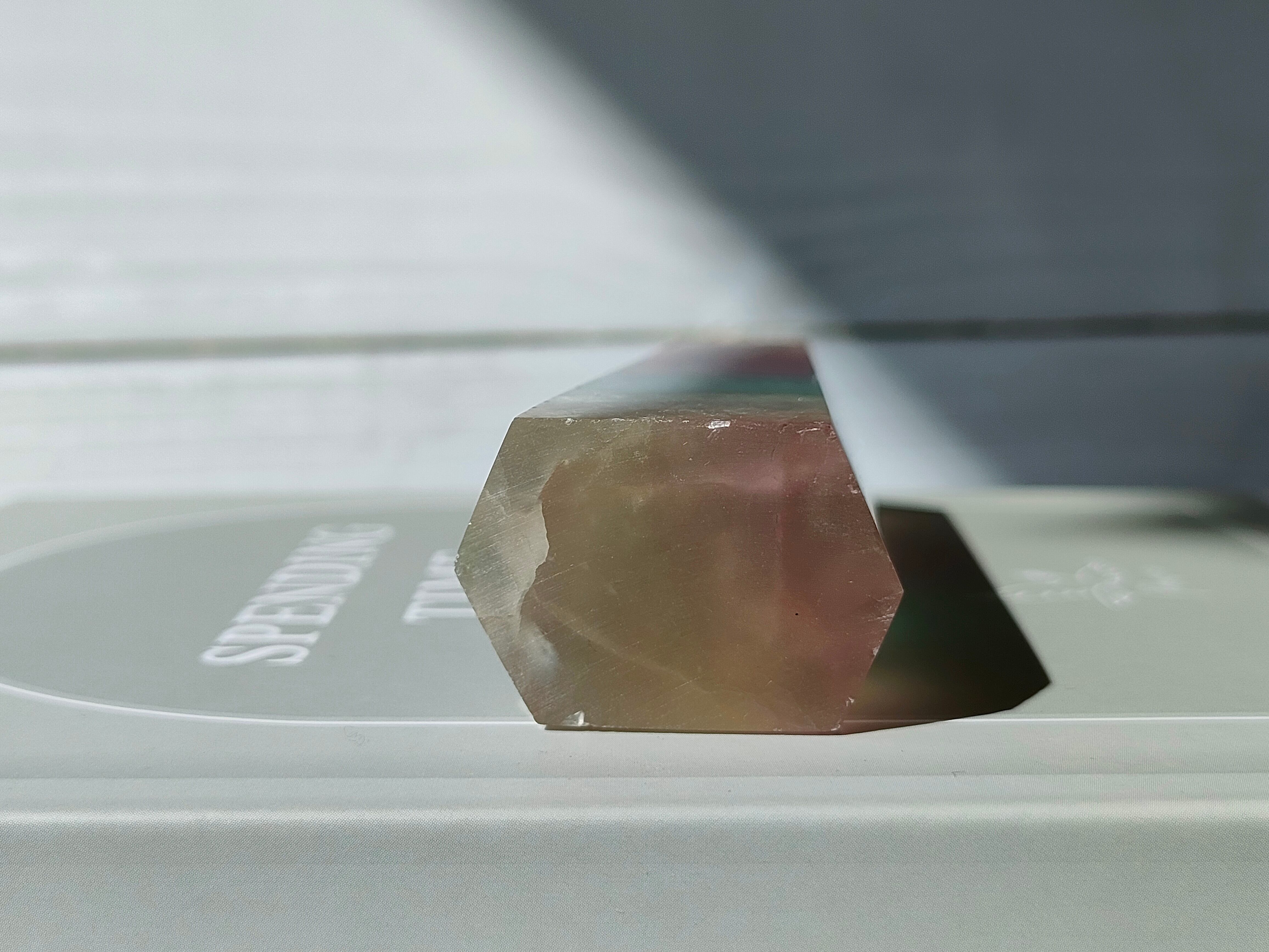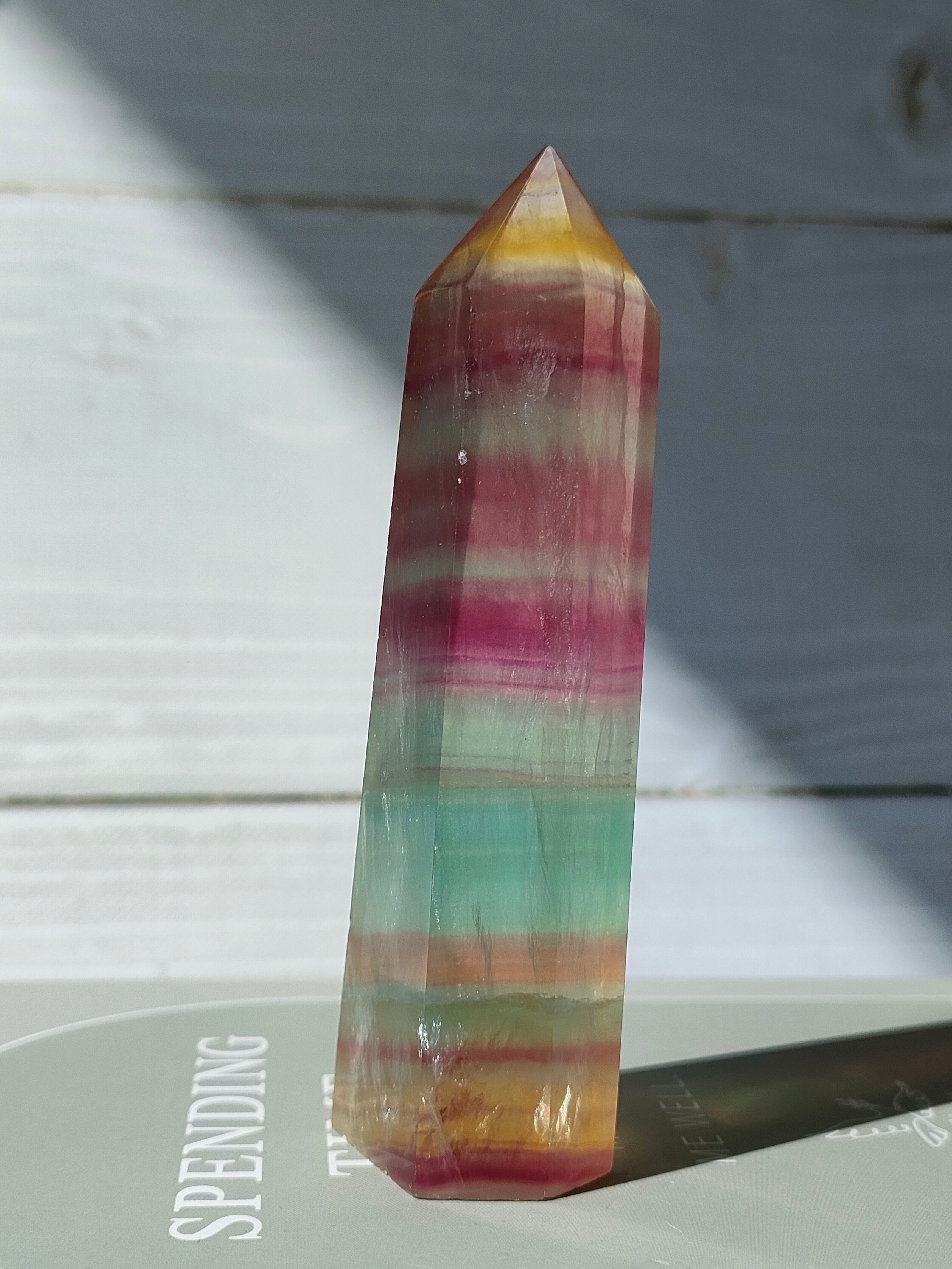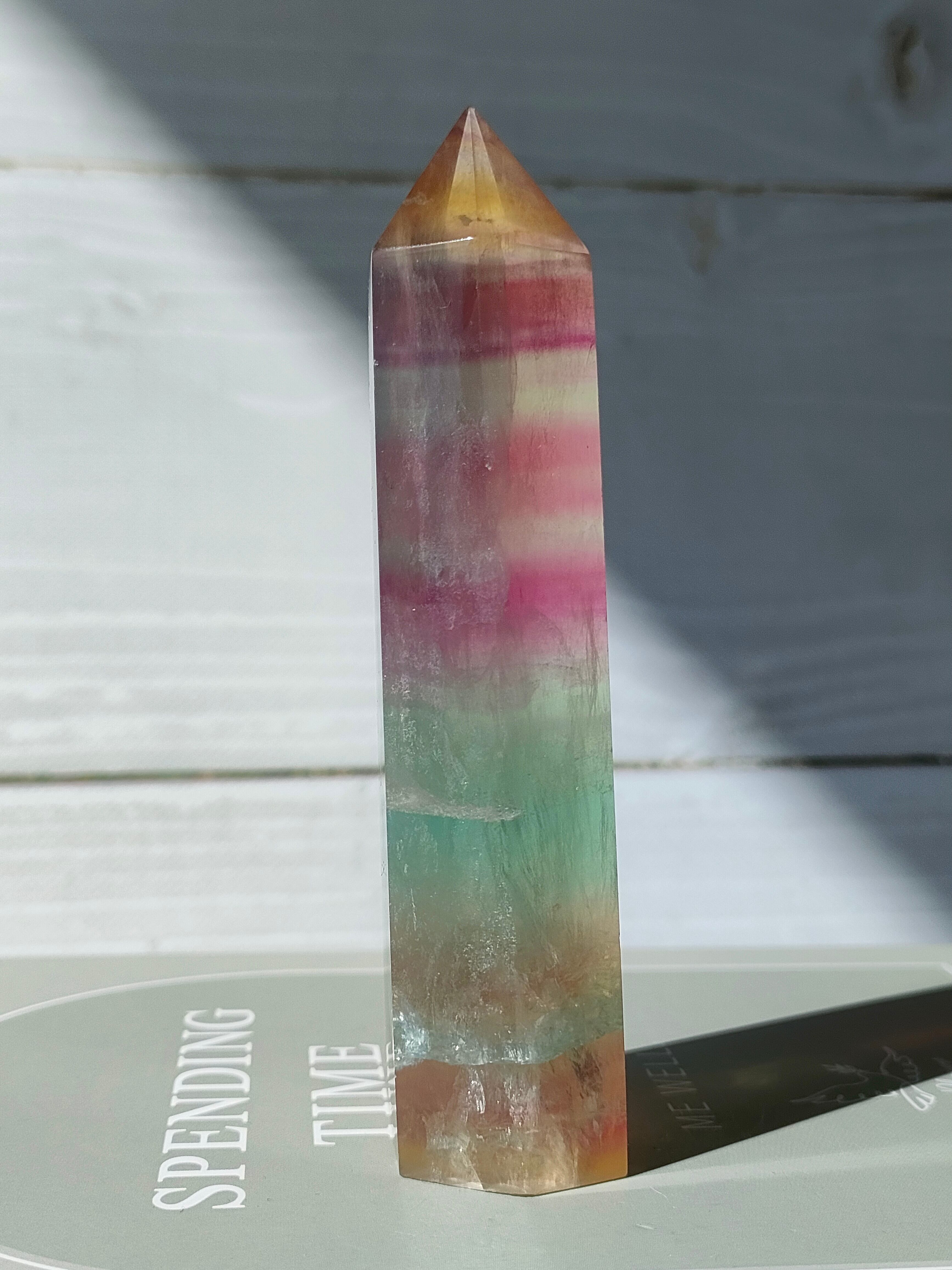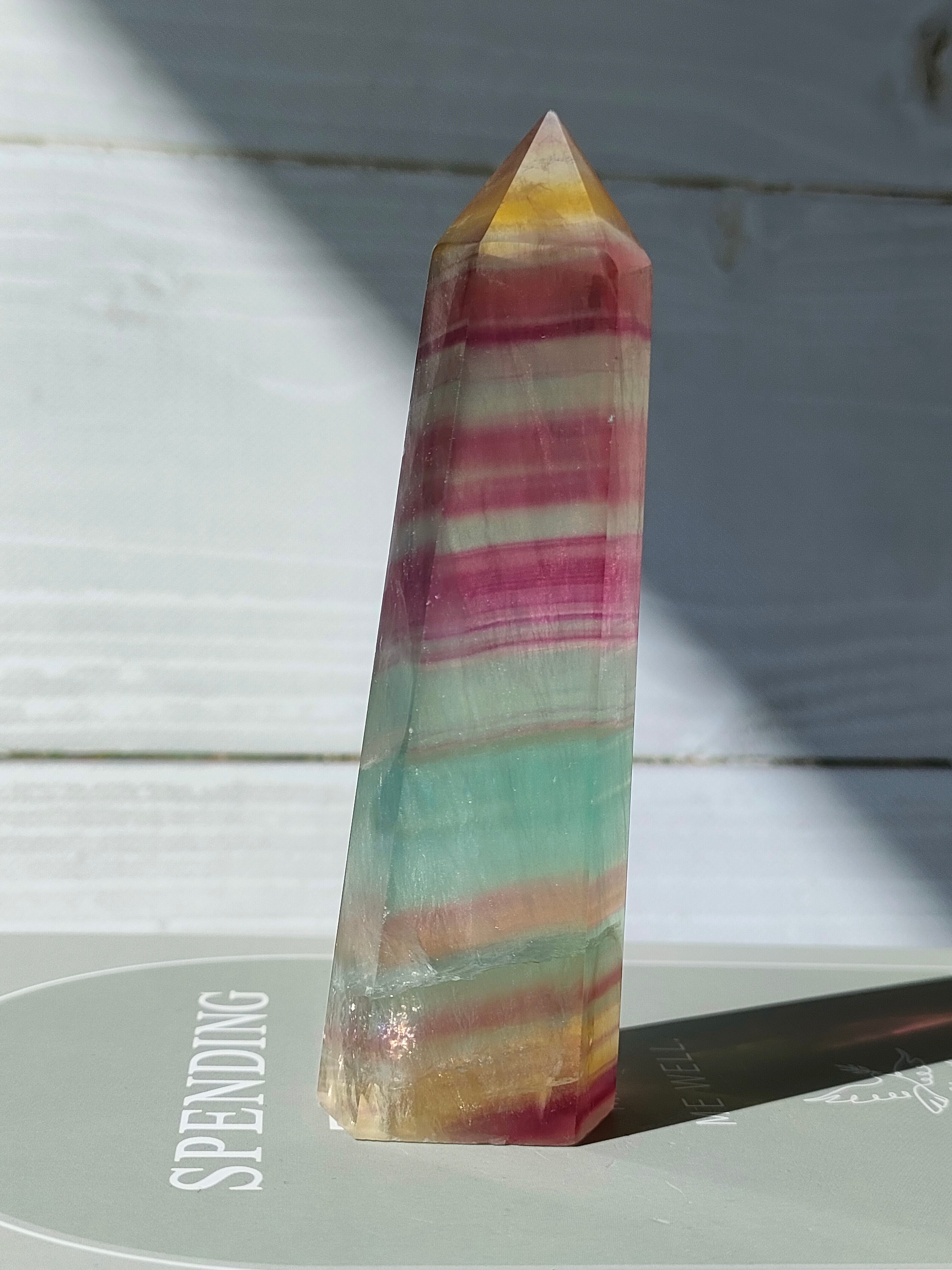 透明感あるフローライトにイエロー、パープル、グリーンの層がとても爽やかです。