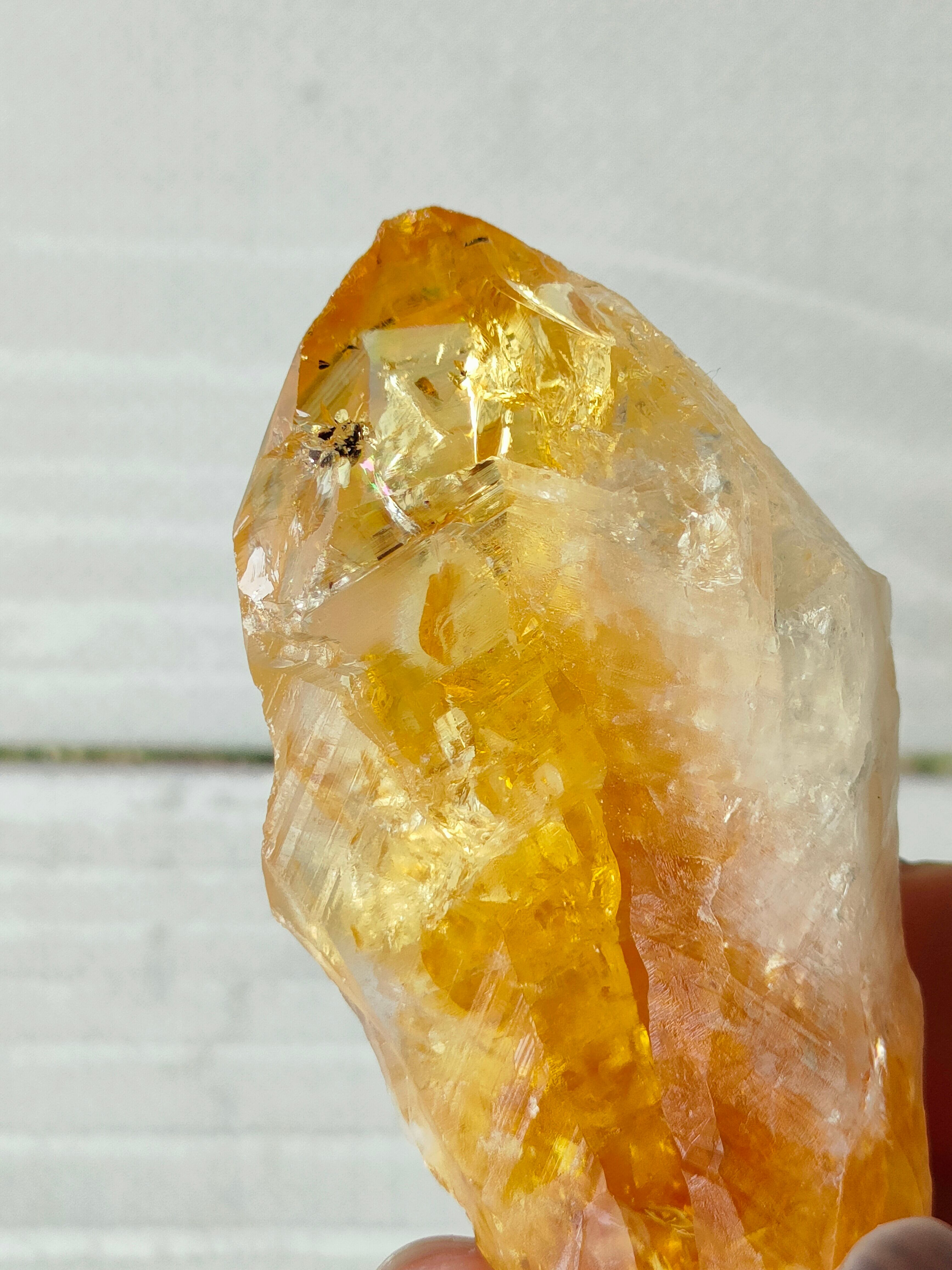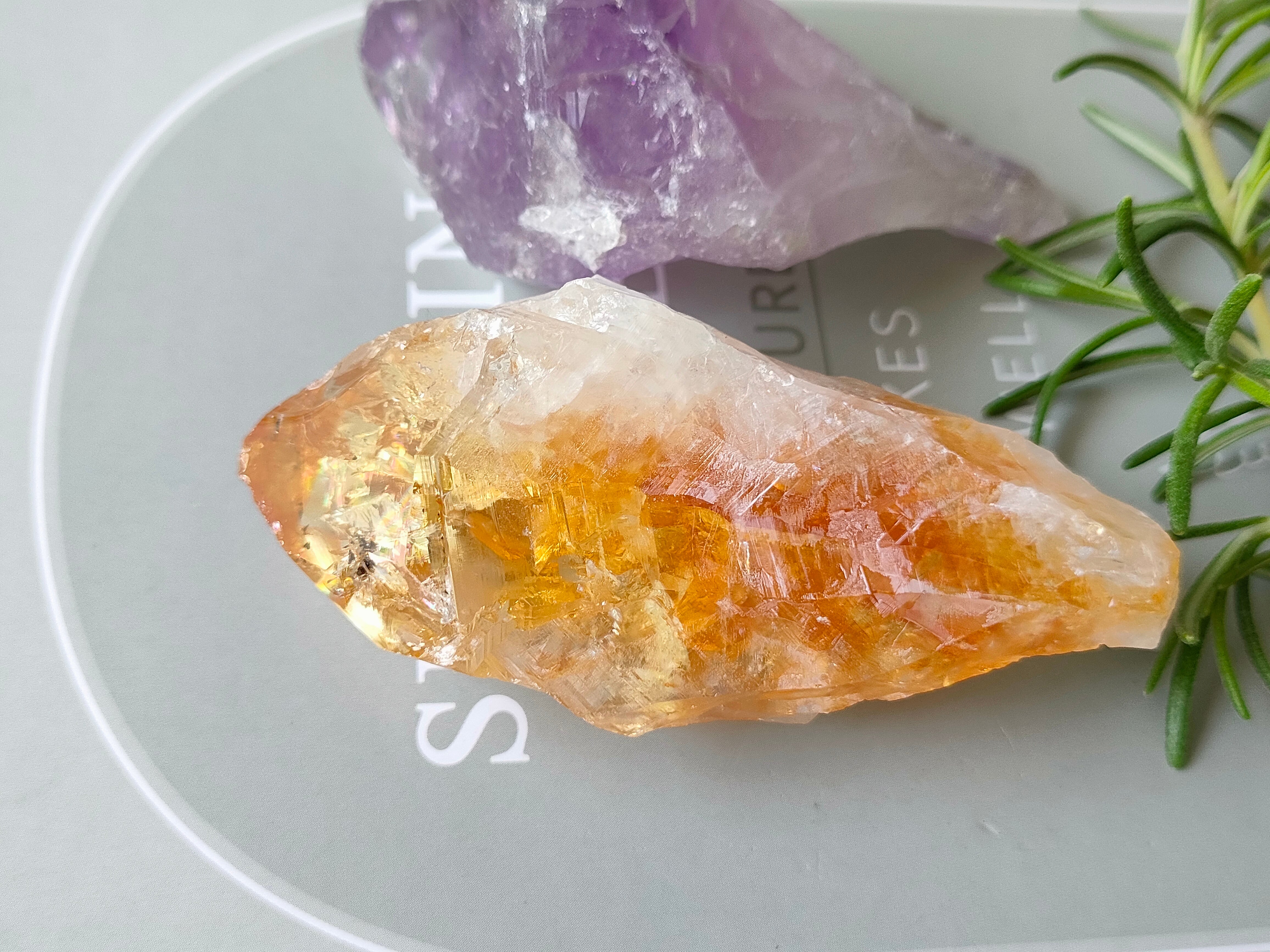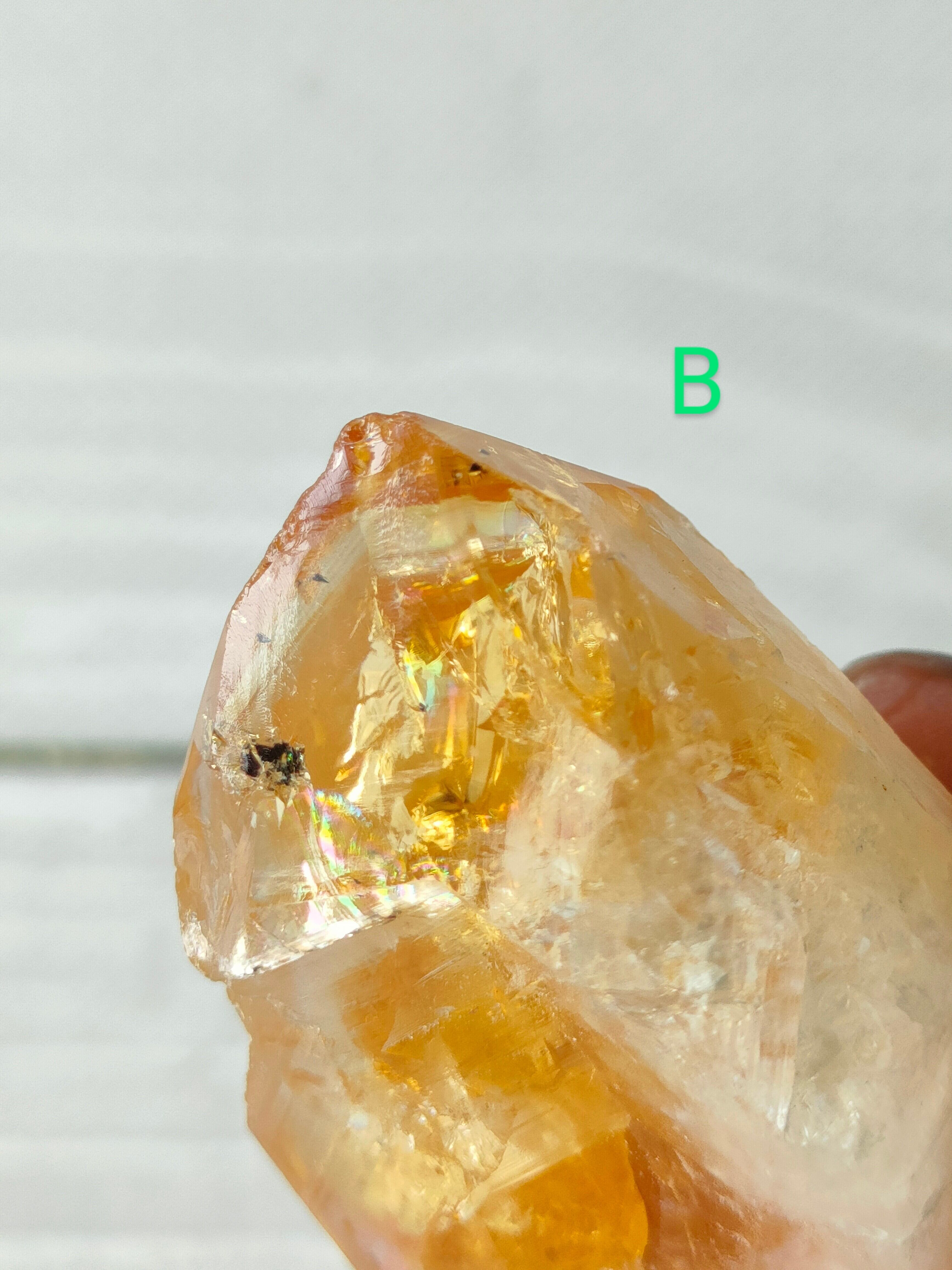 だからこその、なんとも言えない黄みがかった色合いが美しい。透明度がありクラックからの輝きと虹もみられます。