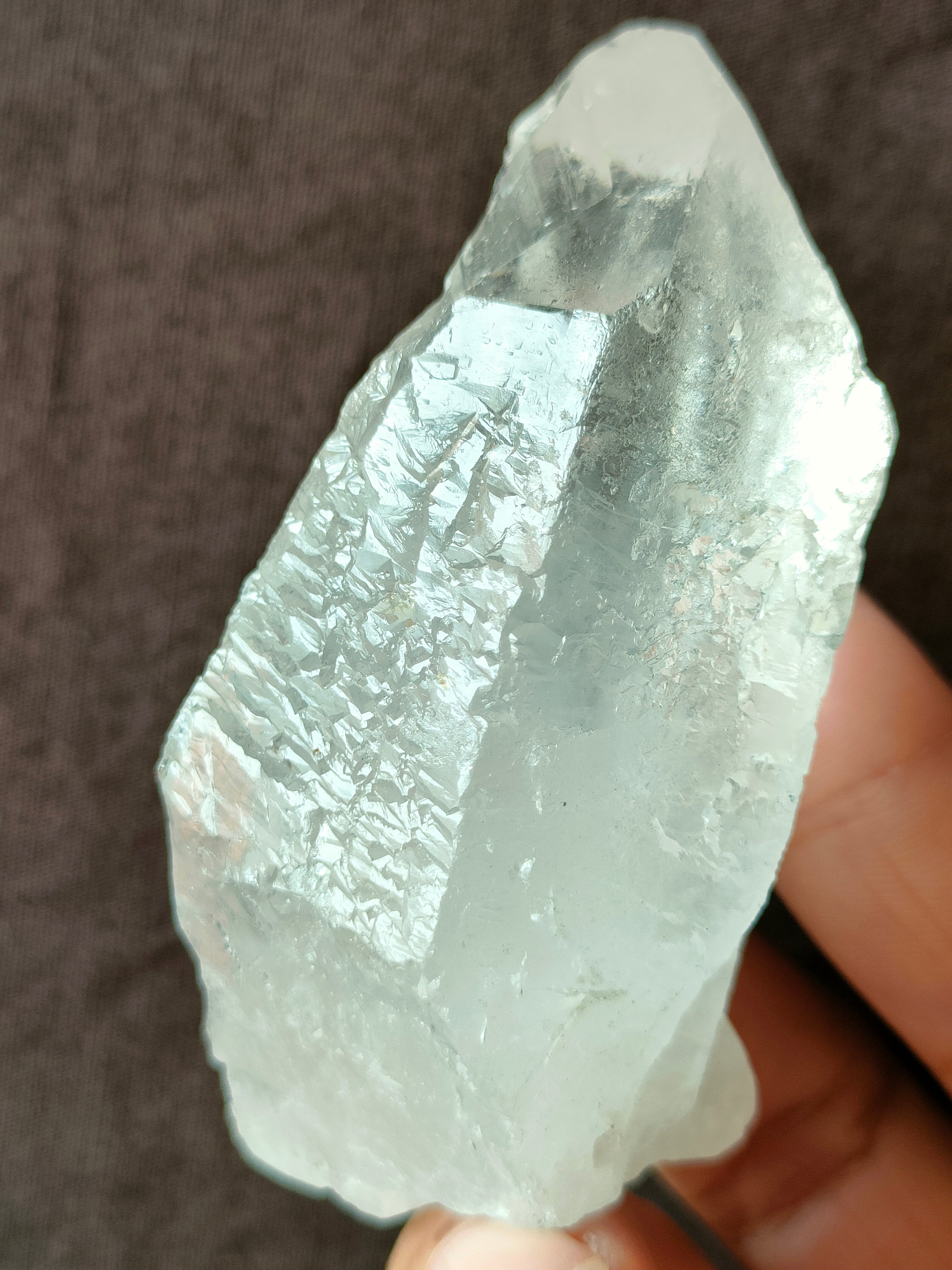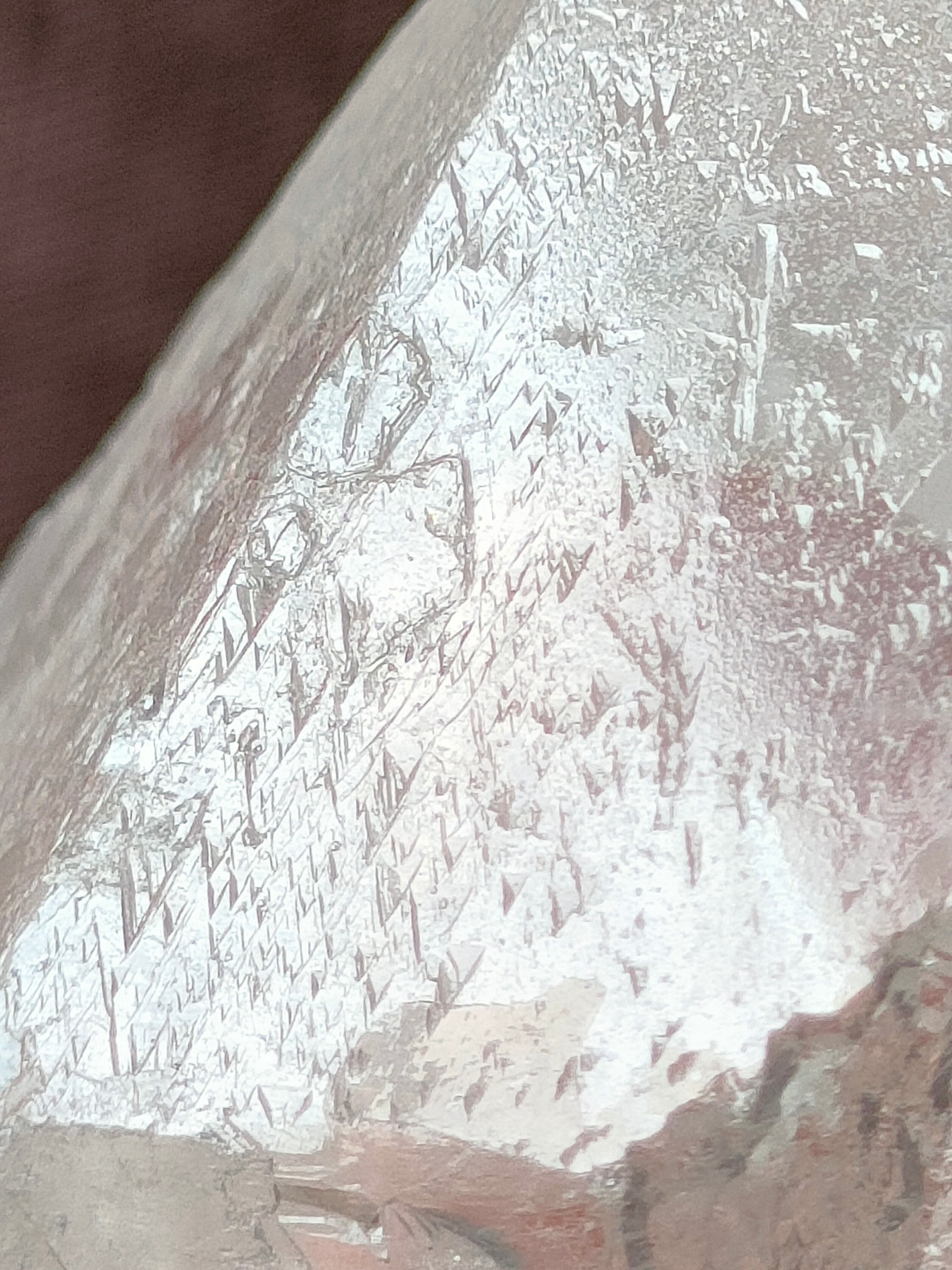 これは、水晶が形成される途中に表面に酸やフッ化水素などで溶かされたり、地中の熱水の温度や圧力によって凸凹がみられる水晶です。