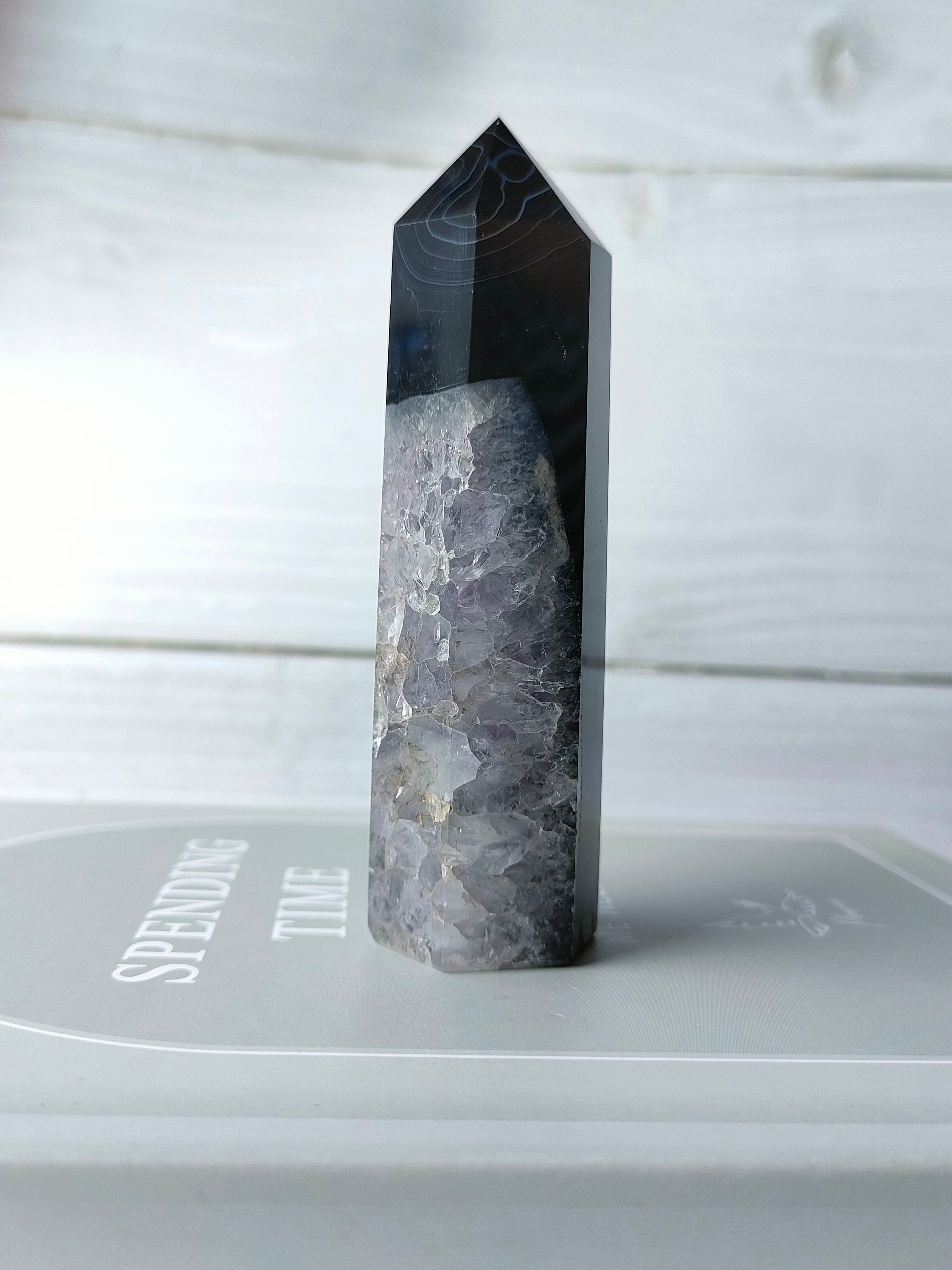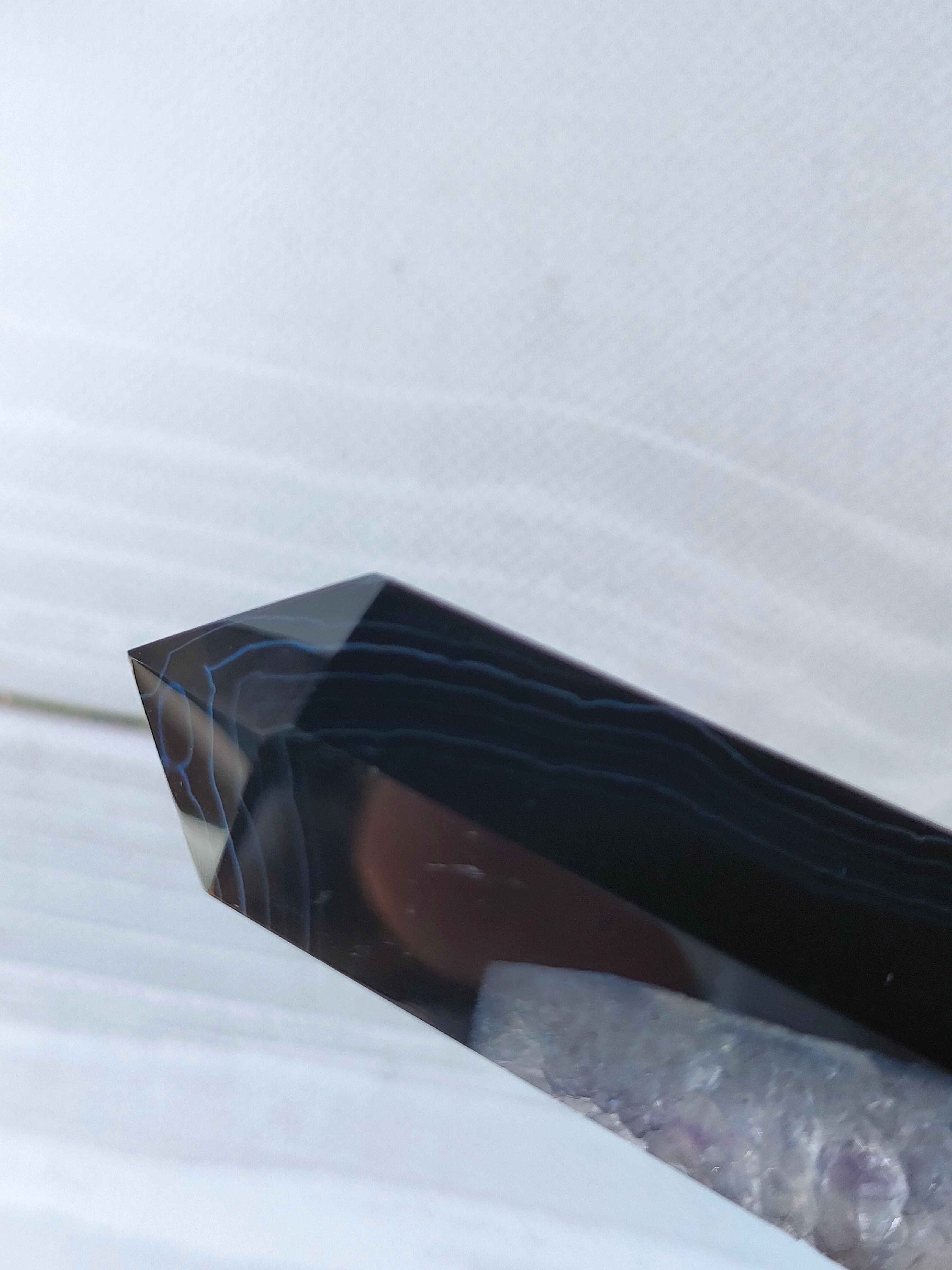 オニキスはアゲート(めのう)の一種で、黒と白の縞模様の鉱物をいいます。