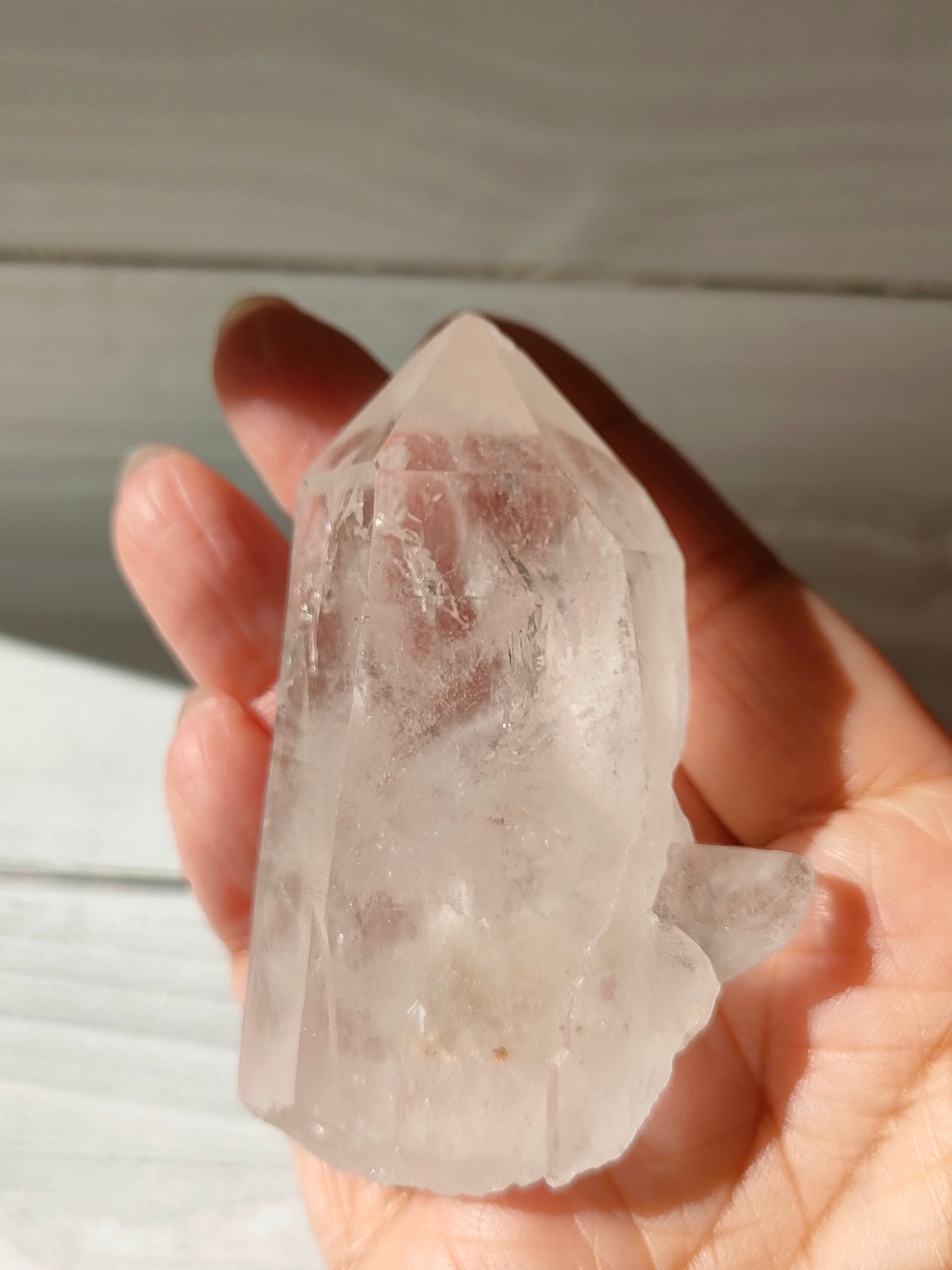 水晶内部のもやがかって白く、内包物もみられますが表面の艶が大変美しくとてもなめらかです。そのもや部分と上部には虹がみられます!