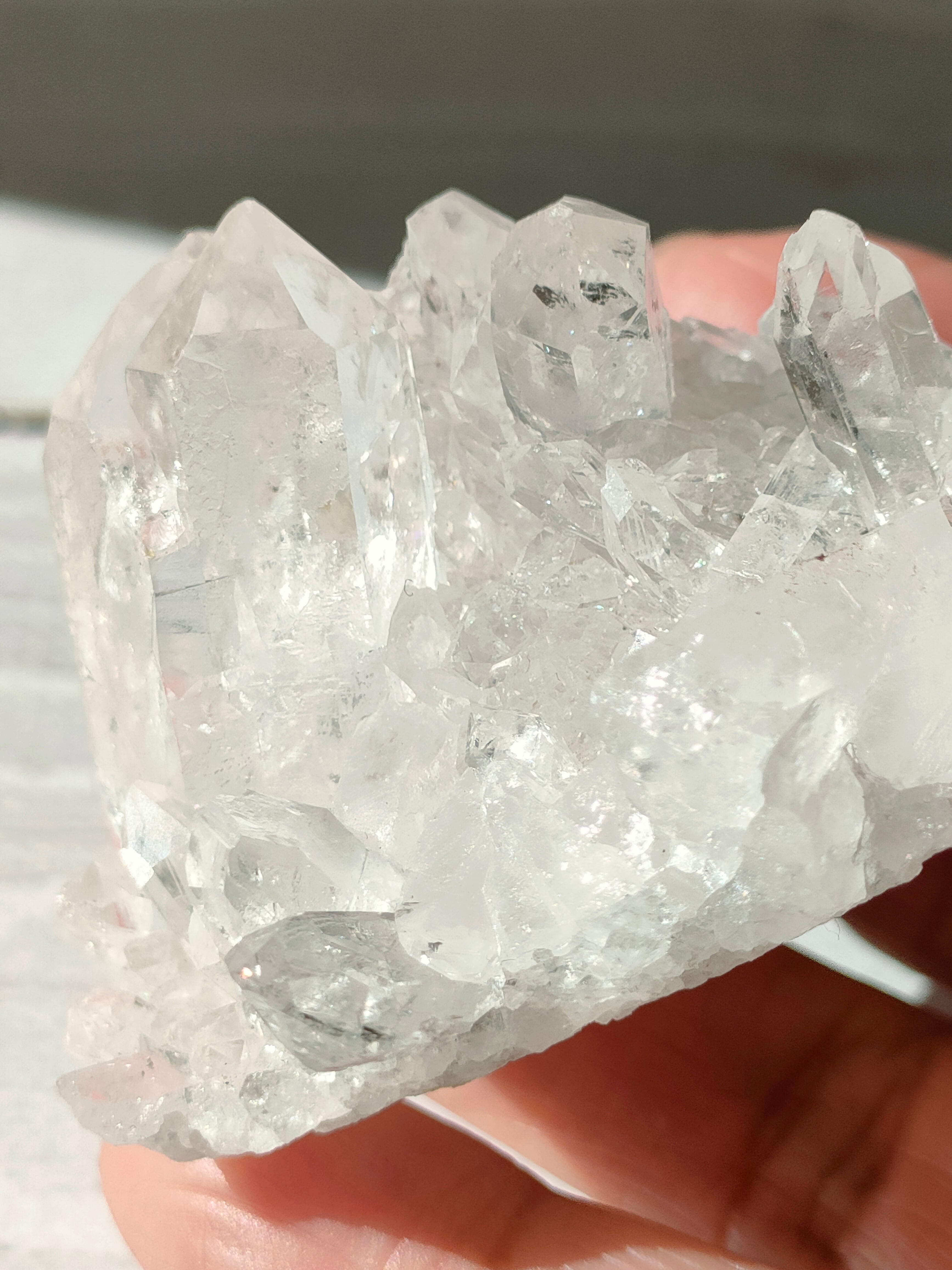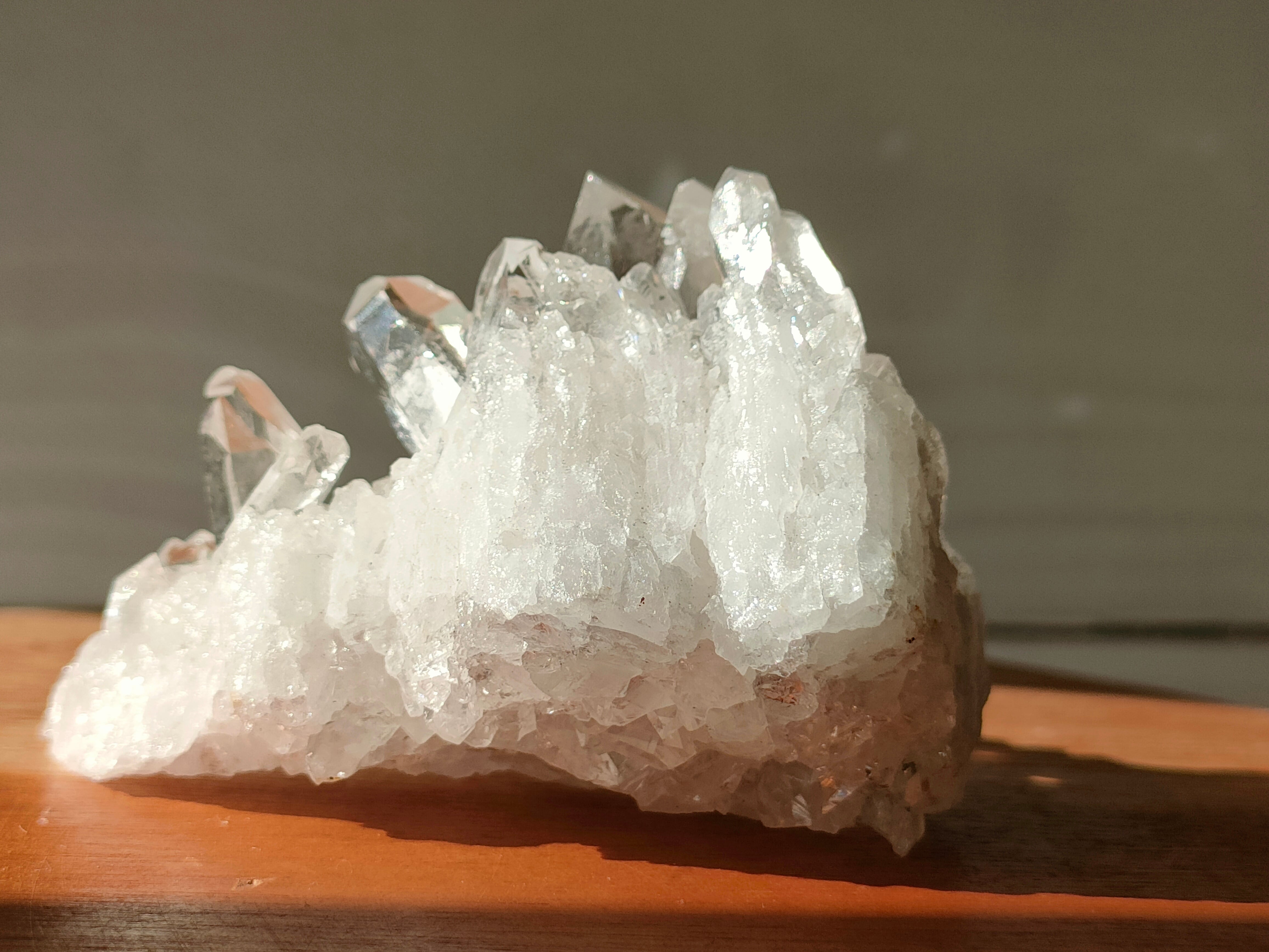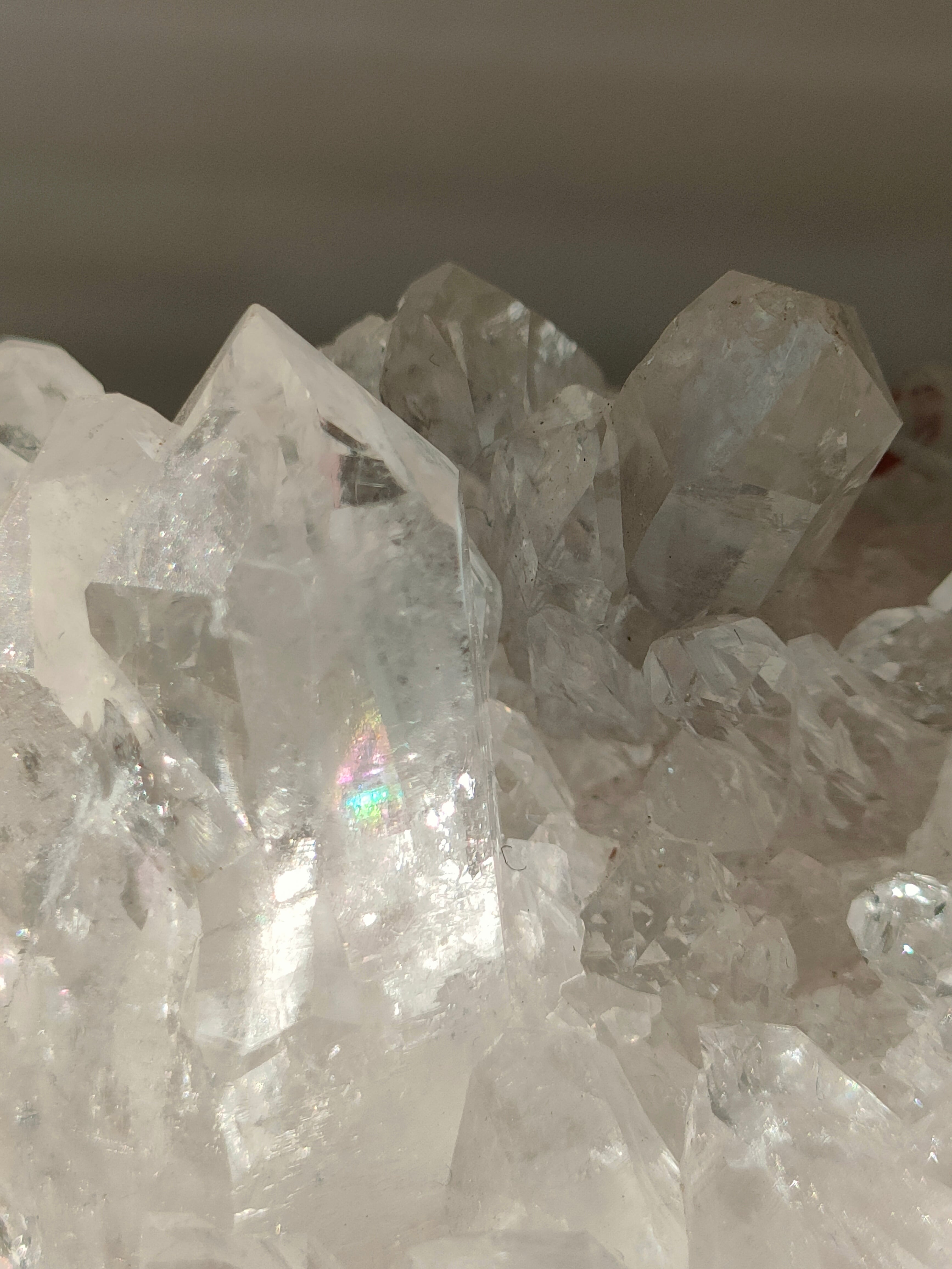 大きめの柱面からは美しい虹がみられます。小さな結晶たちがひしめき合っている姿は「自然の美!」そこに置くだけで華やかに輝きます。